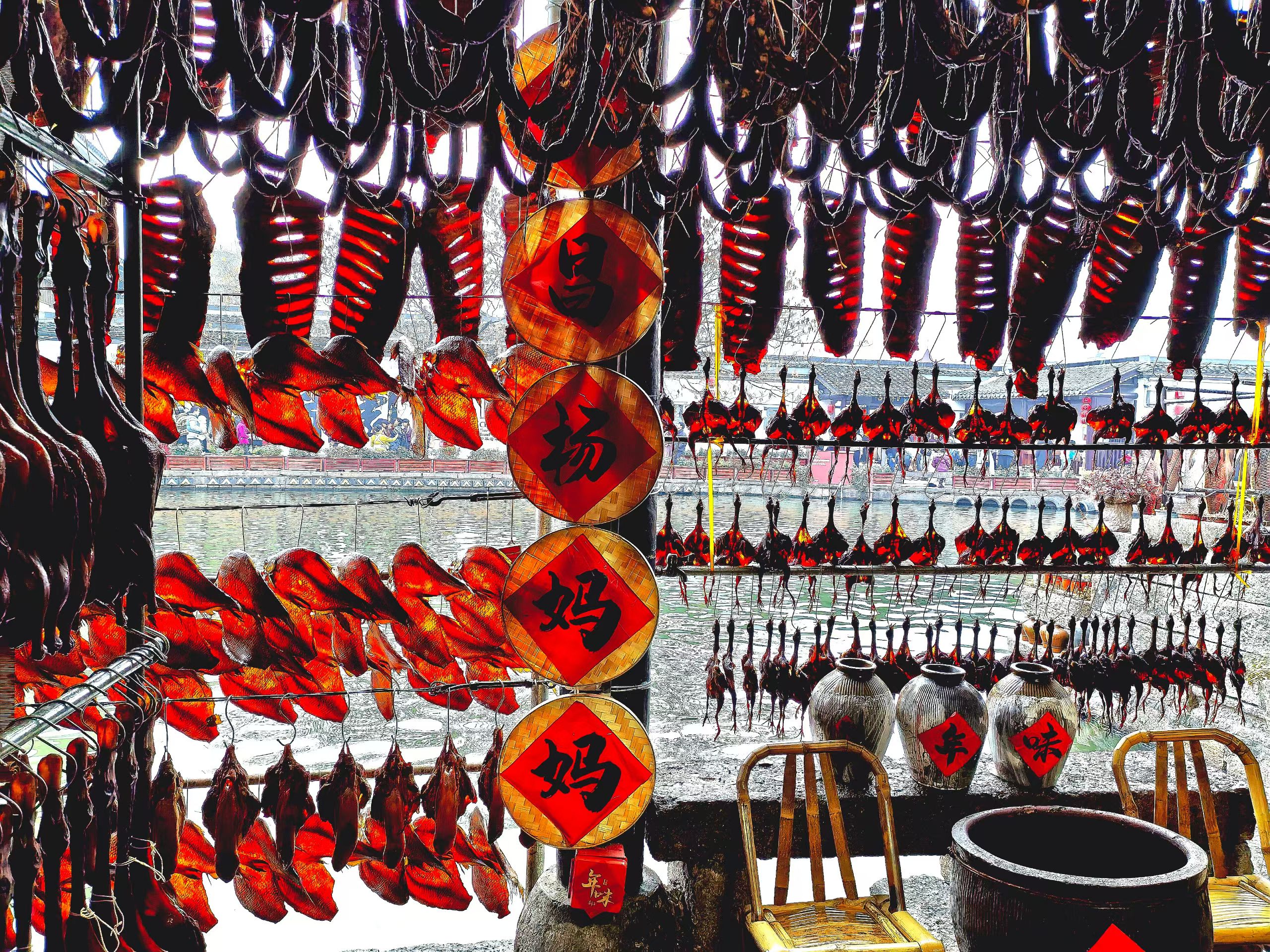 安昌古镇,水乡年味。临河的屋檐下挂满了酱鸭、腊肠和鱼干,油亮的色泽在阳光下泛着光,连风里都飘着酱香。
