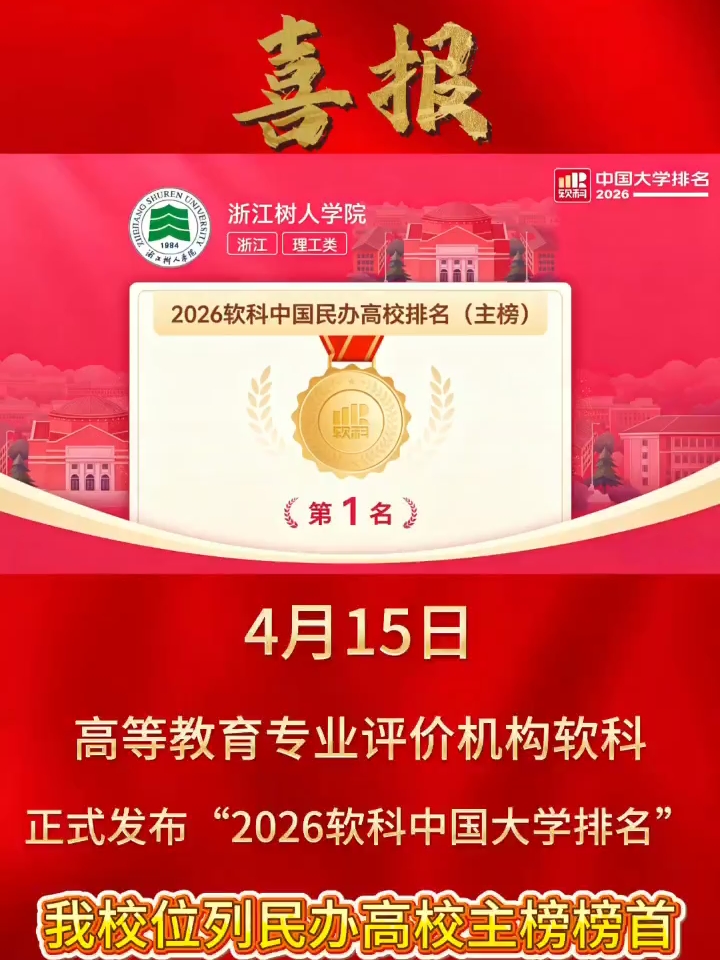 热烈祝贺浙江树人学院位列软科民办高校主榜榜首