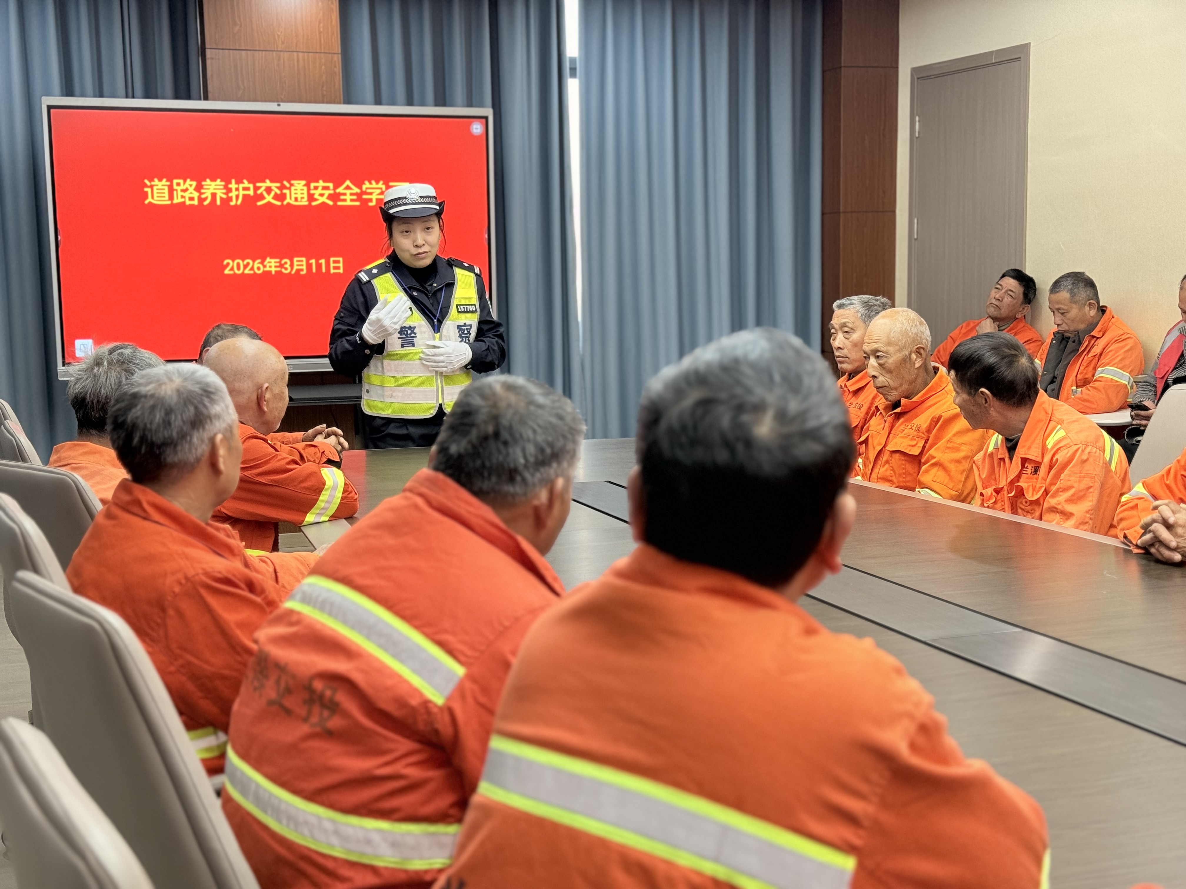 安全作业,平安归家 通讯员:董剑浩 3月11日下午,兰溪市公安局交通管理大队紧扣春季道路养护作业高峰,为一线道路养护人员开展专项交通安全宣传。民警结合涉养护作业典型事故案例,围绕警示标志规范布设、反光防护装备穿戴、车辆盲区规避、恶劣天气作业防护等核心要点细致讲解,反复叮嘱作业人员严守作业流程,牢记“被看见才安全”准则,筑牢路面作业安全防线。兰溪交警提醒:路面作业请落实全流程防护,安全防护不松懈!安全作业,平安回家。