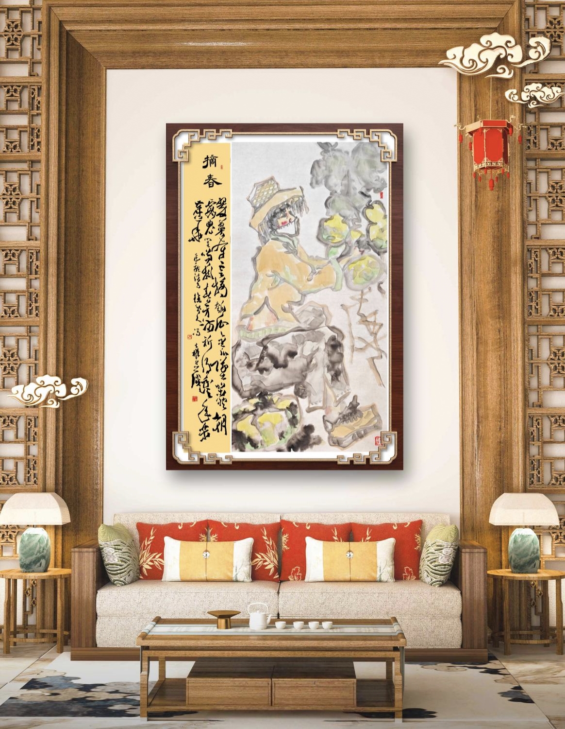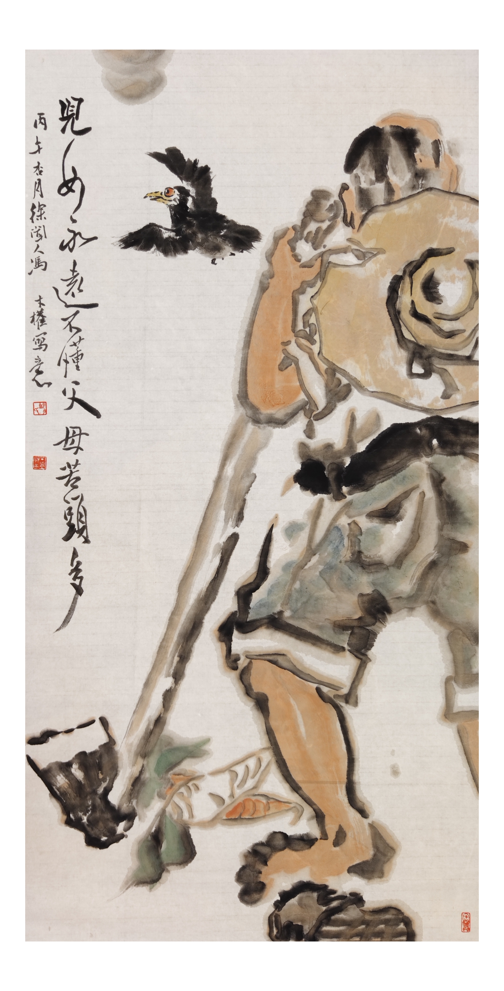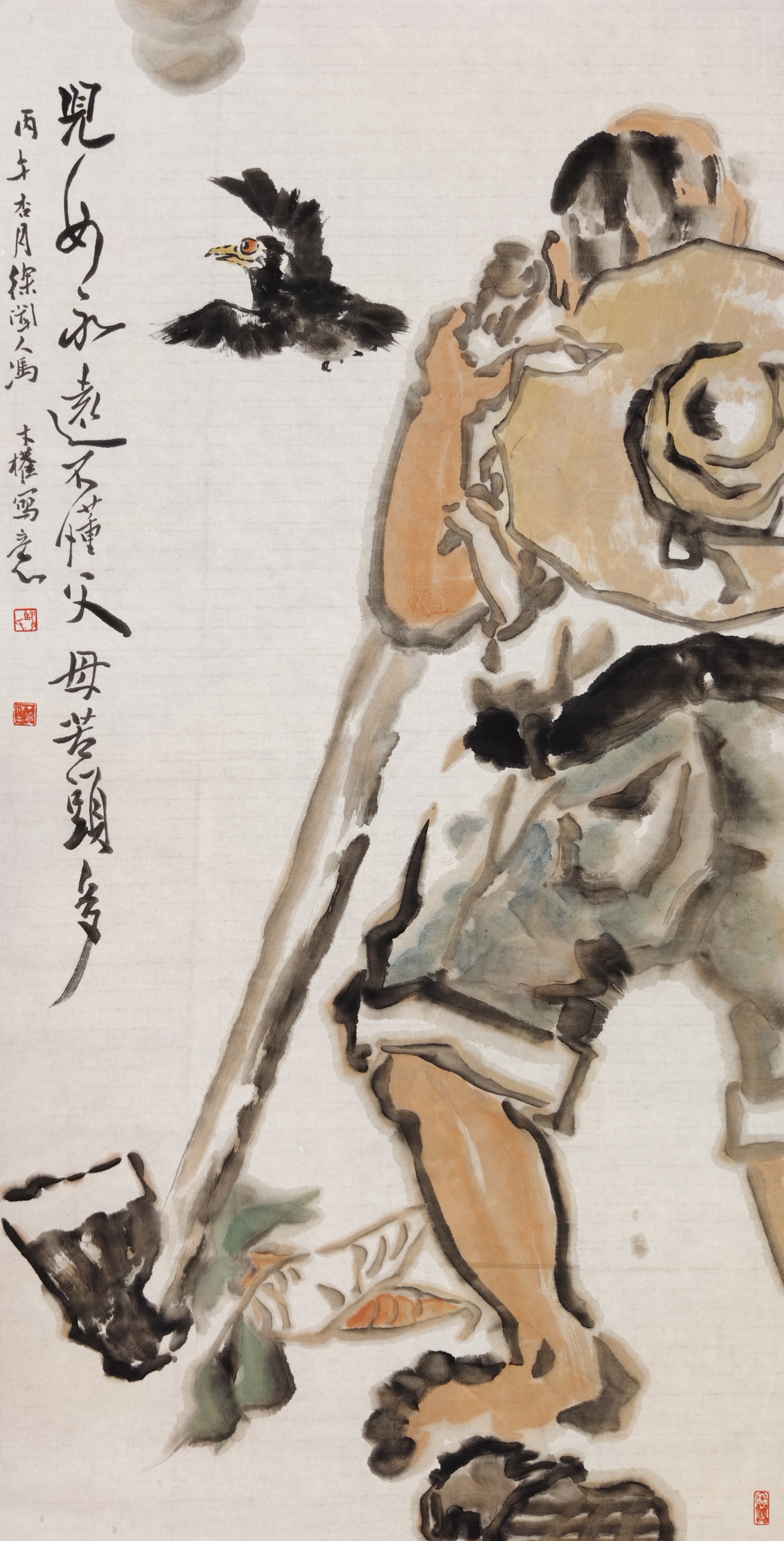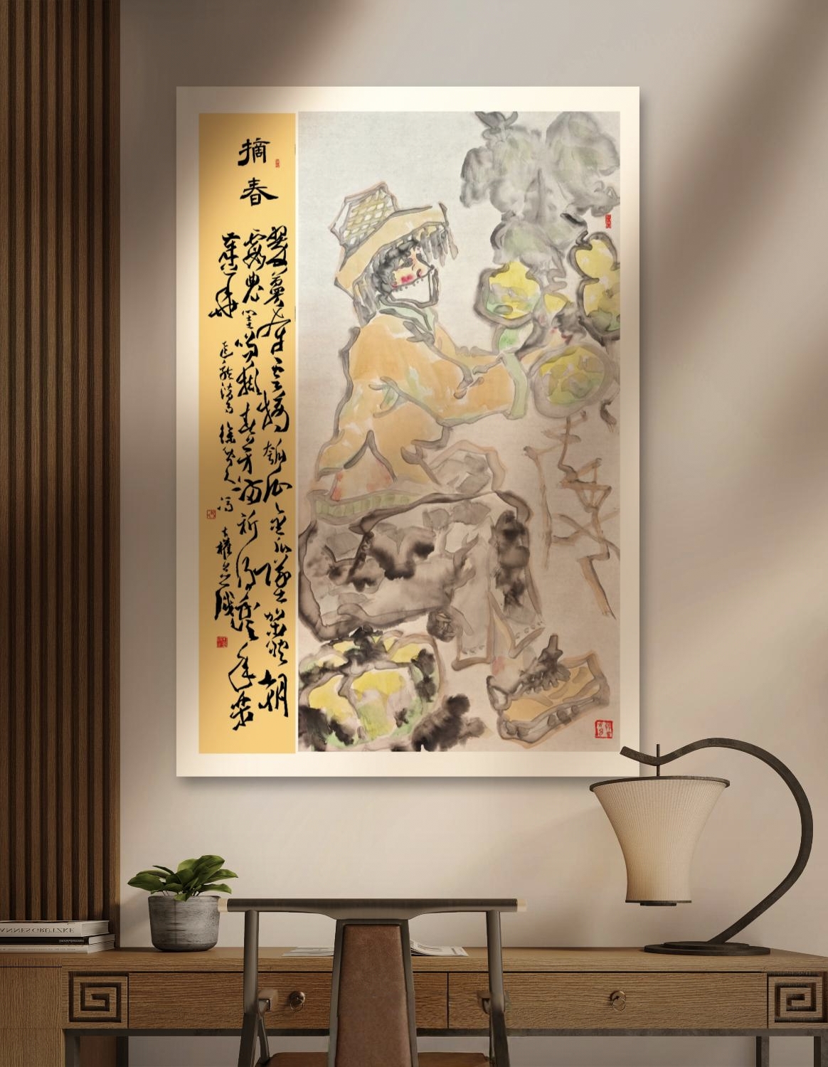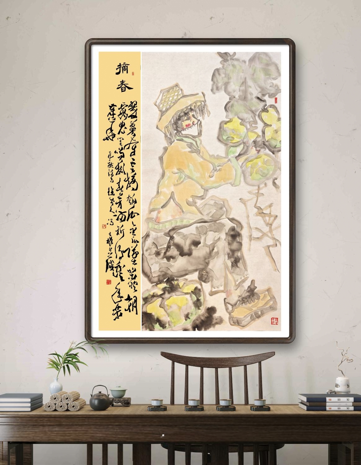 近段,我于“八小时之外”与笔墨对话之暇,常以葫芦、南瓜入画。涂毕,“亲近大自然”及“生机盎然”的萌动,总会有沁人心脾之感! 此作的入画女性,乃我于路边擦肩而过的“原型”,其穿着、气质,充满春潮带雨的愿景! 皴擦、勾勒、点染、设色之后,我灵感一来,便配自作诗《摘春》:翠蔓牵云摘瓠瓜,金瓜坠架映朝霞。农闺笑撷春芳满,祈得丰年乐岁华。以隶书、行草书就,钤印完成,略觉自然舒心,特行文留记,是为一娱也! ——2025年11月25日上午8:57冯才权谨记