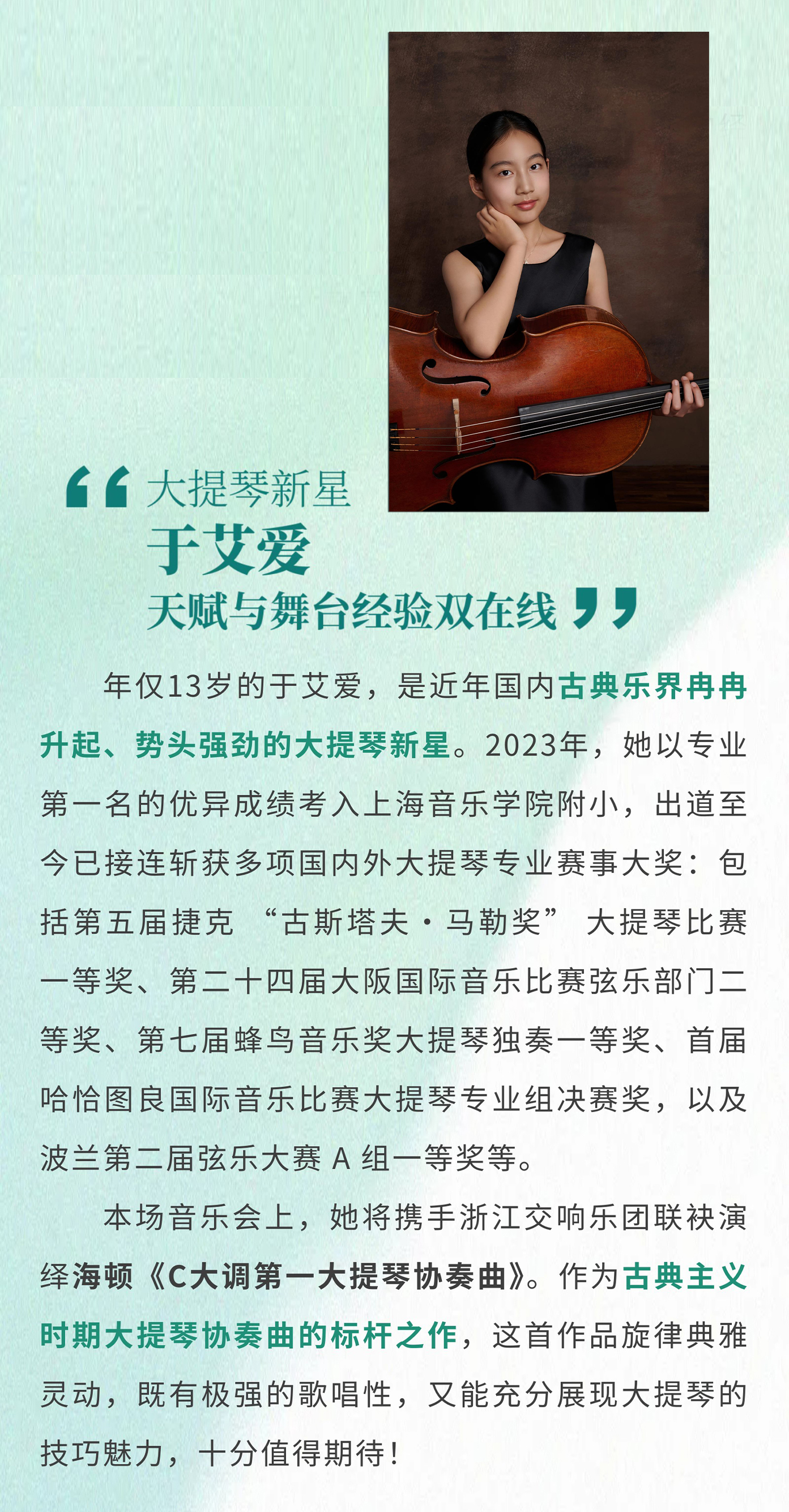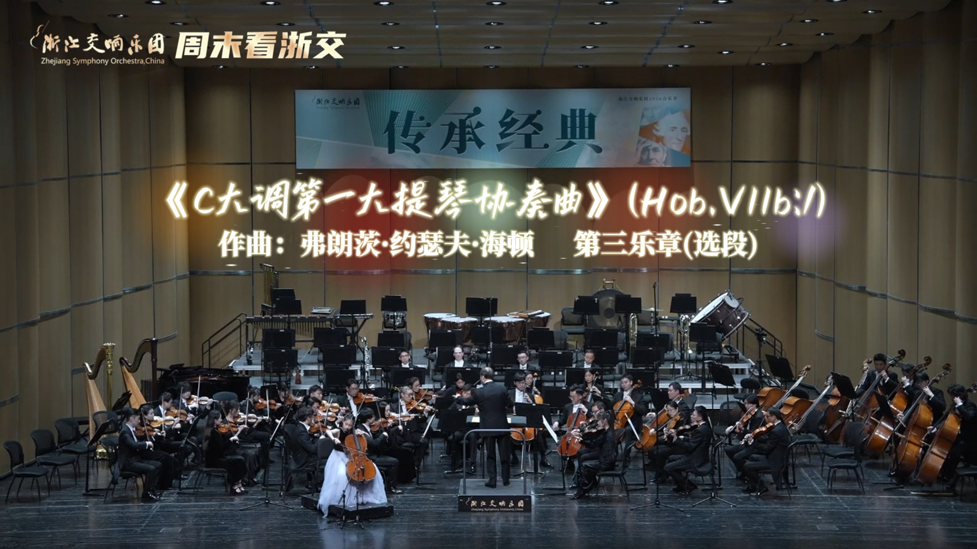 周末看什么?周末看浙交 在"传承经典”2026音乐季专场音乐会上,浙江交响乐团携手著名指挥家张国勇、大提琴新秀于艾爱带来维也纳古典乐派大提琴协奏曲的经典典范--海顿《C大调第一大提琴协奏曲》(Hob.VIIb:1)于艾爱的演奏展示出超越她青涩年纪的沉稳细腻,琴声温润而富有色彩(视频为第三乐章选段)