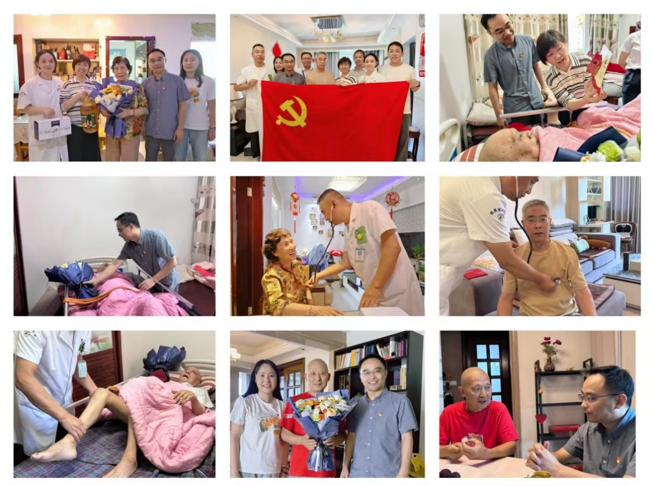 【党建送温情】今日上午,九堡中心党支部携手党建共建结对单位杭州市城东医院,走进景蓝社区开展 "七一" 主题慰问活动。工作人员不仅为社区内生活困难的老党员送去关怀问候,更特别组织中医专家提供 "健康服务上门" 指导,针对夏季养生、慢性病调理等方面给予专业建议。景蓝社区党支部书记王佳佳感慨道:"尽管夏日酷暑难耐,但老党员们收到这份心意时,眼里的光热比天气更炽热。" 此次活动既让老党员们感受到组织的温暖关怀,也通过医疗资源下沉的形式,将党建服务切实融入民生场景,用实际行动诠释了红色初心的时代温度。来自景蓝社区的老党员们也纷纷表示,蓝桥站也为他们提供了便捷、贴心的医疗服务。 【七一慰问】今日下午,九堡中心党支部书记带队探望老院长凌红峰,送上节日问候与组织关怀。陈书记向老同志详细介绍中心近期发展近况,悉心询问其身体状况与治疗进展,让老职工深切感受到九卫大家庭的温暖,在传递组织关爱的同时,也让红色初心在代际传承中焕发光彩。
