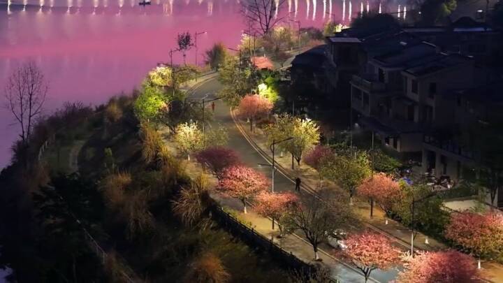清晨的峡江路,蓝调未尽,日光已暖,一河海棠一岸春。(记者:高于)