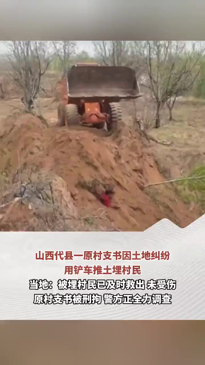 山西代县一原村支书因土地纠纷用铲车推土埋村民,当地:被埋村民已及时救出,未受伤,原村支书被刑拘,警方正全力调查