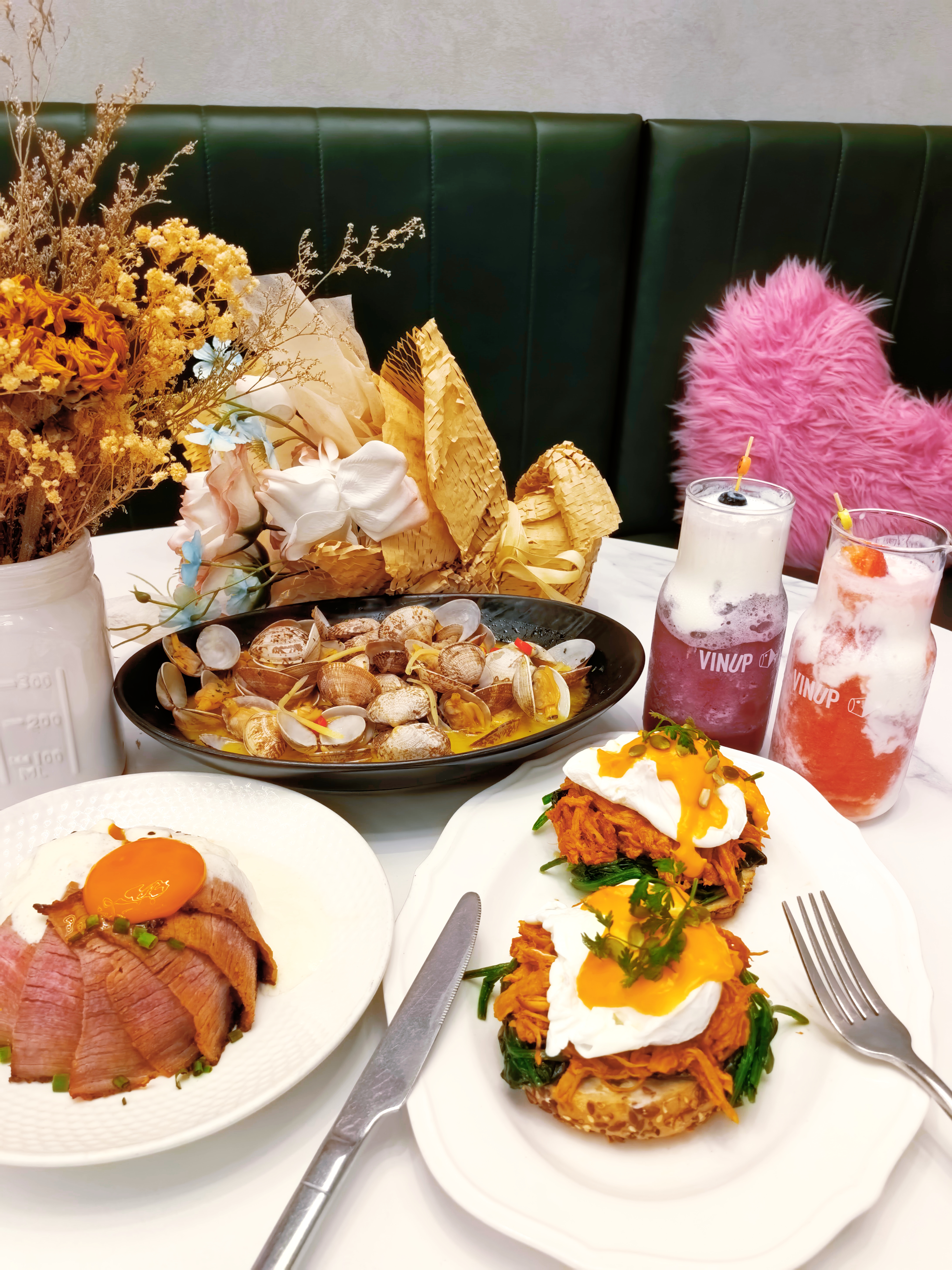 周末微醺早午餐🌿和闺蜜在阳光里小酌一杯 Vinup薇葡·虹口瑞虹月亮湾 走进来仿佛掉进南法小酒馆🍷 满墙葡萄酒柜+暖调灯光 周末中午人不多 舒服又安静✨ ✔️雪顶熔岩牛排饭 造型像火山🌋 奶香酱汁裹着嫩牛排和米饭 戳开瞬间食欲拉满 ✔️德州烟熏贝果班尼迪克蛋 流心的班尼迪克蛋搭配烟熏鸡肉 贝果韧韧的 菠菜清口 阳光下的完美brunch搭配💛 ✔️法式白酒煮蛤蜊 白葡萄酒的香气好迷人 蛤蜊肉质饱满 汤汁都想喝光 ✔️无花果香草冰淇淋拿破仑 酥皮超级脆! 冰淇淋+无花果的搭配很妙 甜而不腻 收尾幸福度💯 ✔️草莓/蓝莓云顶卡士 绵密奶盖像云朵一样 下层酸甜清爽 捧在手里好治愈~ 和闺蜜在这里慢慢吃聊聊天 偶尔小酌一口葡萄酒 周末就该这样温柔度过呀🌤