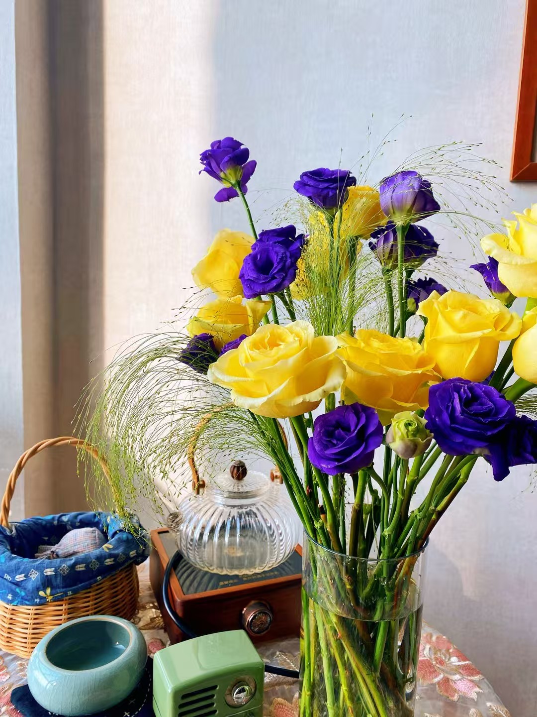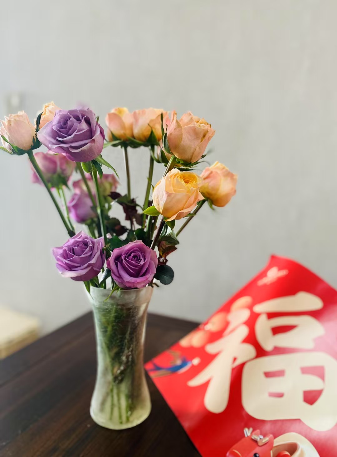 #年味淡了吗?#过年让鲜花装扮家庭,窗边光刚好,紫玫瑰配黄橙玫瑰,粉蝴蝶兰探头~玻璃瓶里盛着春意,竹篮、福字、老收音机静静守岁。一桌一景,中式温柔撞上现代呼吸,年味儿,就藏在这口自然光里呀 🌸