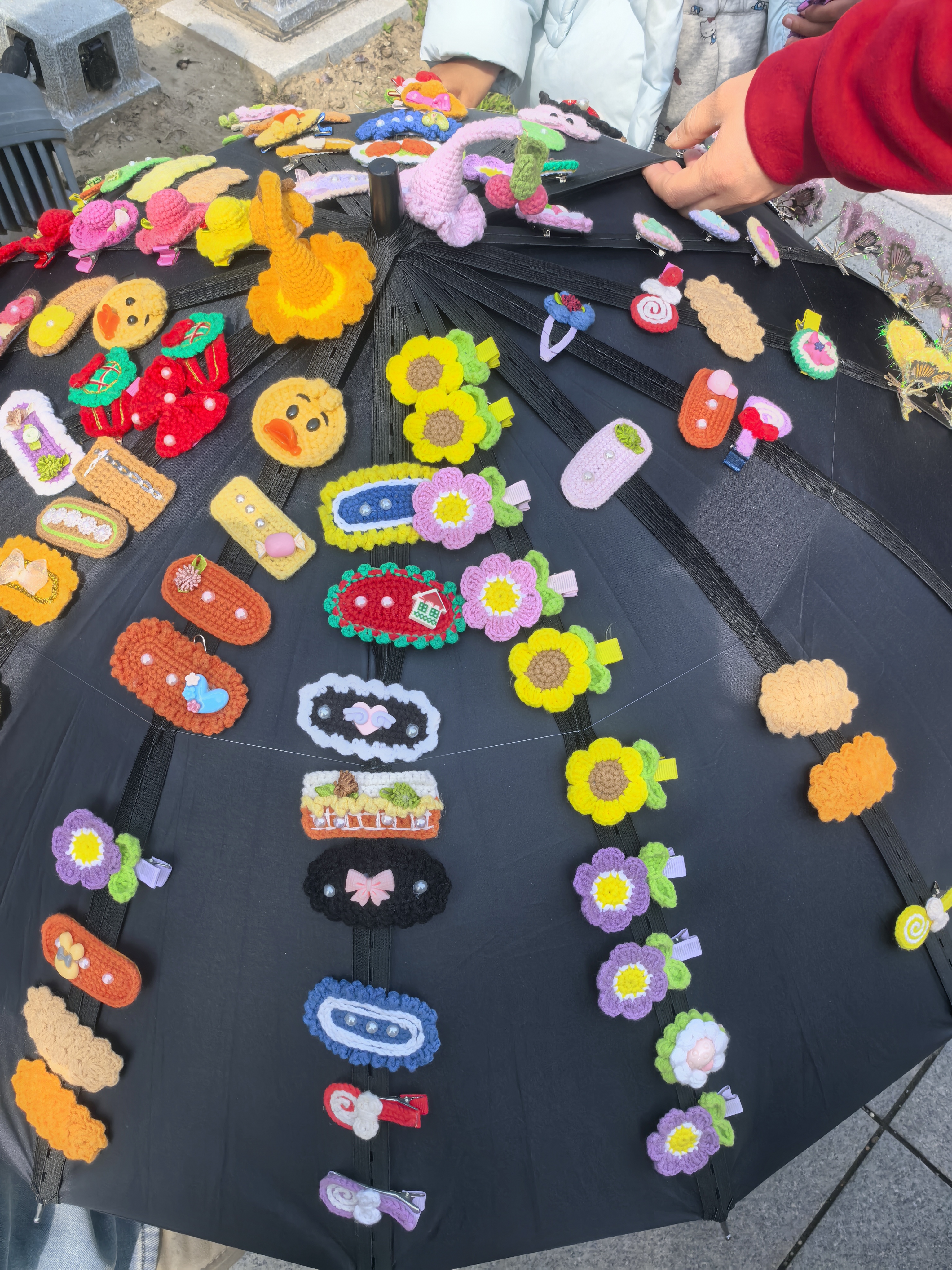 雨伞斜靠木椅,市集摊位上毛线小鸭、草莓发夹、寿司头箍排排坐~阳光一照,波点与花边都在发光。手作的可爱,从来不用等节日才上线 🌞