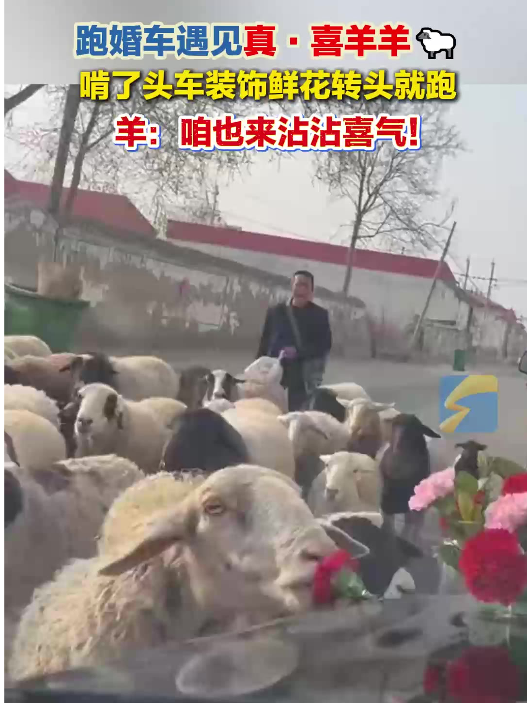 跑婚车遇见真·喜羊羊 啃了头车装饰鲜花转头就跑 羊:咱也来沾沾喜气!