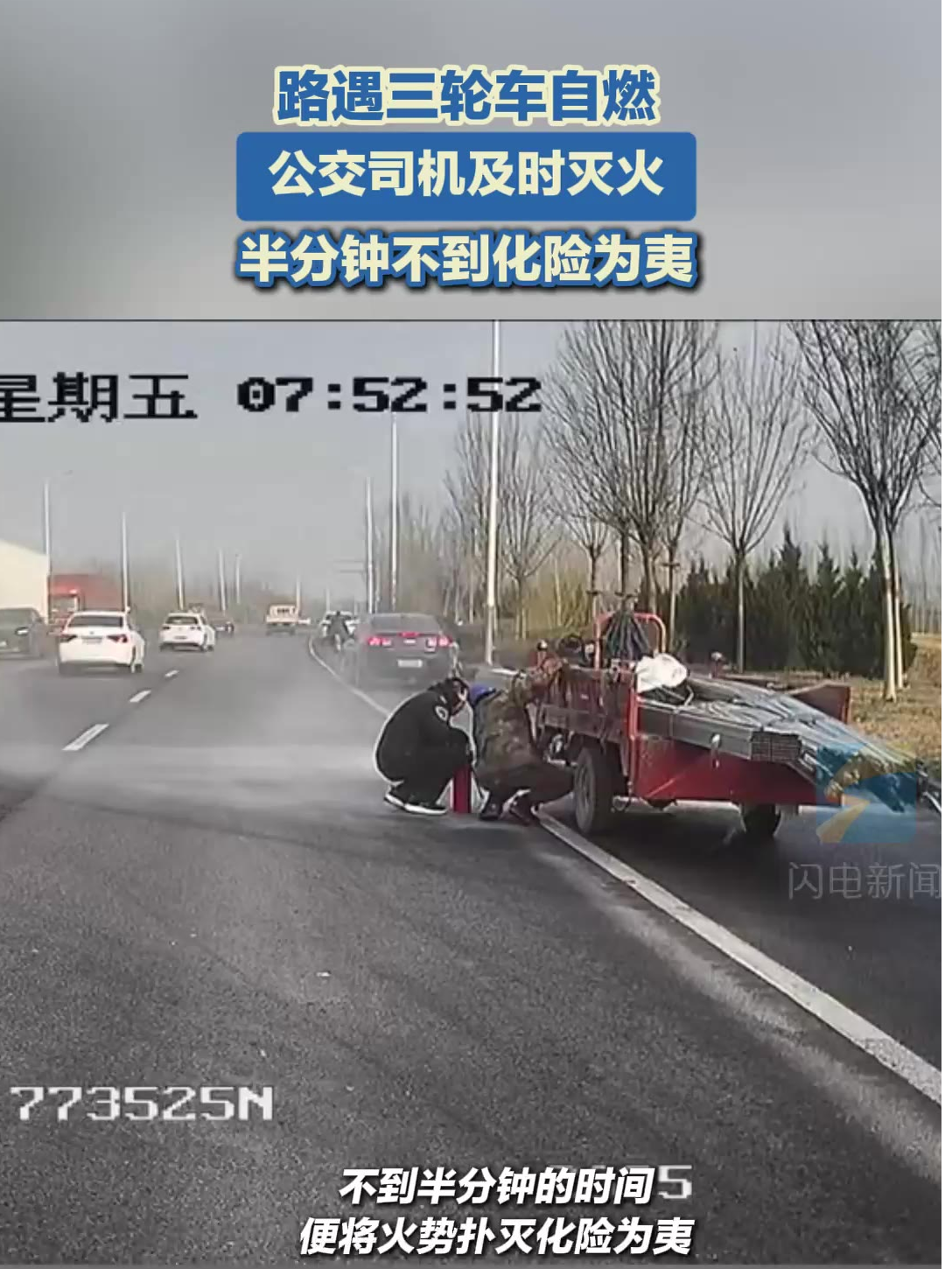 路遇三轮车自燃 公交司机及时灭火 不到半分钟化险为夷.