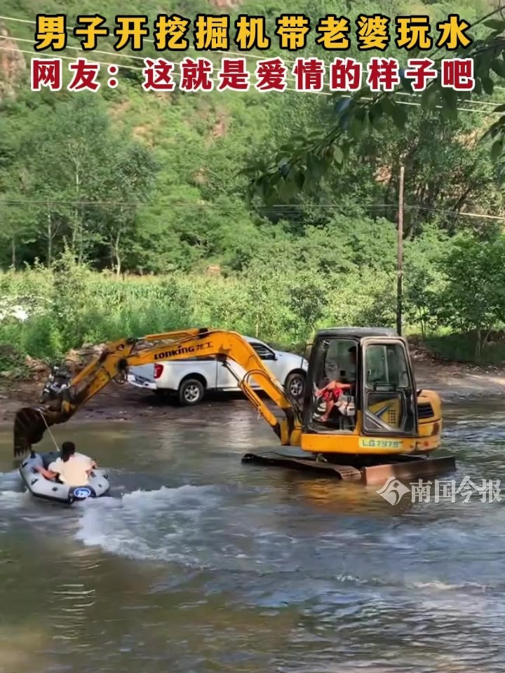 男子开挖掘机带老婆玩水,网友:这就是爱情的样子吧
