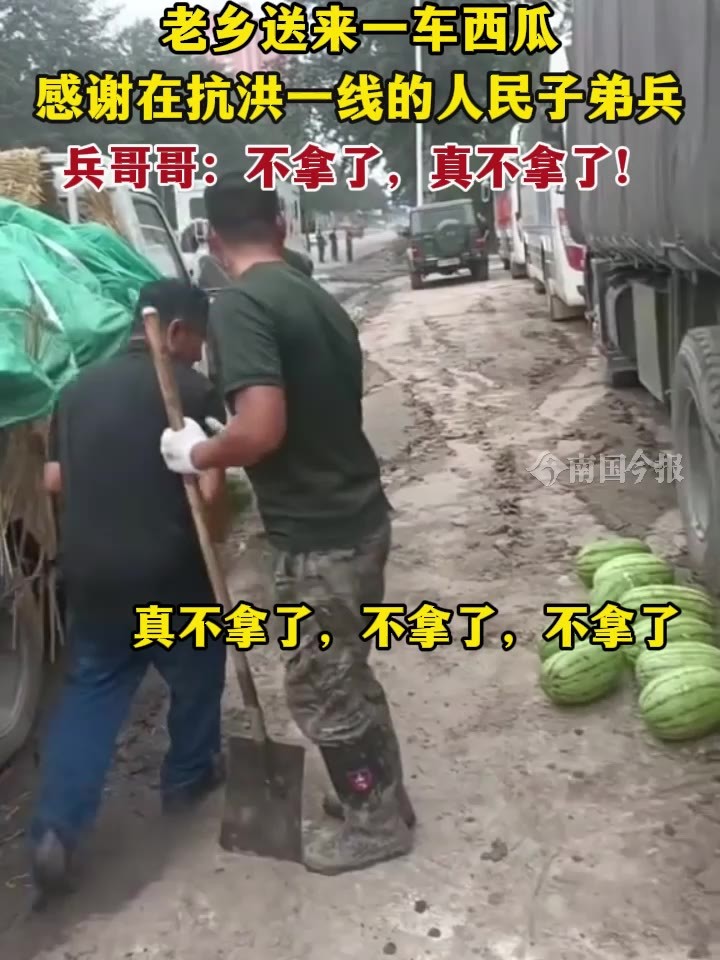 老乡送来一车西瓜,感谢在抗洪一线的人民子弟兵兵。兵哥哥:不拿了,真不拿了!