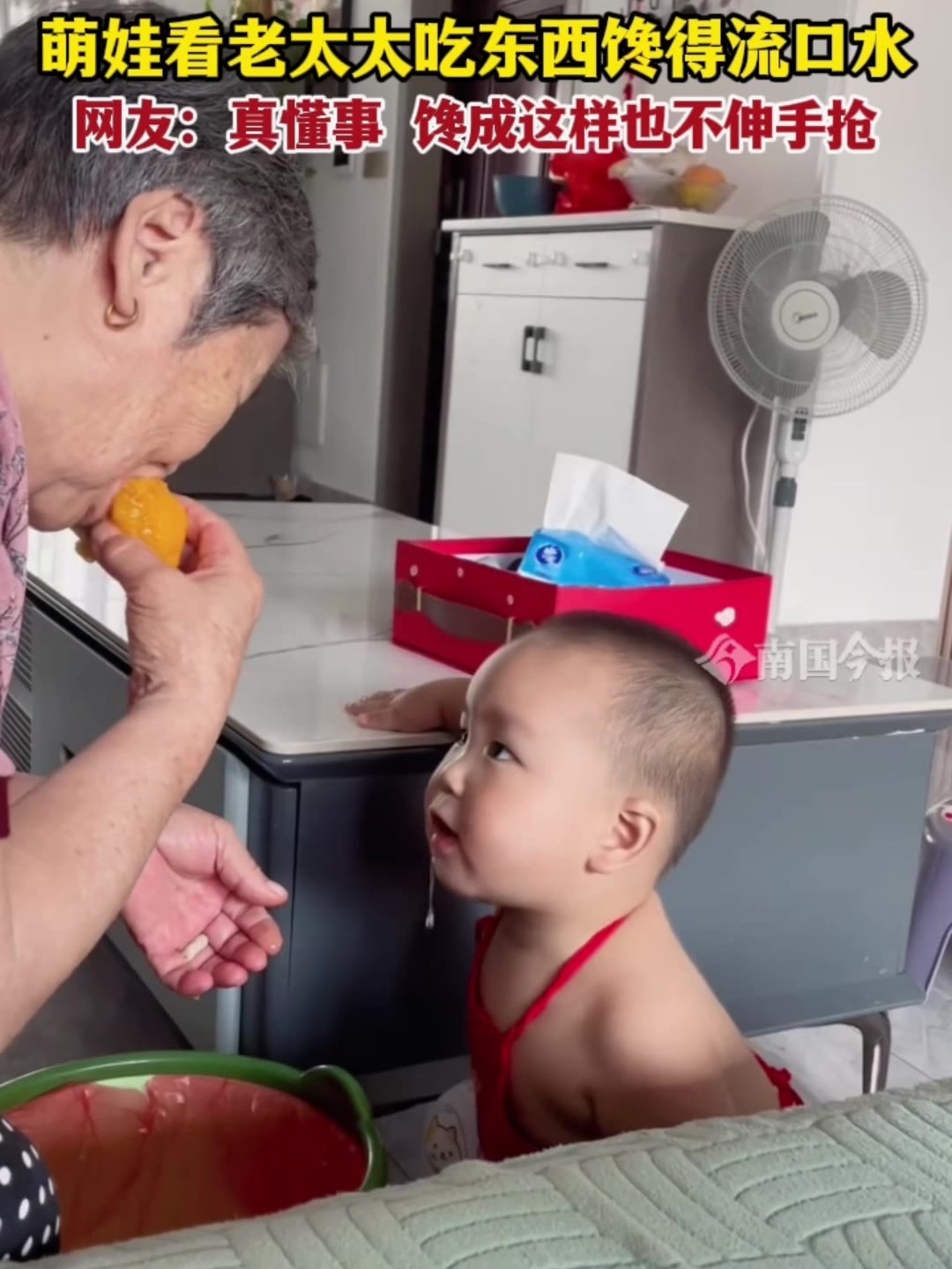 萌娃看老太太吃东西馋得流口水,网友:真懂事!馋成这样也不伸手抢抢