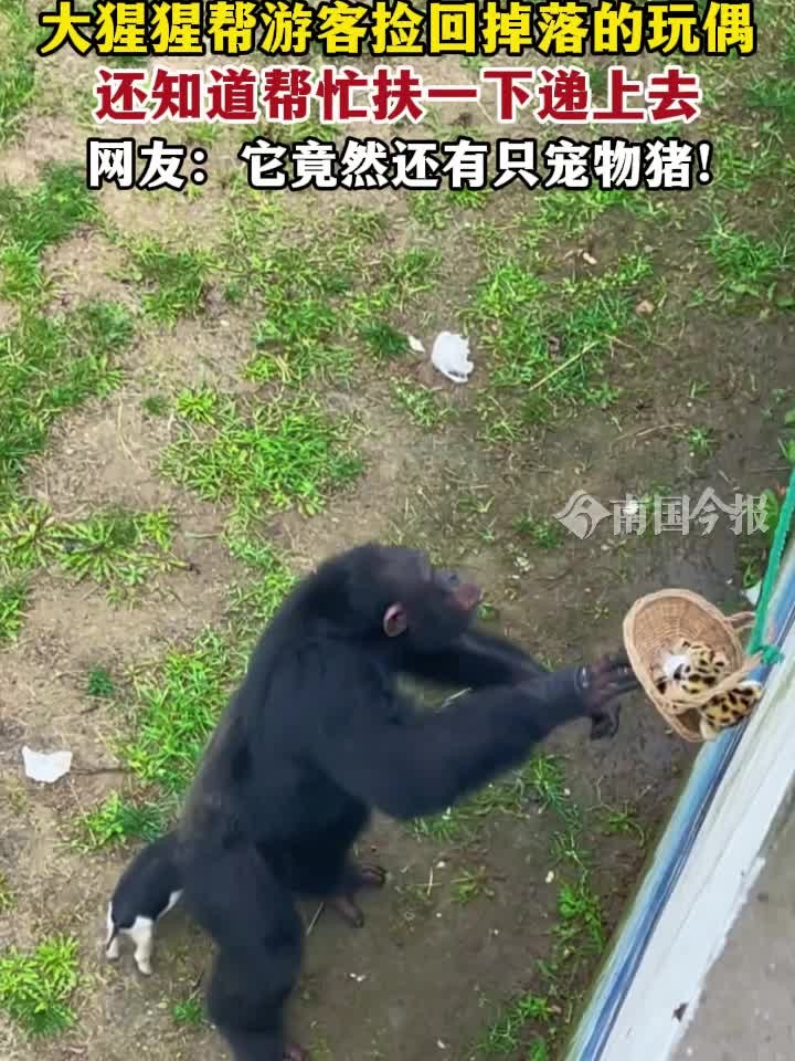 大猩猩帮游客捡回掉落的玩偶,还知道帮忙扶一下递上去……网友:它竟然还有只宠物猪!