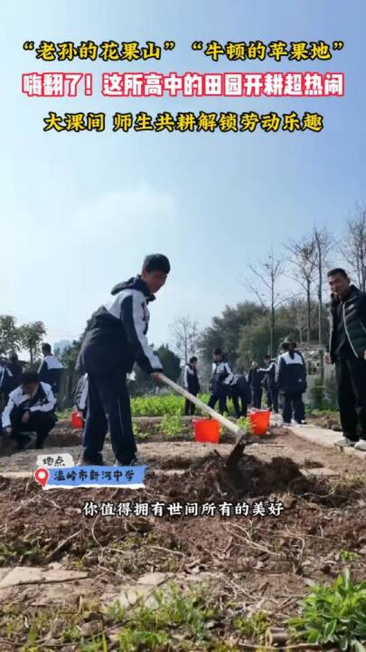 “浙”里娃劳动忙,在温岭市新河中学,每周三的大课间是体劳结合的劳动实践时间,“老孙的花果山”“牛顿的苹果地”嗨翻了!六十多块田园内一片热闹繁忙景象,学校师生共同劳动,乐在其中。