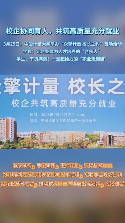 3月25日,中国计量大学“众擎计量、校长之约”首场活动成功举办。企业人事经理、招聘总监现场坐镇,校企联动,共商产教融合,共促人才培养,共筑高质量充分就业。“浙”些举措促就业