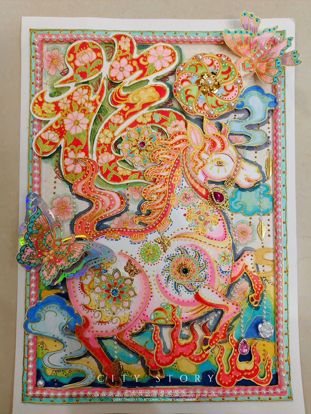 马上有福,珐琅彩福马 把“福”字和瑞马融在一起,用剪纸堆叠出立体感,每一片花瓣、每一缕马鬃都裹着珐琅彩的光泽,珍珠+宝石贴饰直接把贵气拉满,连云朵都透着软乎乎的仙气~ 粉金配色又甜又贵,蝴蝶翅膀在灯光下一晃像在扑棱翅膀!这哪是画啊,明明是把一整年的好运都封进画里了🥰