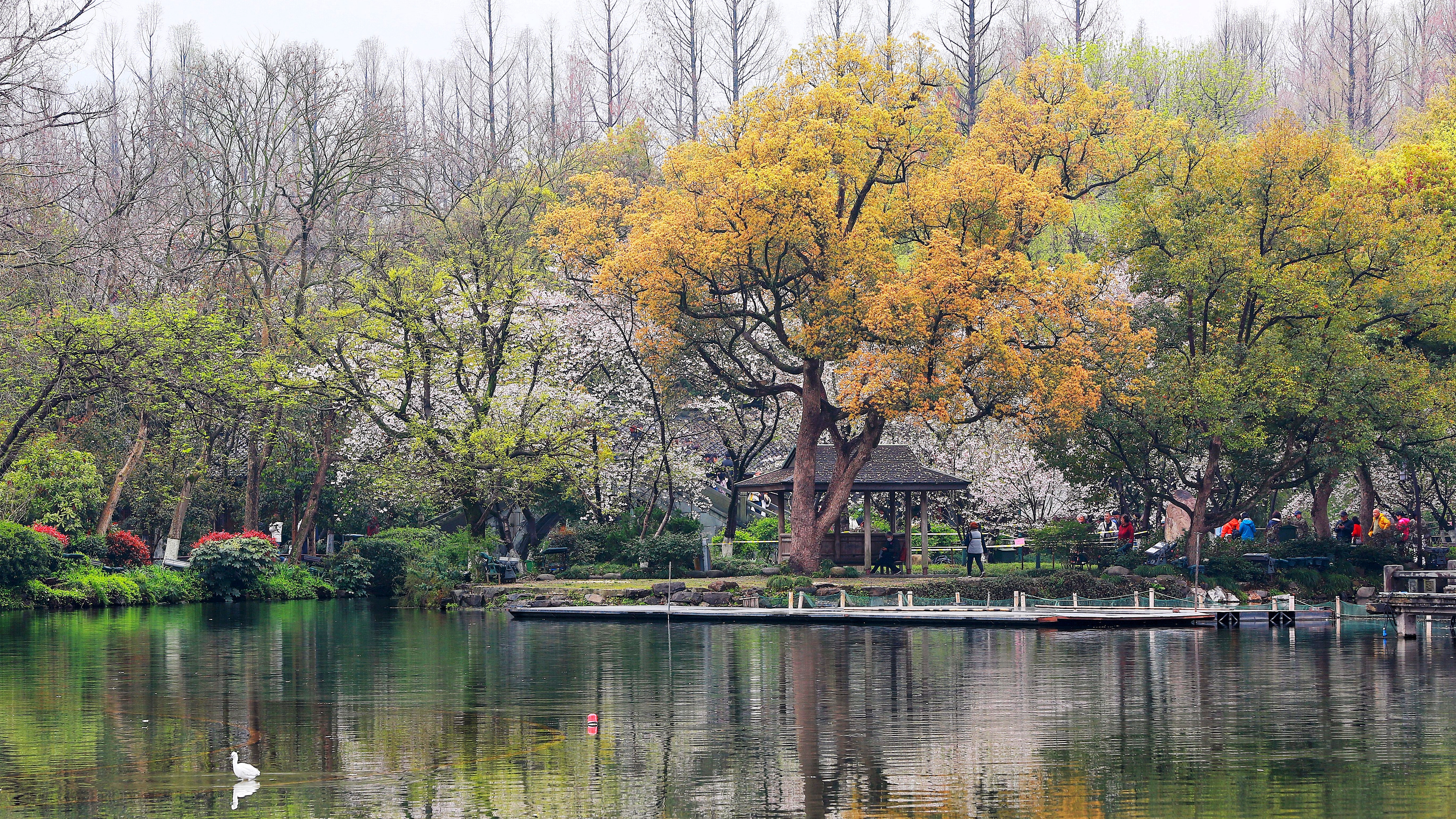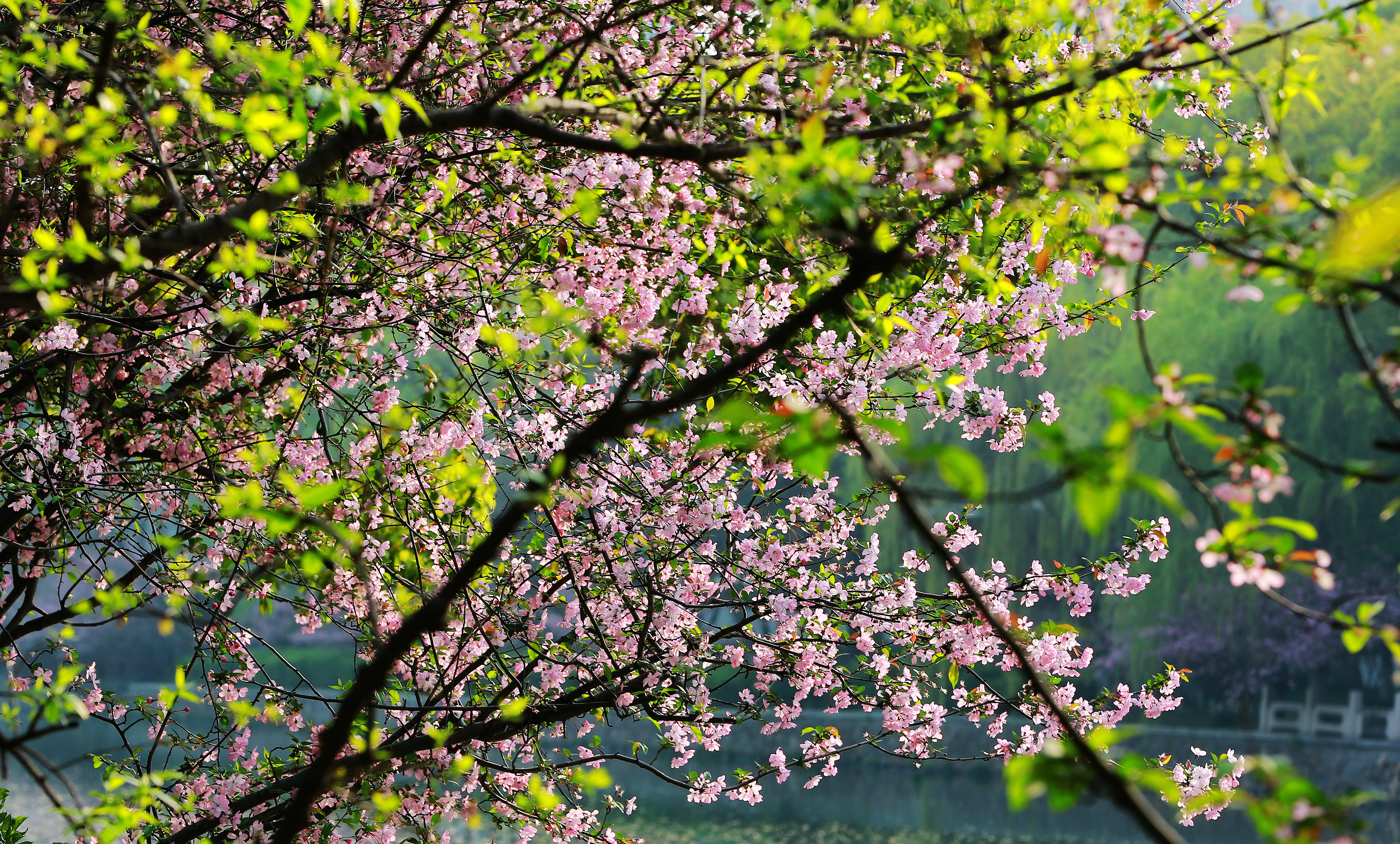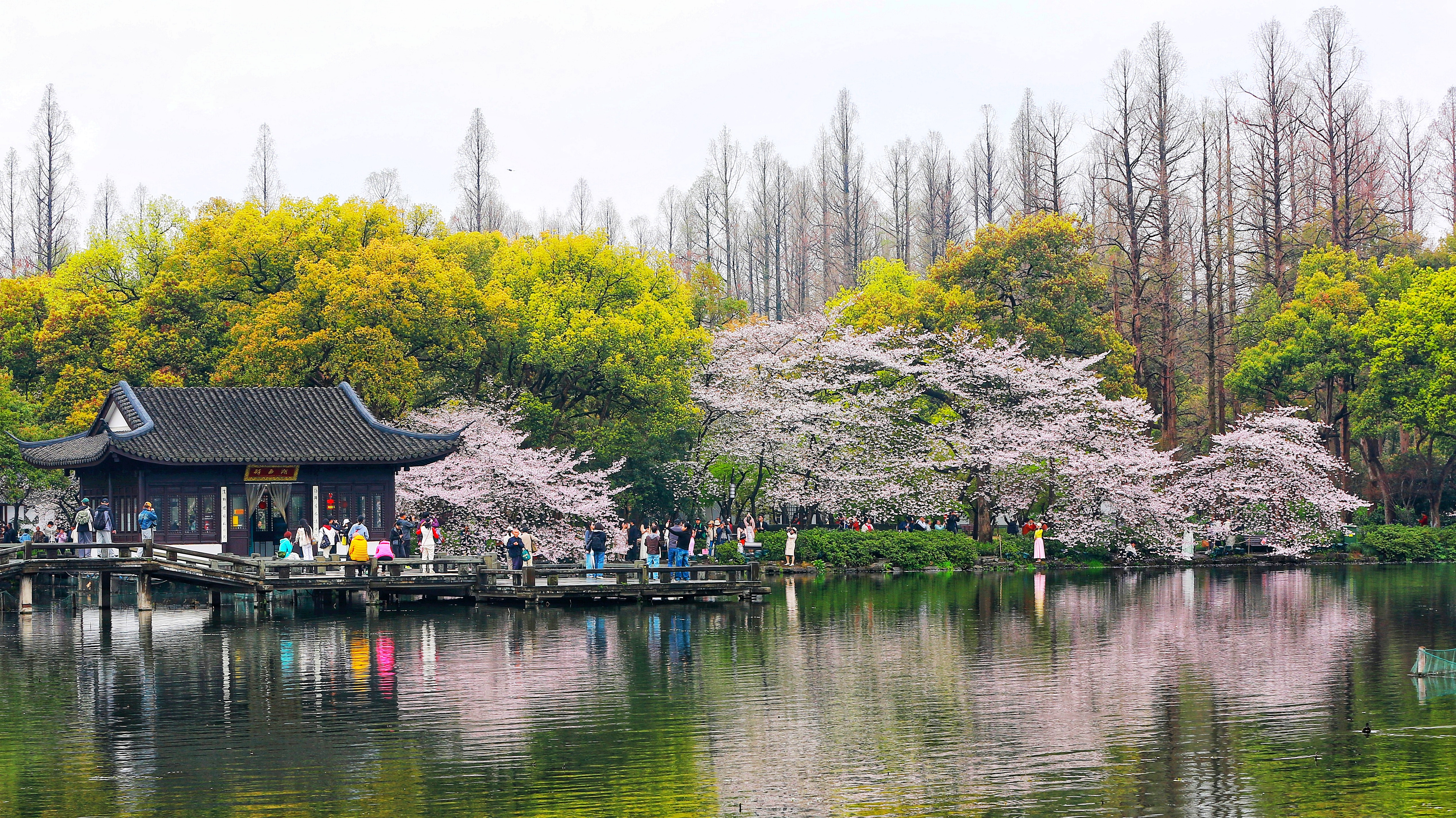 【曲院风荷:樱开正好,春满江南】曲院风荷樱花盛放,春风拂过湖面,涟漪轻漾,落樱纷飞。亭台隐于花影,乌篷船悠然穿行,烟雨朦胧中水色花影相映,尽显江南春日的温婉与诗意。