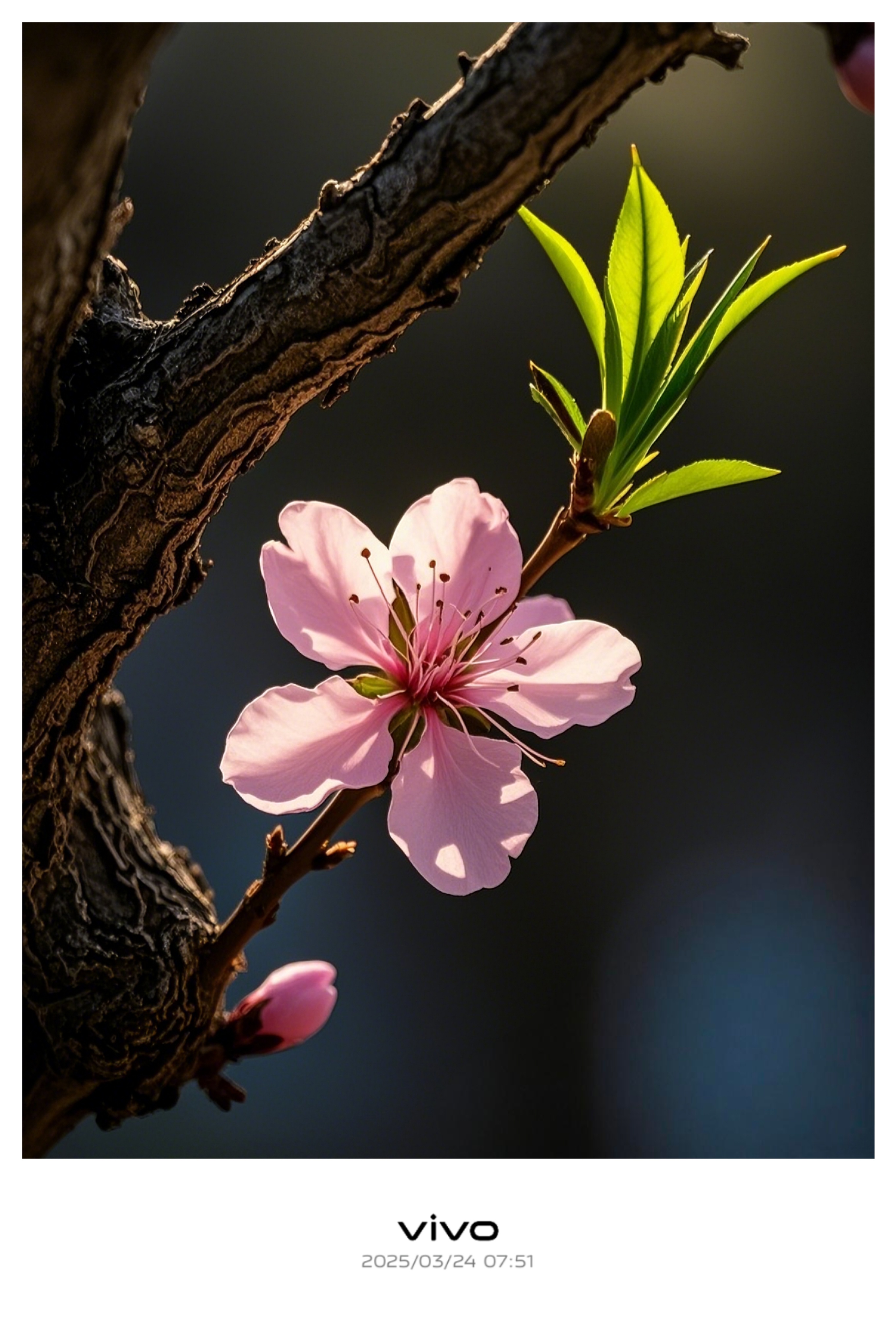 #寻访春天的故事# 《桃枝浅韵》 粗糙的老干,刻着岁月的纹路 。 一朵粉桃,如梦幻的轻语,悄然绽放 。 嫩绿的新叶,似春天的信笺 。 在晨光中, 桃花舒展着柔美的身姿, 那一抹娇俏, 是大自然谱写的灵动诗行 。
