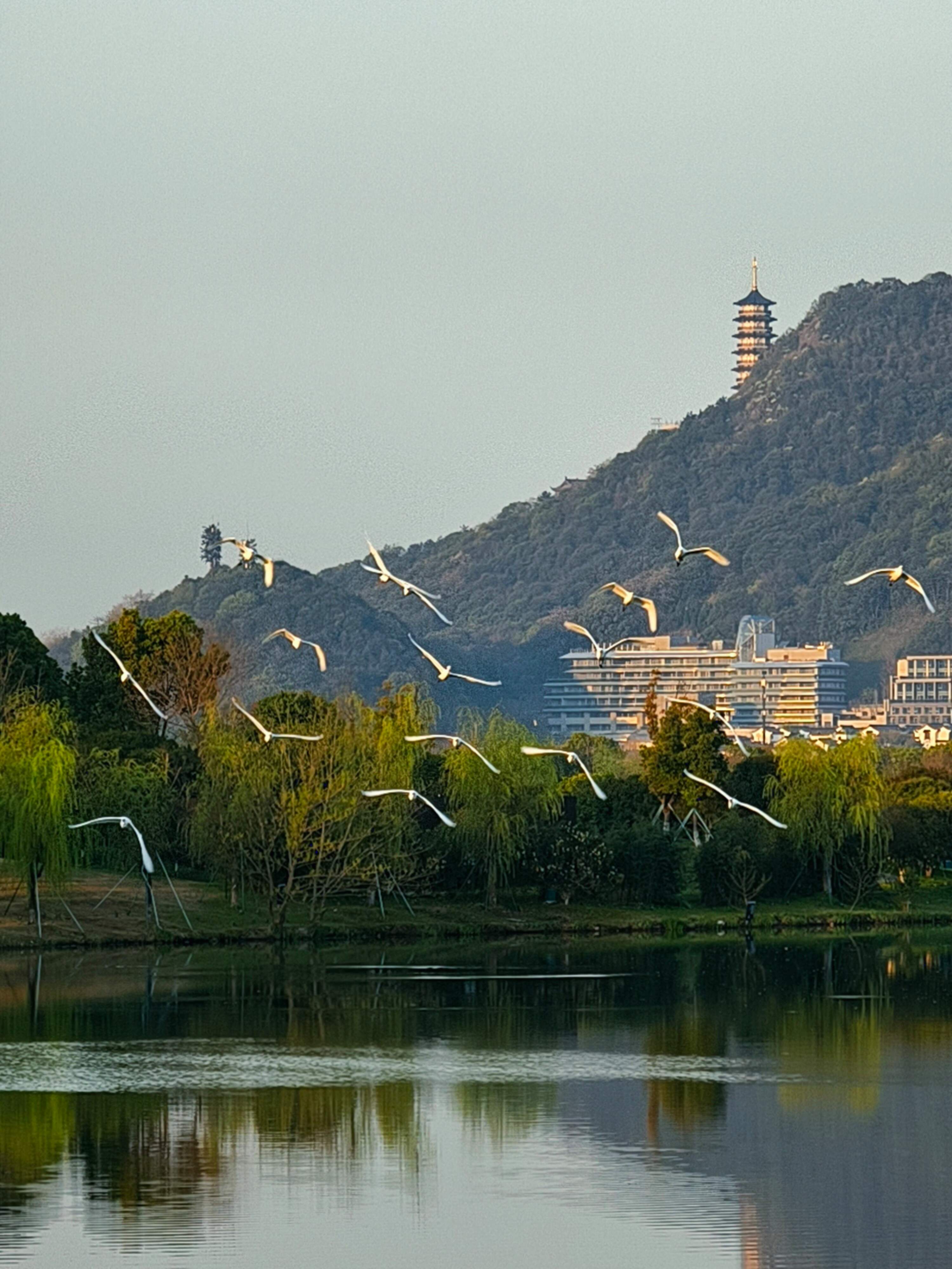 《湘湖逸景》 在湖的镜面上, 天光云影共徘徊 。 白鹭舒展着优雅的弧线, 似灵动的诗行,划破宁静 。 垂柳轻拂,山林如黛, 宝塔与楼宇, 在岁月里静静守望 。 这一隅天地, 是自然与城市的温柔和鸣 。