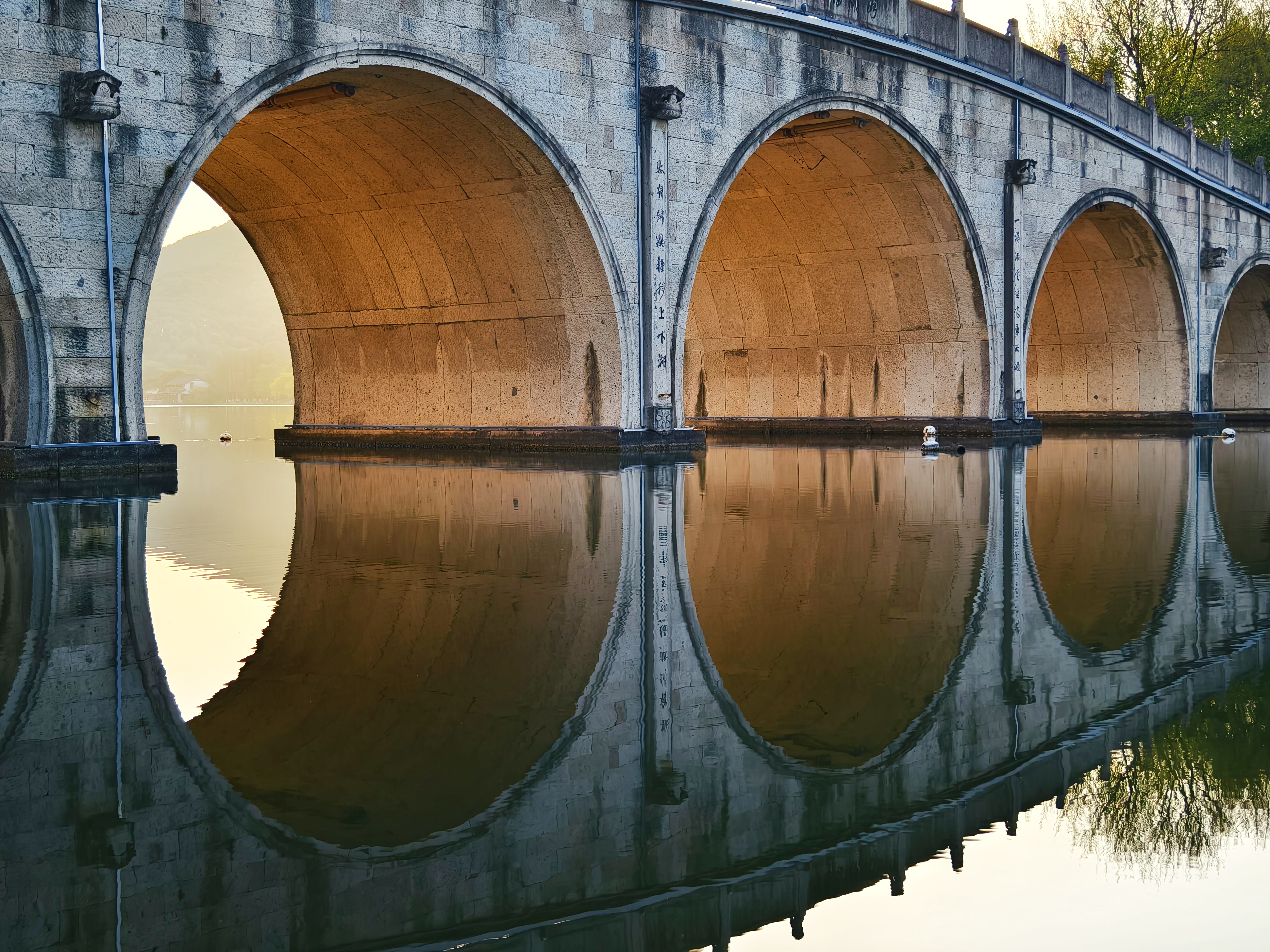 《晨晖中的拱桥》 当第一缕晨光洒落, 古老的石桥从岁月中醒来 。 拱券如时光的眼眸, 凝视着悠悠流水 。 在澄澈的湖面上, 桥与影相拥,自成圆满 。 那斑驳的石纹, 诉说着往昔的故事, 于宁静中,流淌着无尽的诗意 。