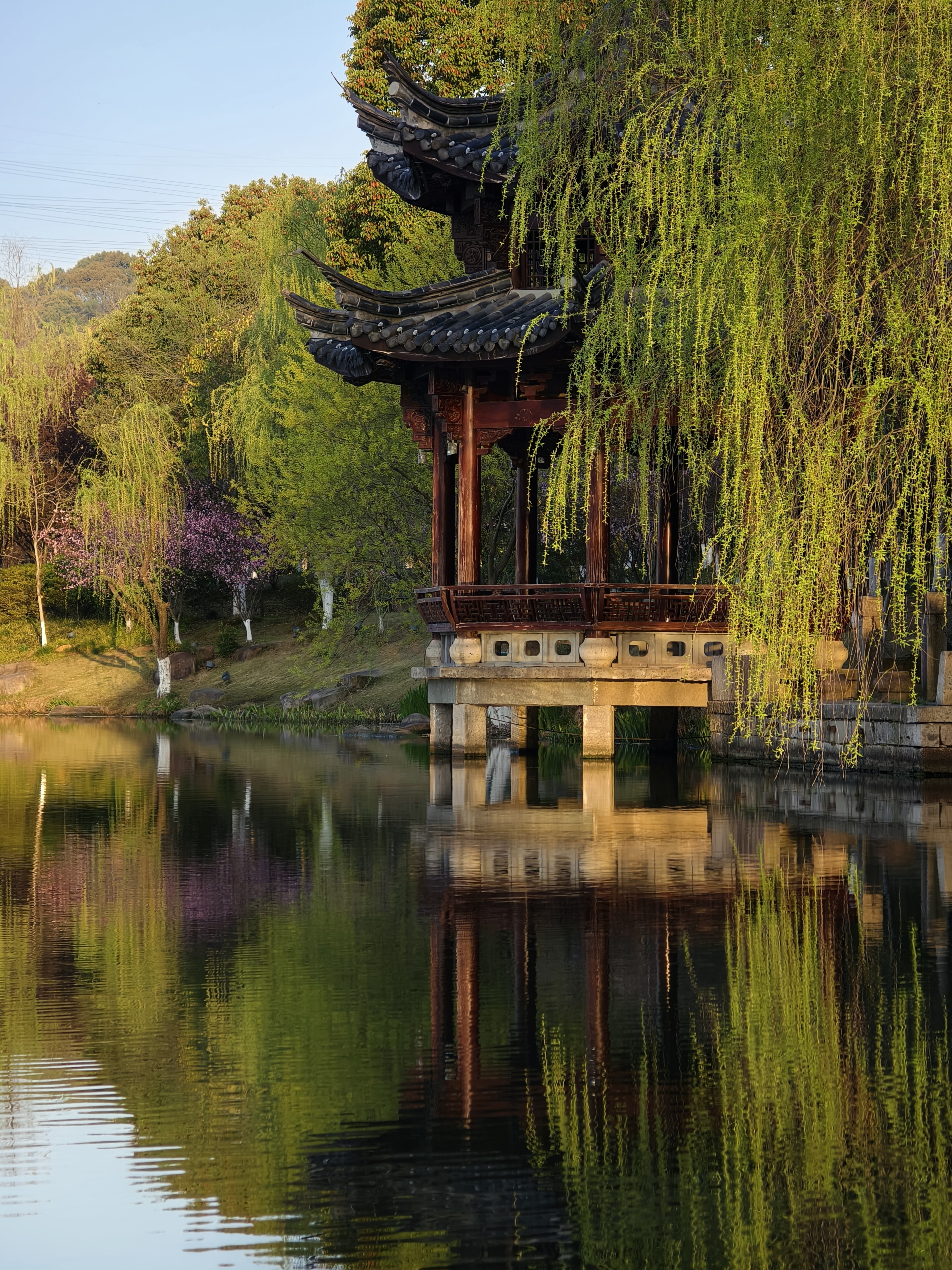 《湖畔幽韵》 在湘湖之畔, 古亭静立,如一位沉思的智者 。 飞檐翘角,勾勒岁月的轮廓 。 垂柳依依,似绿色的诗笺在风中舒展 。 粉花点缀,为这宁静添一抹灵动 。 湖面如镜,收纳天地的秀色 。 时光,在这里放慢了脚步, 每一寸景致,都诉说着悠悠的江南梦 。