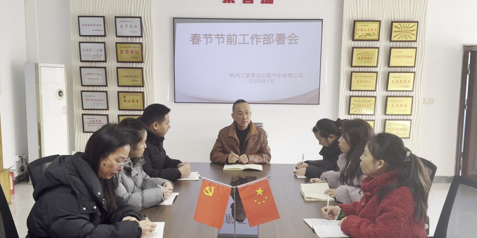 三星客运召开春节节前工作部署会议 春节将至,为切实做好节日期间安全生产和运营服务工作,确保广大市民和游客出行安全,三星客运召开了春节节前工作部署会就春节期间重点工作进行部署。 公司负责人主持会议并强调杭州作为旅游热门城市,机场、火车站、景区等重点区域保障任务繁重,全体员工务必高度重视,严守安全底线,提升服务质量。 一、严守安全底线,全面排查隐患 即日起至节前,完成所有营运车辆制动、灯光、轮胎、灭火器、安全锤、三角架逐项检查,不合格车辆一律停运整改,坚决杜绝病车上路;全员签订春运安全责任书,严禁酒驾、醉驾、毒驾、药驾;连续营运不超4小时,杜绝疲劳驾驶;严禁超速、闯红灯、强行变道、加塞。 二、严管机场、东站违章上客,守住场站红线 萧山机场必须在出租车专用蓄车场、上客点排队候客,服从现场调度;严禁冲卡、站外揽客、喊客、议价、拒载;送客下客即停即走,严禁在非指定区域停留。在火车东站车辆必须进入指定出租车上客点排队候客,严禁在航站楼出发层、到达层出口、车站广场等禁停区域停车揽客,要服从现场管理人员指挥,违者将面临罚款、扣5分处理。 三、严格执行景区限行与定点上下客规定 景区避开灵隐限行路段,统一到上客点上下客;出租车按规定停靠,严禁违停、实线变道、杜绝拒载、诱购、甩客等行为;服从交警与管理人员引导,主动配合接驳疏导,避免造成拥堵;主动告知乘客景区交通管控,推荐合理路线与停车换乘方案,不绕道、不甩客。 四、雨雪天气安全行车专项提醒 出车前检查胎压、防冻液、制动、雨刮;桥梁、高架、涵洞、坡道易结冰,提前减速,不急刹、不猛打方向;安全车距保持平时2-3倍。遇大雾、冰冻、雨雪,降速、控距、亮尾,优先选择主干道;能见度不足立即靠边安全停靠;斑马线礼让行人,路口减速观望,不抢黄灯、不逆行,守护乘客与行人安全。 春节是出行高峰,更是考验我们安全意识、职业素养与城市形象的关键时期。希望全体人员把安全放在第一位,严格遵守机场、东站、景区各项管控要求,规范运营、文明服务,让市民和游客平安出行、舒心过年,共同维护杭州出租车行业良好窗口形象! ..