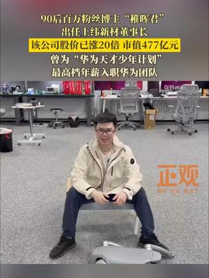 90后百万粉丝博主“稚晖君”出任上纬新材董事长,该公司股价已涨20倍,市值达477亿元。他曾以“华为天才少年计划”最高档年薪入职华为团队