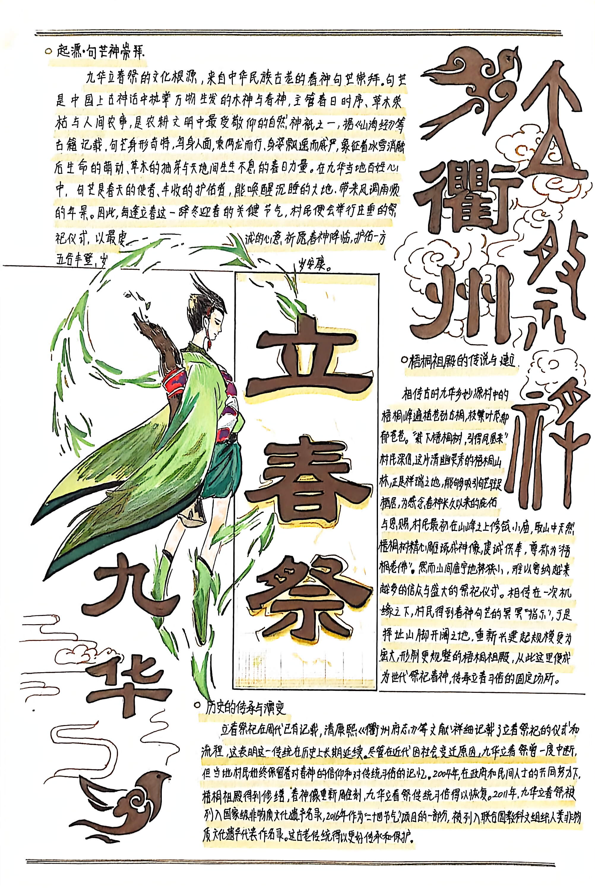 衢州九华立春祭一一世界级非物质文化遗产 1. 起源于句芒神崇拜 九华立春祭的文化根源,来自中华民族古老的春神句芒崇拜。句芒是中国上古神话中执掌万物生发的木神与春神,主管春日时序、草木荣枯与人间农事,是农耕文明中最受敬仰的自然神祇之一。据《山海经》等先秦古籍记载,句芒身形奇特,鸟身人面,乘两龙而行,身姿飘逸而威严,象征着冰雪消融后生命的萌动、草木的抽芽与天地间生生不息的春日力量。在九华当地百姓心中,句芒是春天的使者、丰收的护佑者,能唤醒沉睡的大地,带来风调雨顺的年景。因此,每逢立春这一辞冬迎春的关键节气,村民便会举行庄重的祭祀仪式,以最虔诚的心意祈愿春神降临,护佑一方五谷丰登、岁岁安康。 2. 梧桐祖殿的传说与建立 关于祭祀场所梧桐祖殿的由来,在九华乡妙源村流传着一段动人的古老传说。相传古时村中的梧桐峰满山遍植苍劲古桐,枝繁叶茂,郁郁苍苍。民间自古便有“栽下梧桐树,引得凤凰来”的吉语,村民深信,这片清幽灵秀的梧桐山林,正是祥瑞之地,能够吸引春神句芒驻足栖居。为感念春神长久以来的庇佑与恩赐,村民最初在山峰之上修建小庙,取山中天然梧桐树根精心雕琢成神象,虔诚供奉,尊称为“梧桐老佛”。然而山间庙宇地势狭小,难以容纳越来越多的信众与盛大的祭祀仪式。相传在一次机缘之下,村民得到句芒神的冥冥“指示”,于是择址山脚开阔之地,重新兴建起规模更宏大、形制更规整的梧桐祖殿,从此这里便成为世代祭祀春神、传承立春习俗的固定场所3. 历史传承与演变 立春祭祀在周代已有记载,衢州地区自古便有在立春日迎春、祭春的习俗。清康熙《衢州府志》等文献详细记载了当地立春祭祀的仪式和流程,表明这一传统在历史上长期延续。尽管在近代因社会变迁等原因,九华立春祭曾一度中断,但当地村民始终保留着对春神的信仰和对传统习俗的记忆。2004年,在政府和民间人士的共同努力下,梧桐祖殿得到修缮,春神像重新雕制,九华立春祭的传统习俗得以恢复。2011年,九华立春祭被列入国家级非物质文化遗产名录,2016年作为“二十四节气”项目的一部分,被列入联合国教科文组织人类非物质文化遗产代表作名录,这一古老的传统得以更好地传承和保护。九华立春祭不仅是当地民众祈福祝愿的民俗活动,更是农耕文明和传统文化的重要载体,体现了人们对自然的敬畏、对丰收的期盼以及对美好生活的向往。