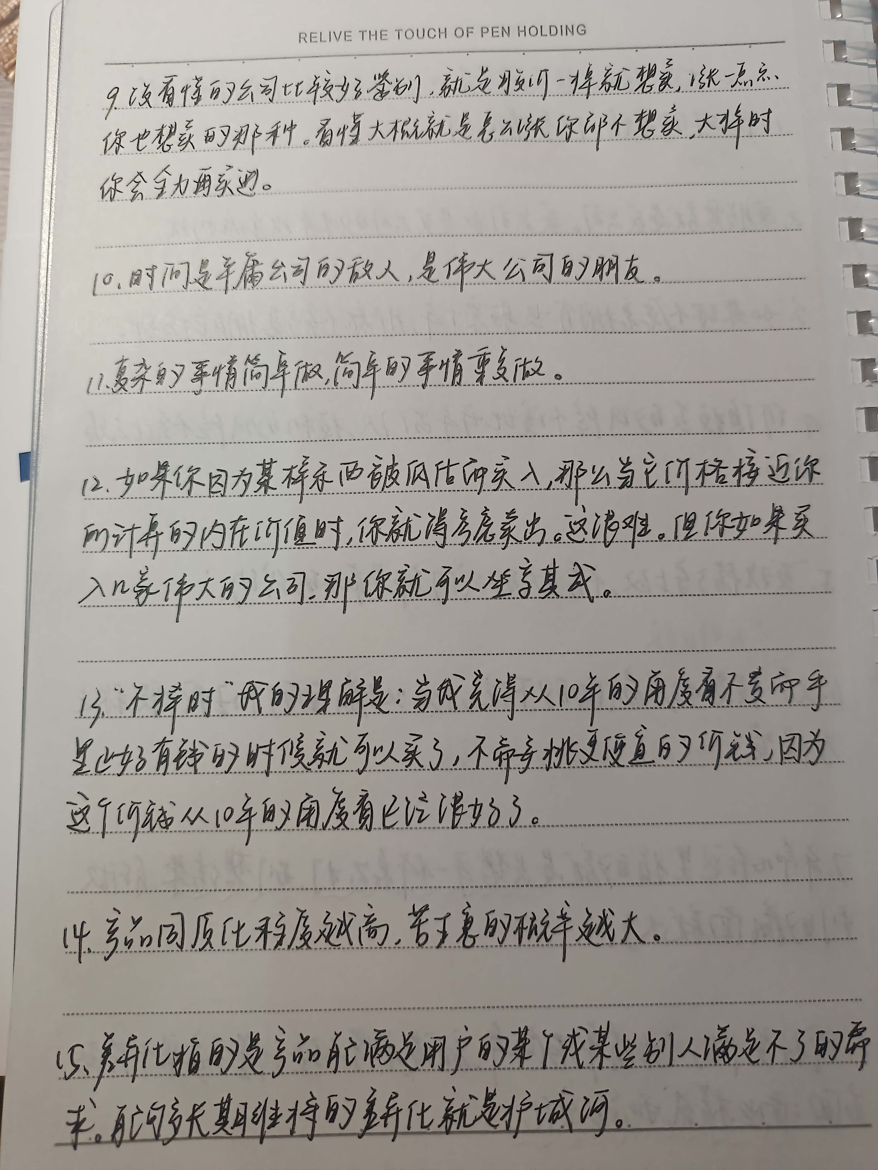 《段永平投资问答录》 1.股票是由每个买家自己定价的,到你自己觉得便宜的时候才可以买,实际上和市场(别人)无关。啥使你能看懂这句话?你的股票生涯基本上就会有机会持续赚钱了。 2.当你迷茫的时候,试试往远处看看,十年往往比看一到两年要容易很多,看一两年会比看一两天容易很多,比如投资上很多公司,其实是很容易知道他们十年后很可能会不行的,那为什么现在要买呢?避开这些公司,你会发现其实你的选择会特别少,但心里会踏实很多。 3.时间是平庸公司的敌人,是伟大公司的朋友。 投资看长远,心里会安定很多,也会坚定很多。