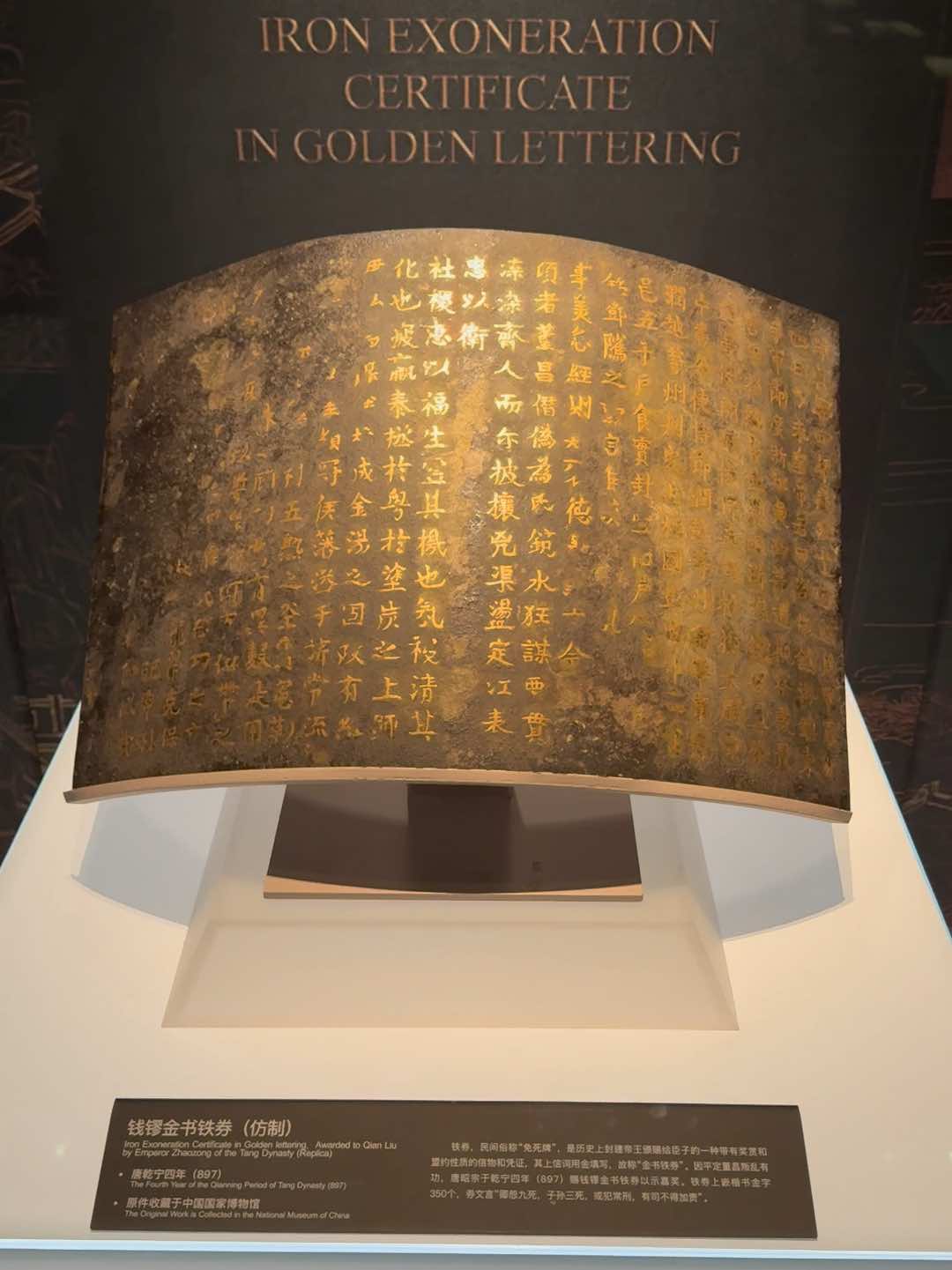 吴越钱氏一千多年传家宝,传说中的免死金牌 电视剧中的免死金牌真的存在❗️ 吴越国开国君主钱镠平定董昌叛乱 唐昭宗赐金书铁券,可免九死 钱镠后世子孙免三死,小过不罚 朱元璋承认它合法,免了钱家之罪 钱家这件传家宝从杭州到开封 又从开封到浙江临海、嵊州 一千多年来,躲过了历代多次劫难 1951年捐给国家,现藏国家博物馆 浙江多处博物馆可以看到仿制件