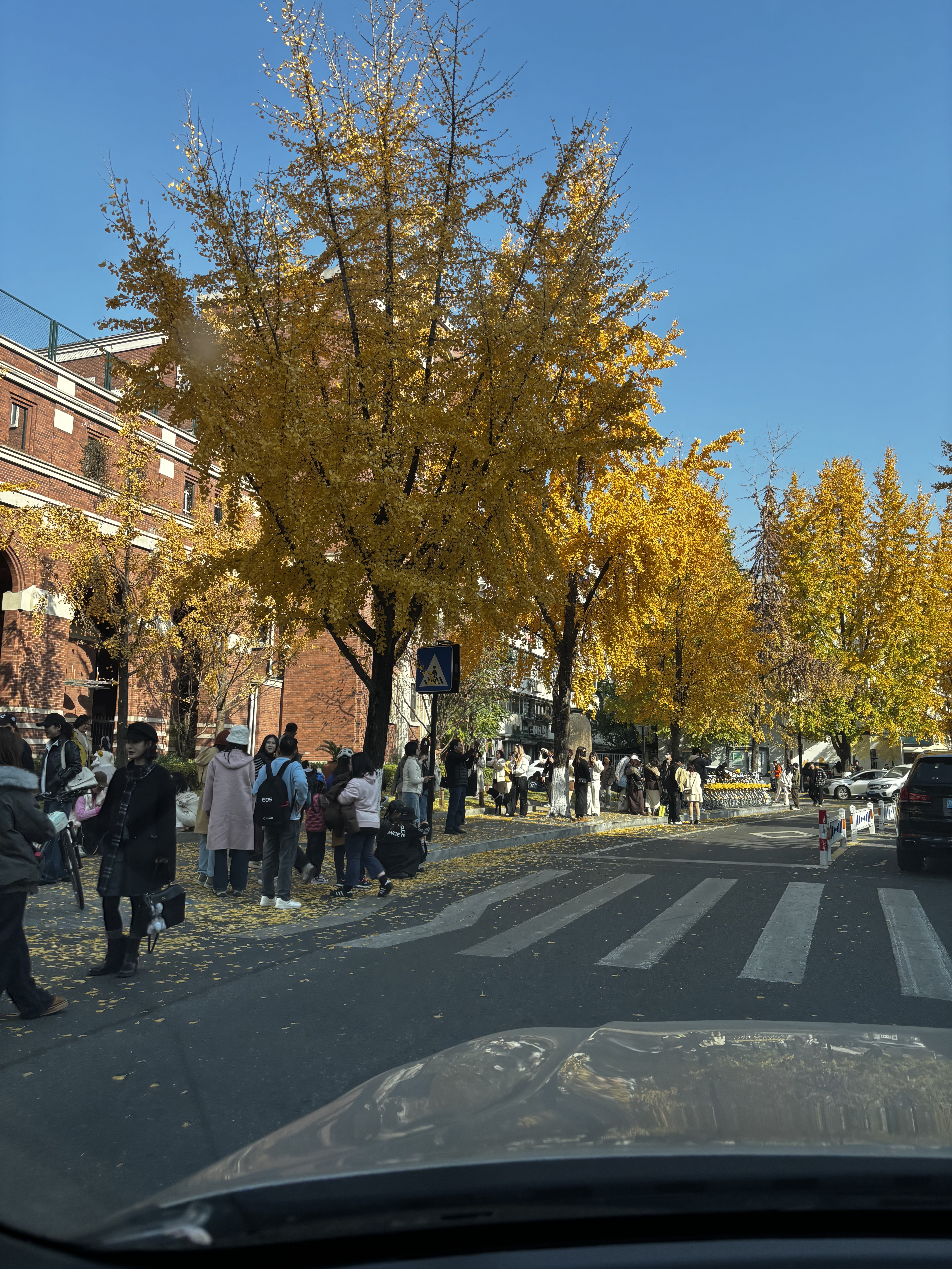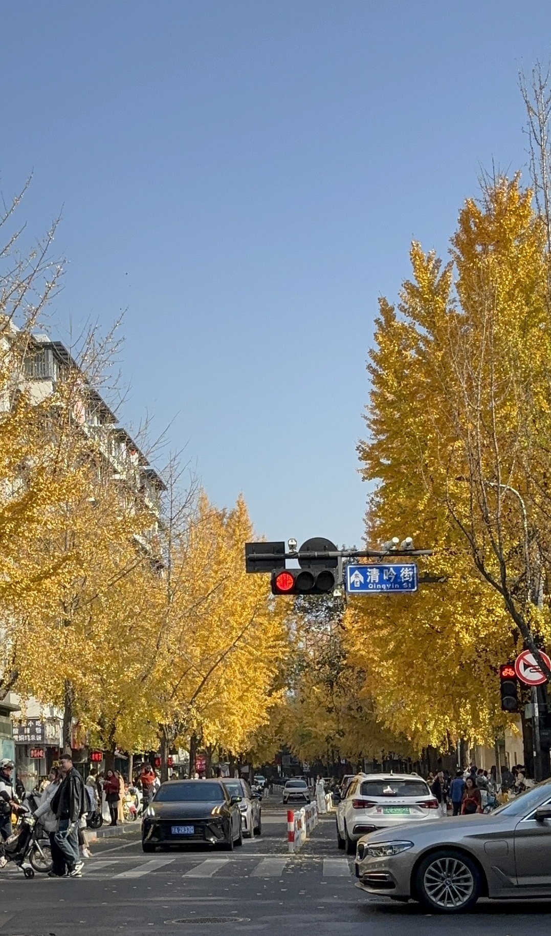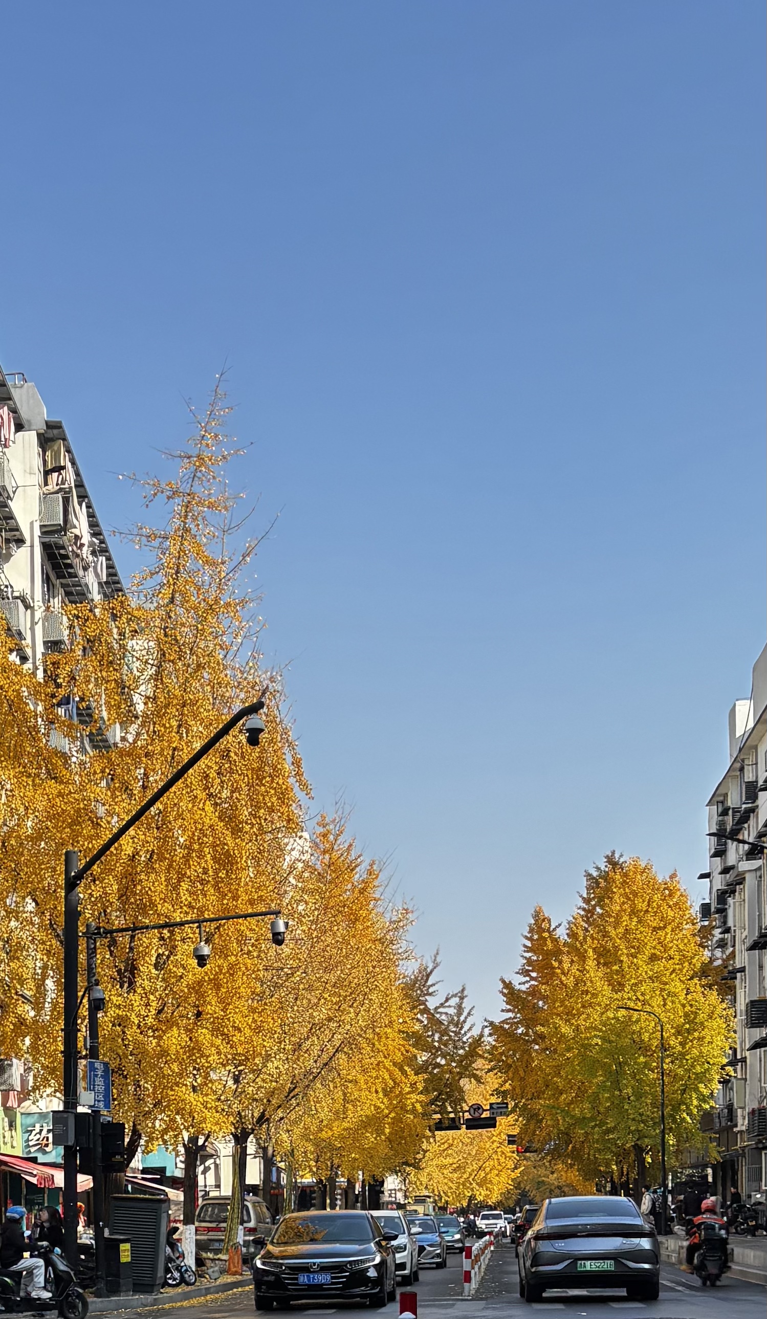 清吟街上叶子的颜色浓郁到了顶峰,配上蓝天,就是高饱和的绝美CP,谁说只有红蓝才出CP,黄蓝也不逊色。一路走,都是来拍照的人,还有很多网红,想看网红怎么出片的?一个人摆好姿势,边上两三台相机蹲着,等一阵风,等得粉都要晒掉了,然后赶紧拍!拍拍!到处都是打扮美美的来打卡的小姐姐和小哥哥们。就连路边台阶上都坐了不少人,在拍马路牙子下堆起的落叶,到处找角度,拿上一边叶子试远景和近景。我就好奇,这个天气坐在水泥地上不冷吗?所以哪里有什么机缘巧合正正好,都是时间熬出来的。别看图里轻松,图背后是一堆负重前行的幕后。车行一路,也算是看到半个台前幕后。出图不易……我也就认了自己的草台班子,给诸位真•摄影师们抛砖引玉。