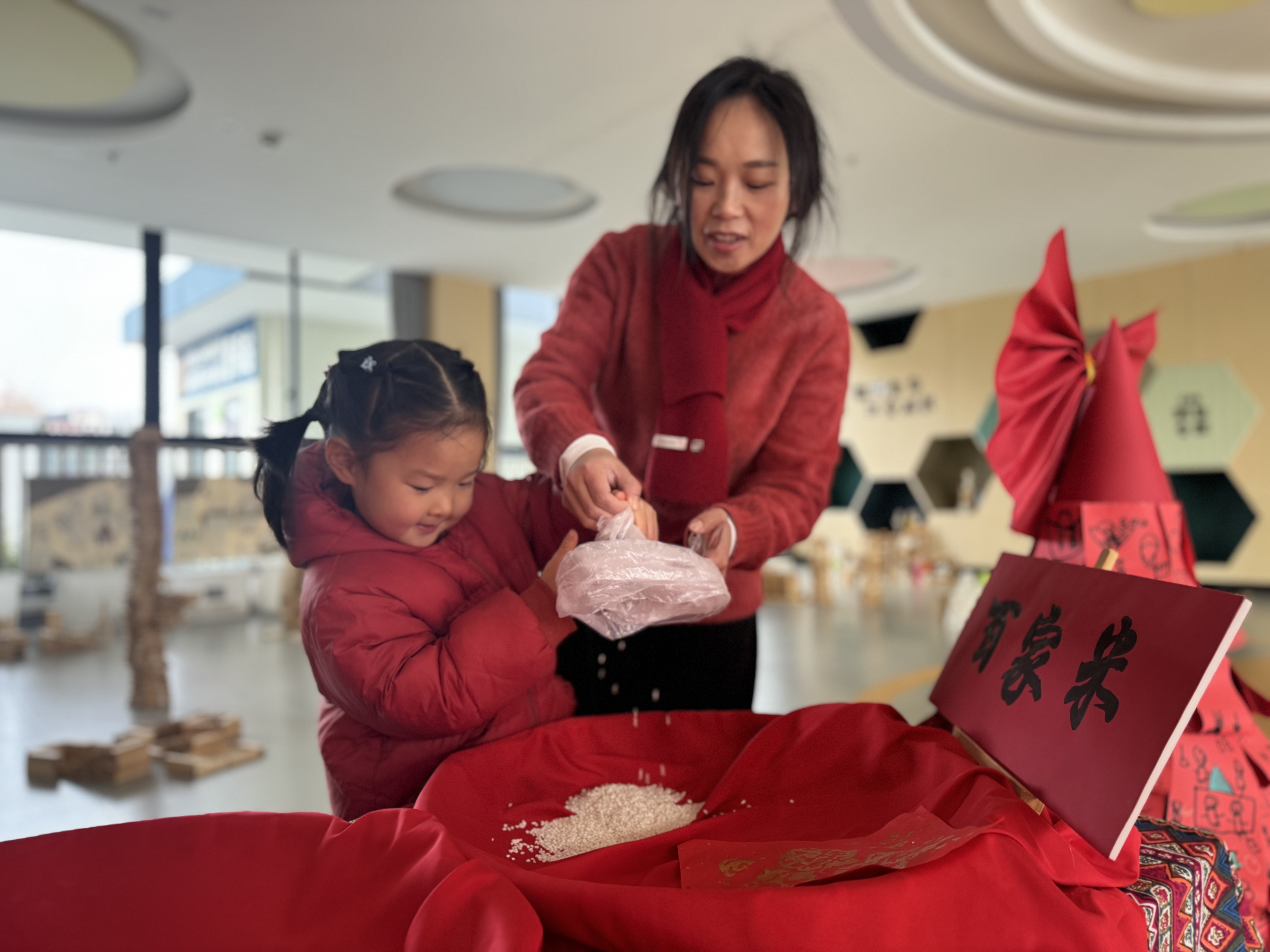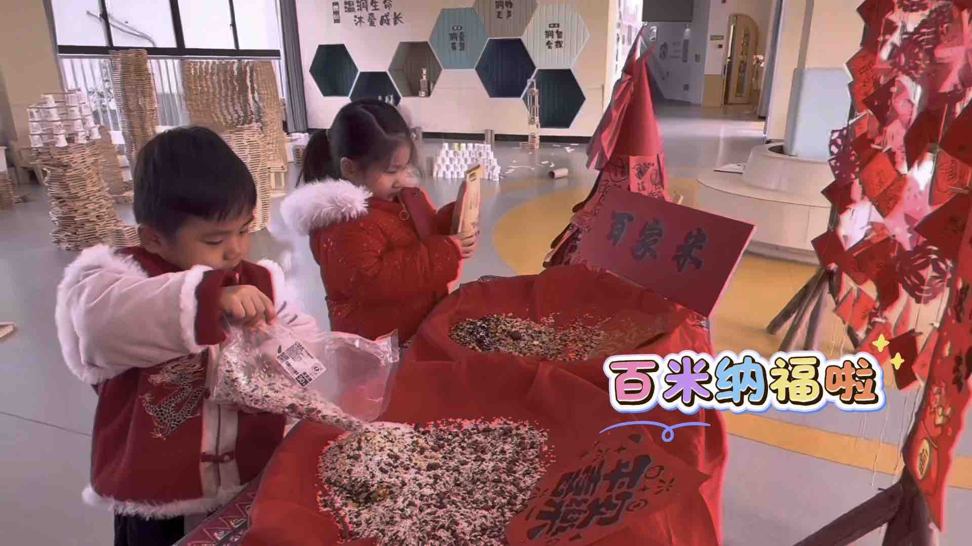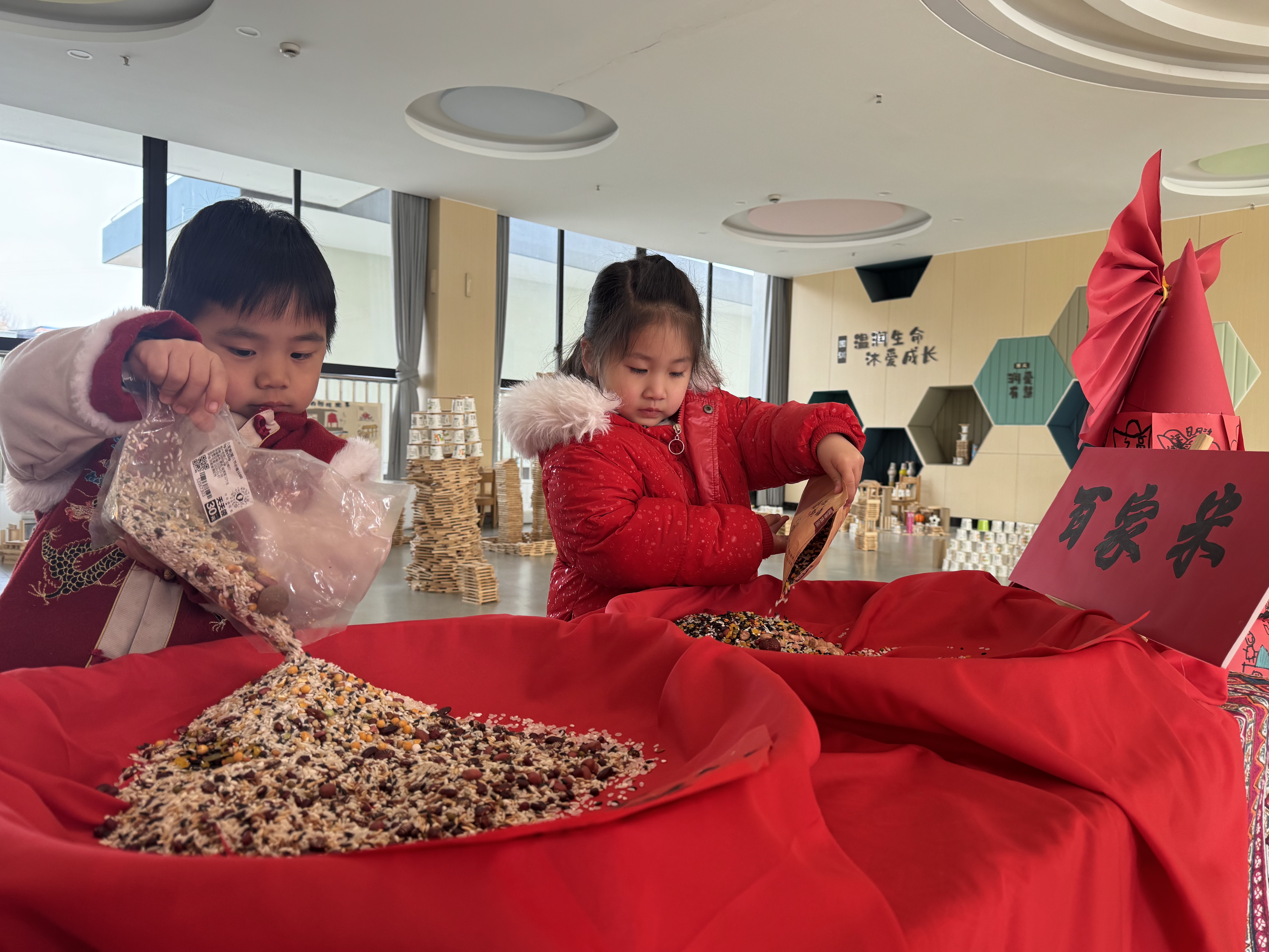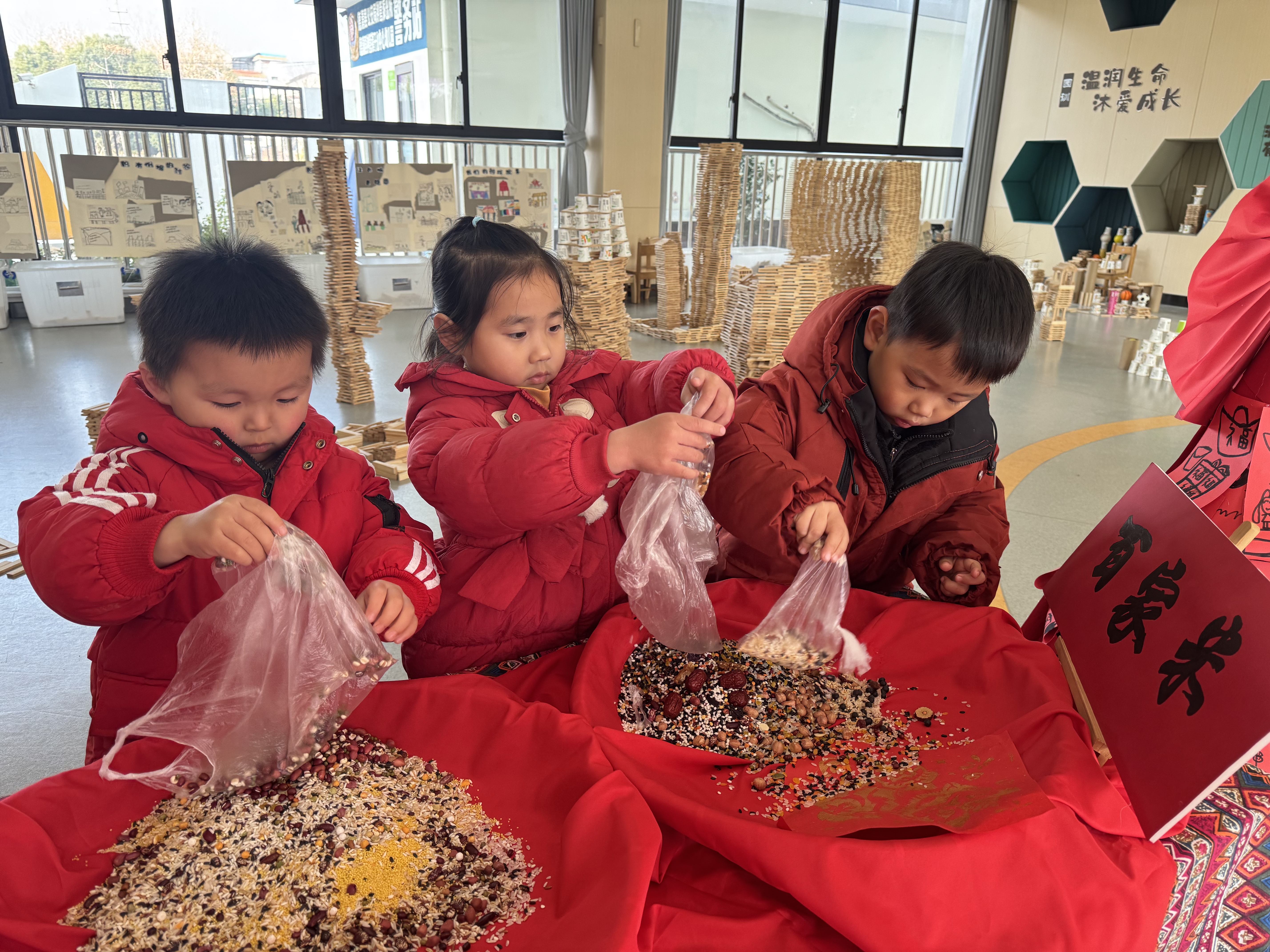 德清县钟管镇干山中心幼儿园的老师和幼儿一起收集腊八粥的食材。把“百米”全部倒在一起,为制作腊八粥做准备。