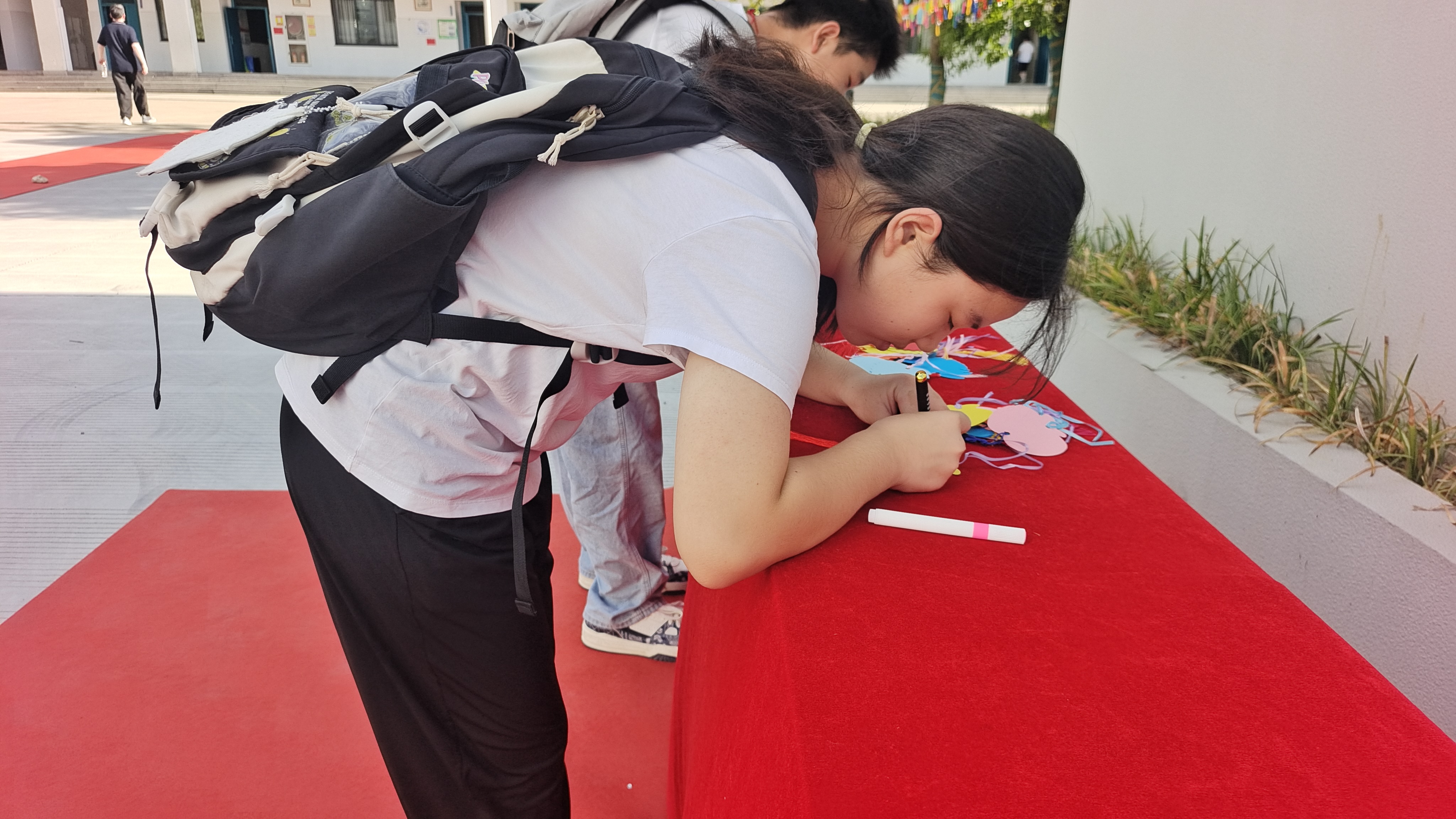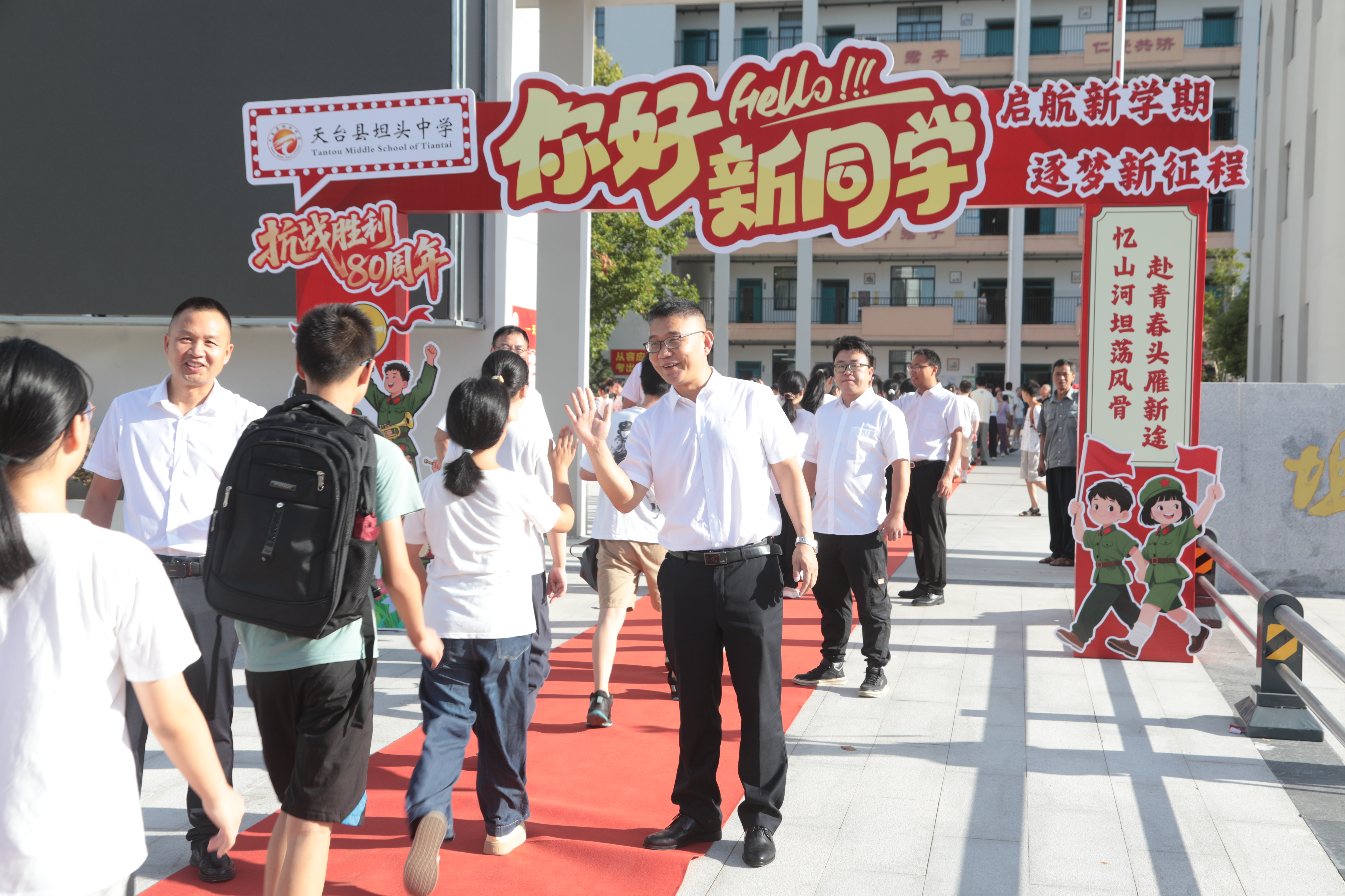 【坦头中学迎新特稿】 走红色地毯·传抗战精神——天台县坦头中学隆重迎接七年级新生入校 八(2)奚晨欣 红毯迤逦迎新,师者击掌相迎;签名落笔庄重,系愿寄语情深;记者穿梭记录,传承红色精神……8月29日上午,天台县坦头中学以一场庄严而温暖的仪式,迎来了2025级七年级新生。红毯铺展,校园焕然一新,一道书写着“纪念抗战胜利80周年暨启蒙新学期 逐梦新征程”的拱门巍然矗立,仿佛一道连接历史与未来的精神之门。 早晨7点半,八个班级的新生依次踏上红毯。校领导与老师们分列两侧,微笑击掌、声声鼓励,让初入中学的孩子们褪去青涩、倍感温暖。穿过拱门,班主任和任课老师早已守候在旁,引导学生在签到墙上郑重写下姓名,在“心愿林”红绳上系挂属于自己的梦想卡片。许多学生兴奋地表示:“这样的入学仪式,庄严又有趣,让我对初中生活充满期待!” 坦头中学书记、校长胡朝华在接受小记者采访时强调:“在抗战胜利80周年这一特殊历史时刻,我们以红色育人为根基,以革命精神为血脉,希望通过‘走红毯’这样庄严的仪式,让同学们铭记历史、勇担使命。” 七(2)班的王景怡和施宏键同学在接受校园电视台小记者采访时表示:“要继承先烈遗志,立志报国,发奋学习,让祖国变得更强大,不被外国侵略!” 同班的陈冠宇同学表示:“来到新学校,既兴奋又有些忐忑。初中是新的起点,我希望尽快融入集体,踏实学习,更上一层楼。” 七(7)班裴祉萌同学的家长也寄语女儿:“新环境、新开始,愿她为梦想重新出发,不负韶华。 校团委书记、工会负责人李晓红表示:“新学期、新气象,愿每一位同学心怀梦想、脚踏实地。今年正值抗战胜利80周年,希望同学们传承先烈精神,刻苦学习,立志报国。” 简短而热烈的迎新模式结束后,各班学生进入精心布置的教室,开启中学“第一课”。 七年级年级长、七(6)班班主任彭茵老师动情地说:“我们怀着激动的心情迎接新同学,感谢家长和学生的信任。未来三年,我们将与孩子们共同成长、并肩前行。” 9时30分,全体新生齐聚报告厅,参加始业教育。 这是一次迎新,更是一次精神的洗礼。红毯之上,是脚步,是期待,是传承;校园之中,是梦想,是责任,是未来。坦头中学以仪式感叩响新学期的钟声,以红色基因注入成长的力量,陪伴新一代少年,迈步走进崇高新征程,书写激扬青春新华章。 指导老师卢鹤龄
