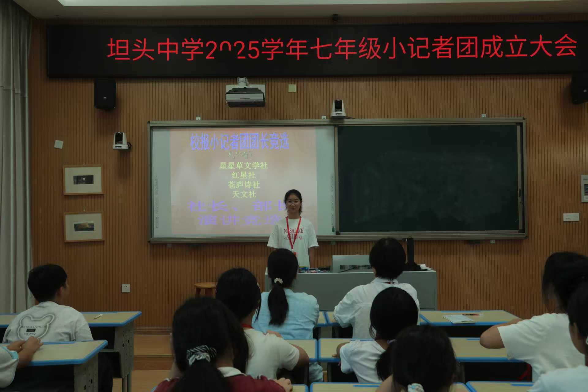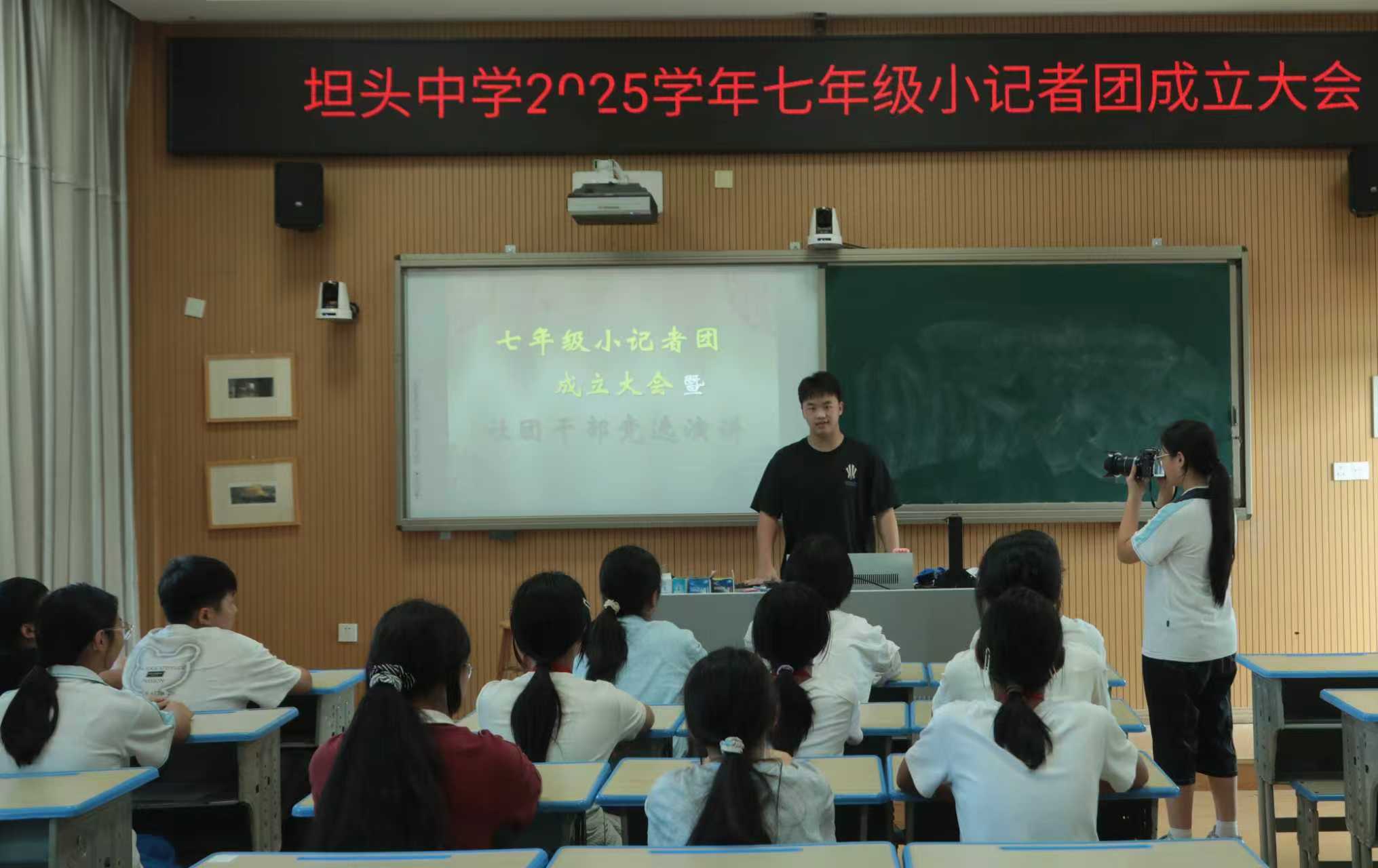 青春执笔书写时代华章,少年竞帆启航传媒梦想——天台县坦头中学七年级小记者团成立暨社团干部竞选盛会侧记 七(3)徐宁悦 微格教室里雷动的掌声穿透秋日的晴空,铿锵有力的竞选宣言在校园里激起层层涟漪。10月15日,天台县坦头中学以一场别开生面的社团干部演讲竞选活动,为七年级小记者团的成立注入了蓬勃朝气,展现了新时代素质教育的生动实践。 多元舞台:让每个梦想都找到绽放的坐标 “我要用镜头记录校园万象”“我要以文字传递青春声音”“我要用无人机俯瞰美好山河”……在这场被视为校园“两会”的盛会上,少年们意气风发的宣言构成了教育改革最动人的注脚。从红星社的红色传承到苍庐诗社的文脉赓续,从天文社的宇宙探秘到校园电视台的现代传播,十余个特色社团构筑了多元成长的立交桥。 校长胡朝华在致辞中表示:“我们致力于打造‘人人皆可成才,人人尽展其才’的育人生态,让社团活动成为学生核心素养培育的重要载体。”这所扎根乡土的教育沃土,正以开放包容的姿态,为每个青春梦想提供生长的沃土。 薪火相传:构建跨年级协同育人新范式 值得关注的是,本次活动创新采用了“学长导师制”。九年级团长王靖玮以自身从腼腆少年到校园媒体骨干的蜕变经历,为新成员描绘了成长蓝图;八年级骨干团队全程参与摄录工作,形成了独具特色的传帮带机制。这种跨越年级的协作模式,不仅实现了社团文化的持续传承,更构建了学生自主管理的创新范式。 实践育人:在真实情境中锻造核心素养 从教师节感恩采访到“九一八”历史寻踪,从抗战老兵口述史采集到校园电视台实景主持,坦头中学将小记者培养深度融入真实社会场景。团委书记李晓红强调:“我们注重在实践活动中培养学生的家国情怀、媒介素养和社会责任感。”即将到来的校运会上,这批新生代记者将持证上岗,用笔尖记录拼搏瞬间,用镜头定格青春风采。这种“做中学”的教育理念,让知识在实践中焕发勃勃生机。 未来可期:打造素质教育特色样板 据社团总负责人童牧老师介绍,学校已构建起“校内导师+行业专家”的双轨培养体系,定期邀请媒体记者、作家学者开展专业培训,涵盖新闻采写、影视制作、天文观测等前沿领域。这种开放式办学格局,有效打通了学校教育与社会需求的最后一公里。 “访老兵、探宇宙、制节目的经历,都是课本无法替代的成长养分。”徐宁悅同学的心声道出了小记者们的共同感受。在这片孕育希望的校园里,一个个青春梦想正循着社团活动的阶梯,向着广阔天地勇敢伸展。 今日在竞选舞台上自信演讲的少年,明日或将成为引领时代的传媒英才。坦头中学这场关于素质教育的生动实践,正在为我们描绘未来教育应有的模样——让每个孩子都能在适合自己的跑道上,奔向闪闪发光的未来。 指导老师 卢鹤龄