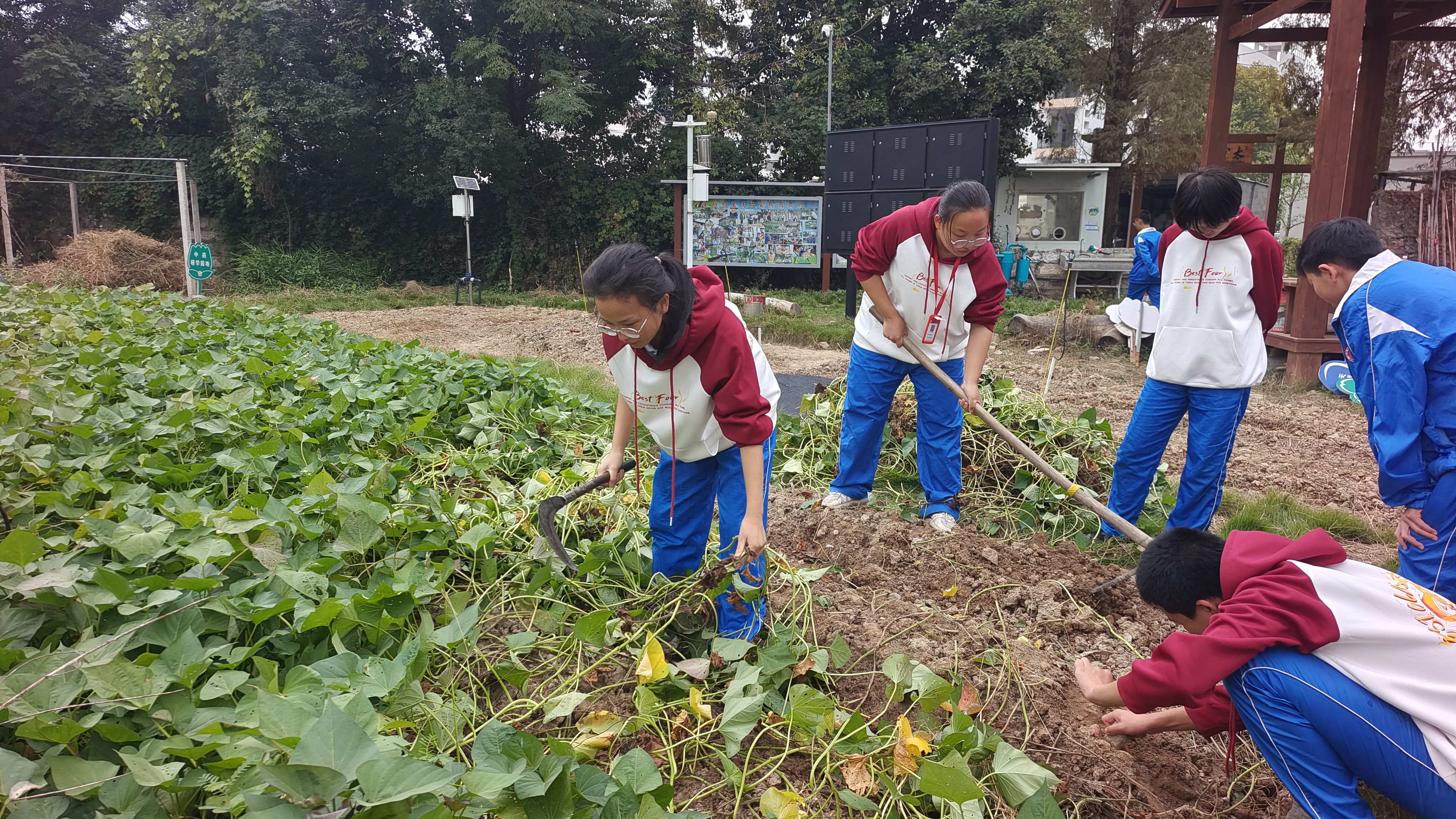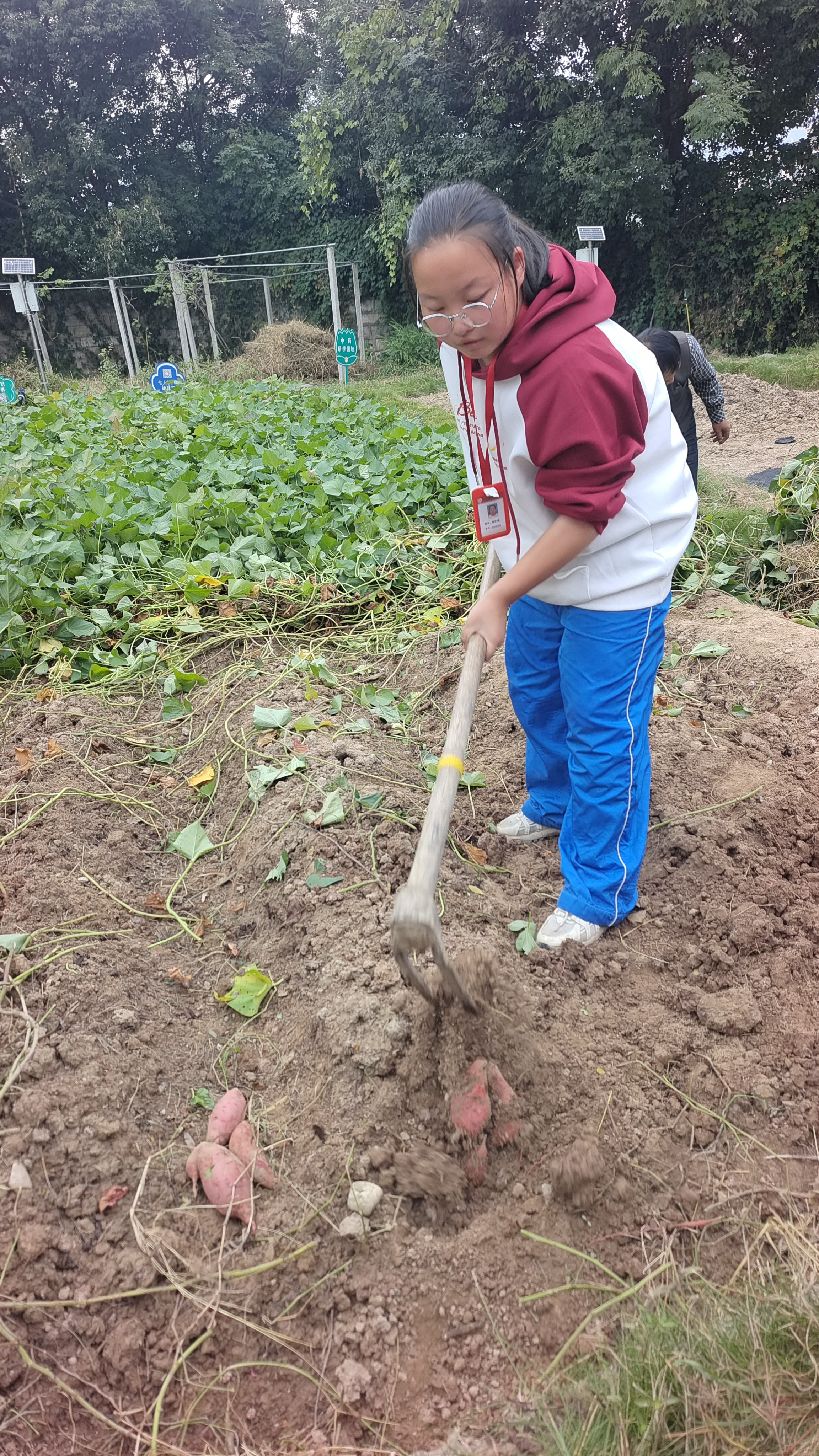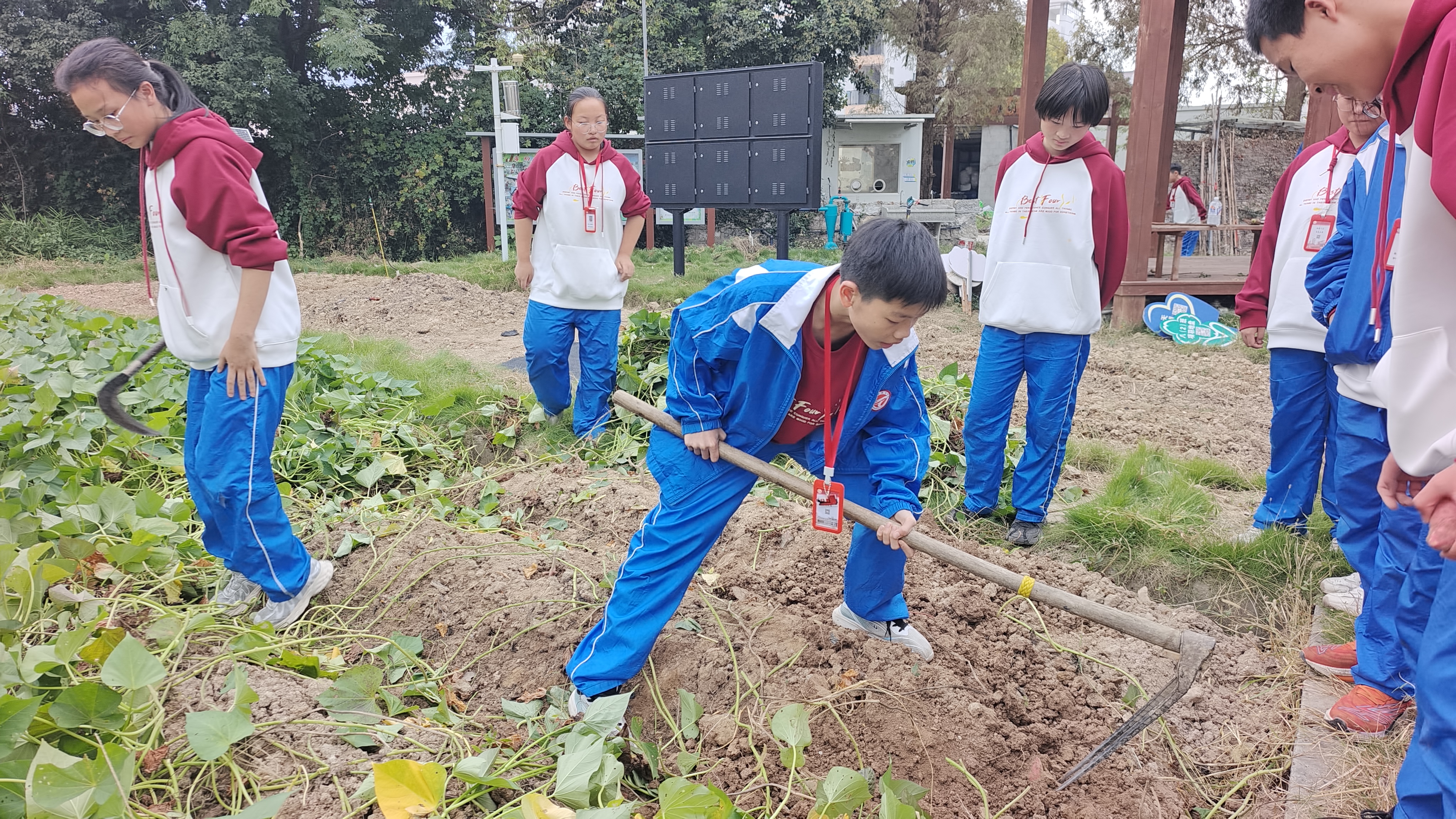 泥土里的甜蜜丰收 ——直击坦头中学八(4)班番薯收获现场 八(4) 周琬婷 金秋十月,天高云淡,阳光和煦。10月27日下午,坦头中学的劳动实践基地变成了一片沸腾的丰收现场。八(4)班的同学们,在老师的带领下,手持镰刀、肩扛锄头,奔赴他们耕耘了一个春夏的“宝藏之地”——这一刻,他们已期盼了太久。 从五月亲手栽下嫩绿的番薯苗开始,同学们在老师的指导下,经历了施肥、追肥、翻藤的辛勤管理。汗水浇灌着期待,当看到泥土被底下的果实撑开道道裂痕时,所有人都按捺不住心中的激动:底下一定藏着惊喜! “哇!挖到啦!”一声欢呼瞬间点燃了现场。同学们立刻投入“战斗”:有人小心翼翼地用镰刀清理藤蔓,有人握着锄头从外围向中心小心挖掘,更有心急的同学直接上手,当指尖触碰到泥土中坚实的果实时,脸上瞬间绽放出灿烂的笑容。 现场气氛火热,同学们争先恐后地将一个个形态各异的番薯从土中“请”出来,如同发掘宝藏。劳动中不乏有趣的小插曲:有小组不慎将大番薯挖破了相,引来一片善意的笑声;更有小组的锄头柄在奋力挖掘中“光荣牺牲”!但这丝毫没有影响大家的热情,他们干脆徒手刨挖,或用那断了柄的锄头继续奋战——这份全情投入,正是对劳动最生动的诠释。 当整块地的番薯被尽数收获,成果颇丰!每个人都满载而归,有的一手一个,有的怀里还抱着好几个,脸上洋溢着自豪与满足。老师宣布,这些凝聚了心血的果实将送到食堂,变成全班共享的美味。 “能吃到自己种的番薯,这种感觉太棒了!”小记者奚晨欣在收获后感慨道,“从春天种下希望,到秋天收获满满,我深深体会到,最甜的果实永远是自己用汗水浇灌的那一颗。劳动,不仅创造了丰收,更创造了我们无与伦比的快乐和整个班级的珍贵记忆!” 指导老师 卢鹤龄