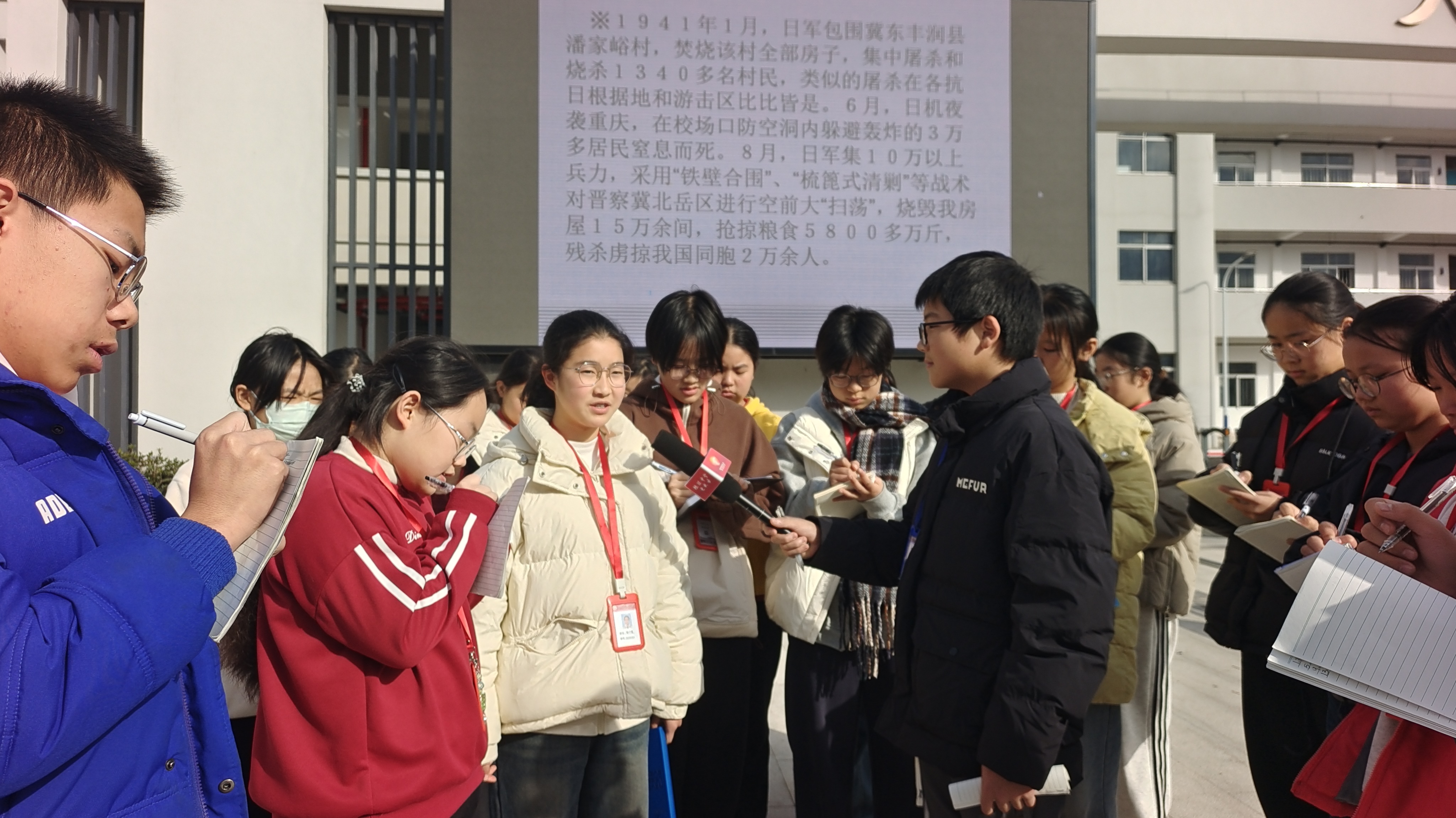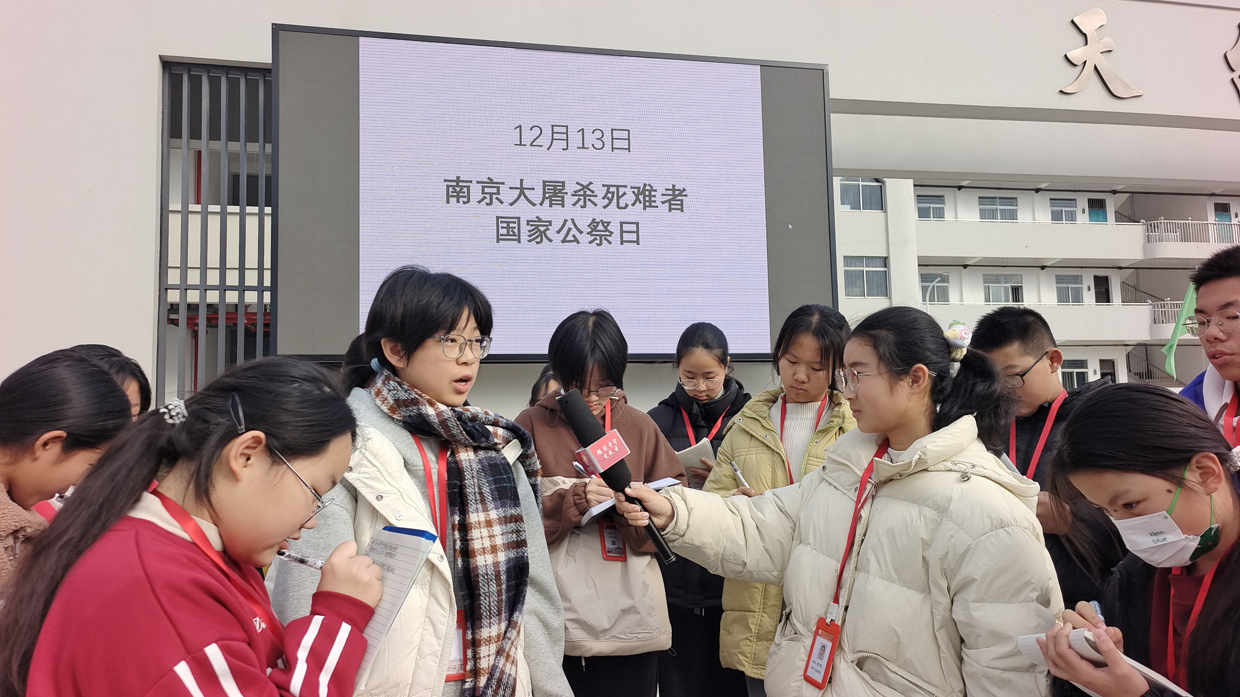 坦头中学小记者主题采访南京大屠杀88周年 八(4)奚晨欣 今年的12月13日,是南京大屠杀88周年第12个国家公祭日的日子,当天正赶上是星期六。此前几天,坦头中学组织小记者利用大课间、午休、团队活动,走进教室、办公室,走进社区、走上街头,围绕国家公祭日进行主题采访。 采访中,师生群众纷纷表示:时至今日,日本右翼仍拒绝正视历史,不仅蓄意淡化、歪曲甚至否认南京大屠杀的史实,更在近年来加紧推进军事扩张,并与外部势力勾连,日本首相更是叫嚣“台湾有事即日本有事”,妄图干预中国内政。这种言行,是日本狼子野心的昭之若揭,是对国际公义与人类良知的严重挑战。 “在倾听与记录中,我们深切体会到‘勿忘国耻’绝非一句口号,而是每一代人都必须承接的历史责任与自强动力。”小记者徐宁悦等表示,惨痛历史不能忘!不敢忘!吾辈当自强!唯有彻底揭露并坚决反对任何企图复活军国主义的行径,铭记曾经的深重苦难,才能警示今人、捍卫和平、照亮未来。 指导老师卢鹤龄