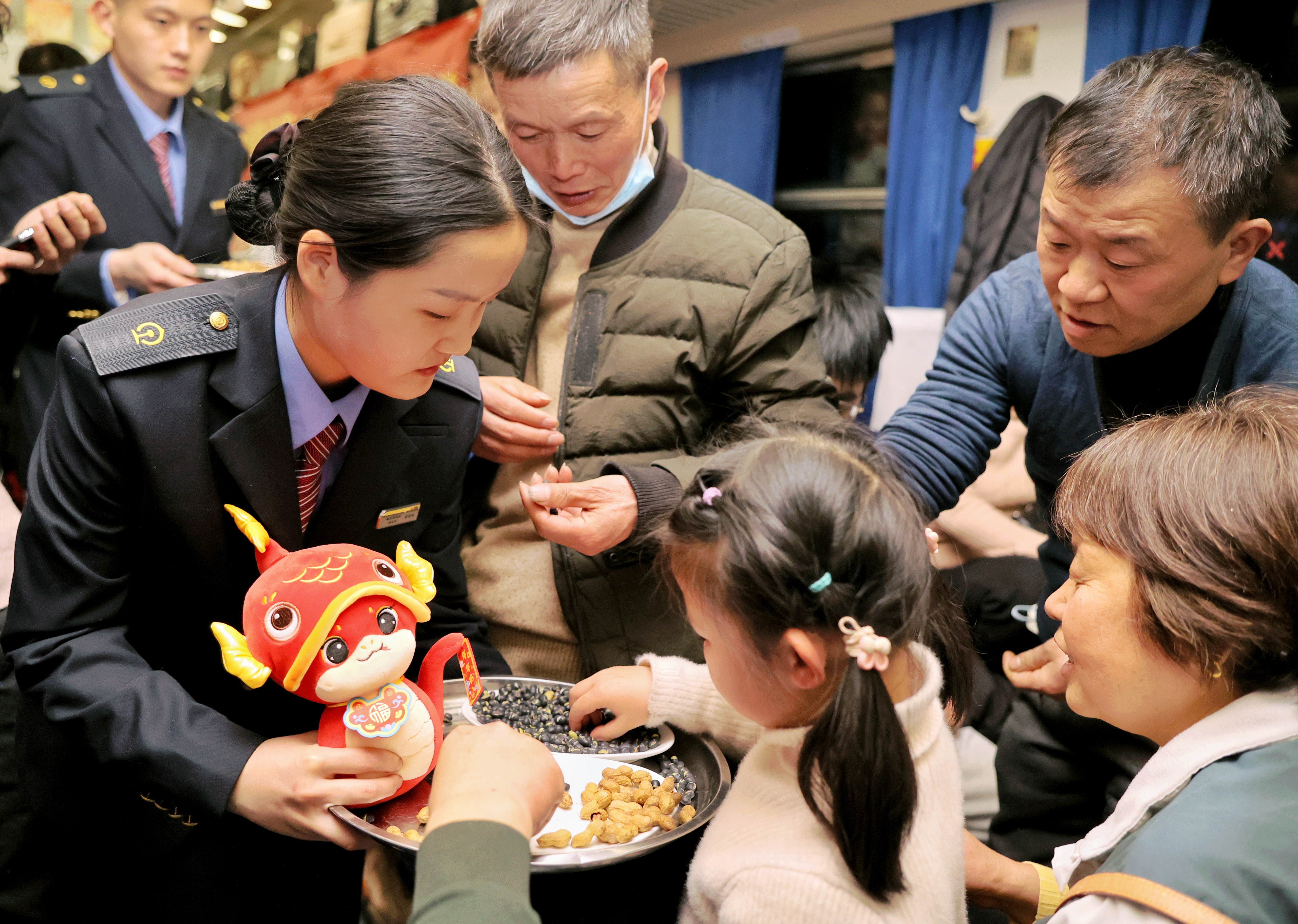 2025年1月14日,春运第一天,诸暨开往北京南的G176次列车,杭州客运段高铁一车队乘务人员和来自五湖四海的旅客,欢聚一堂,拓印年画、做糖人、写对联、普及健康和法治知识,共享春运首日的快乐时光。