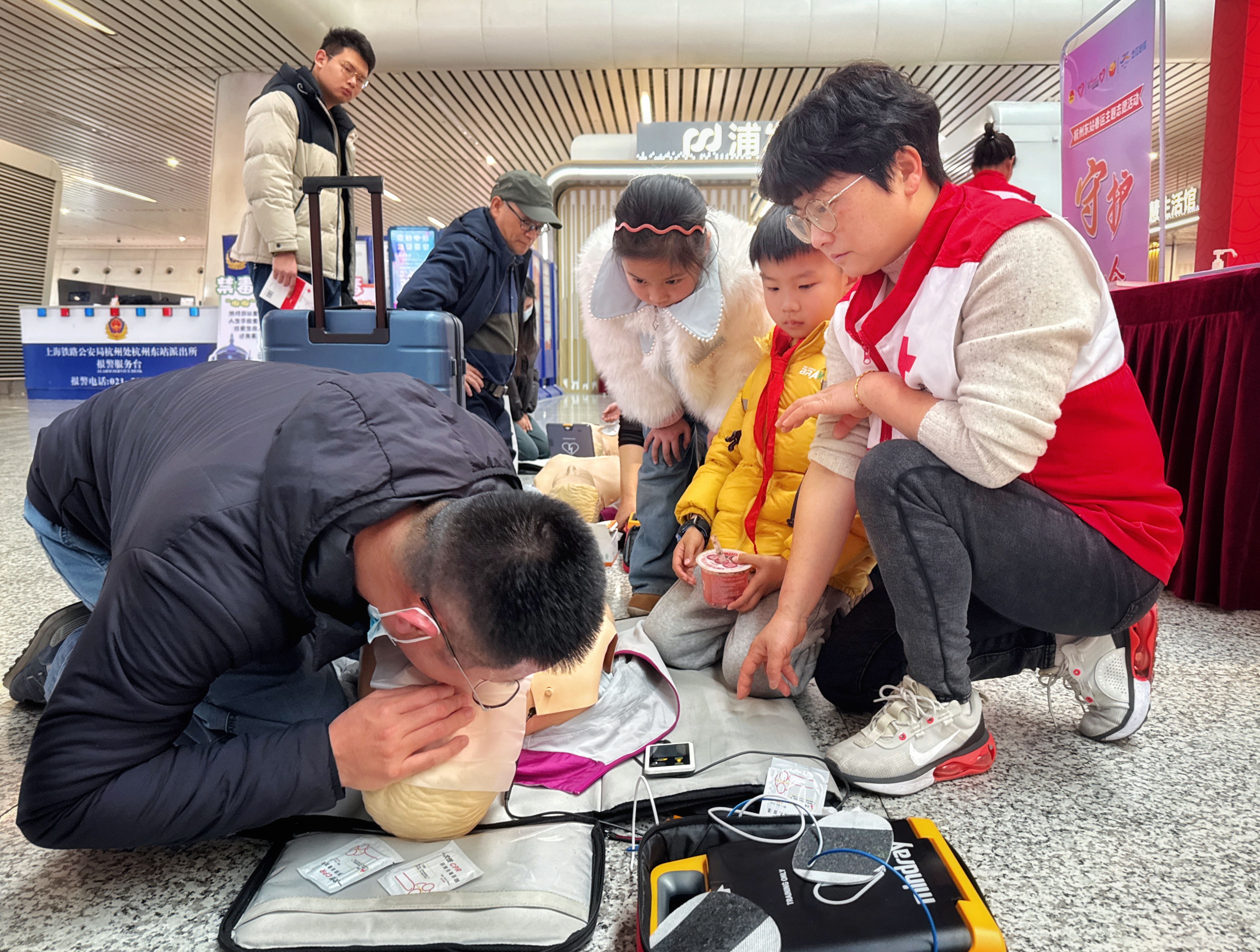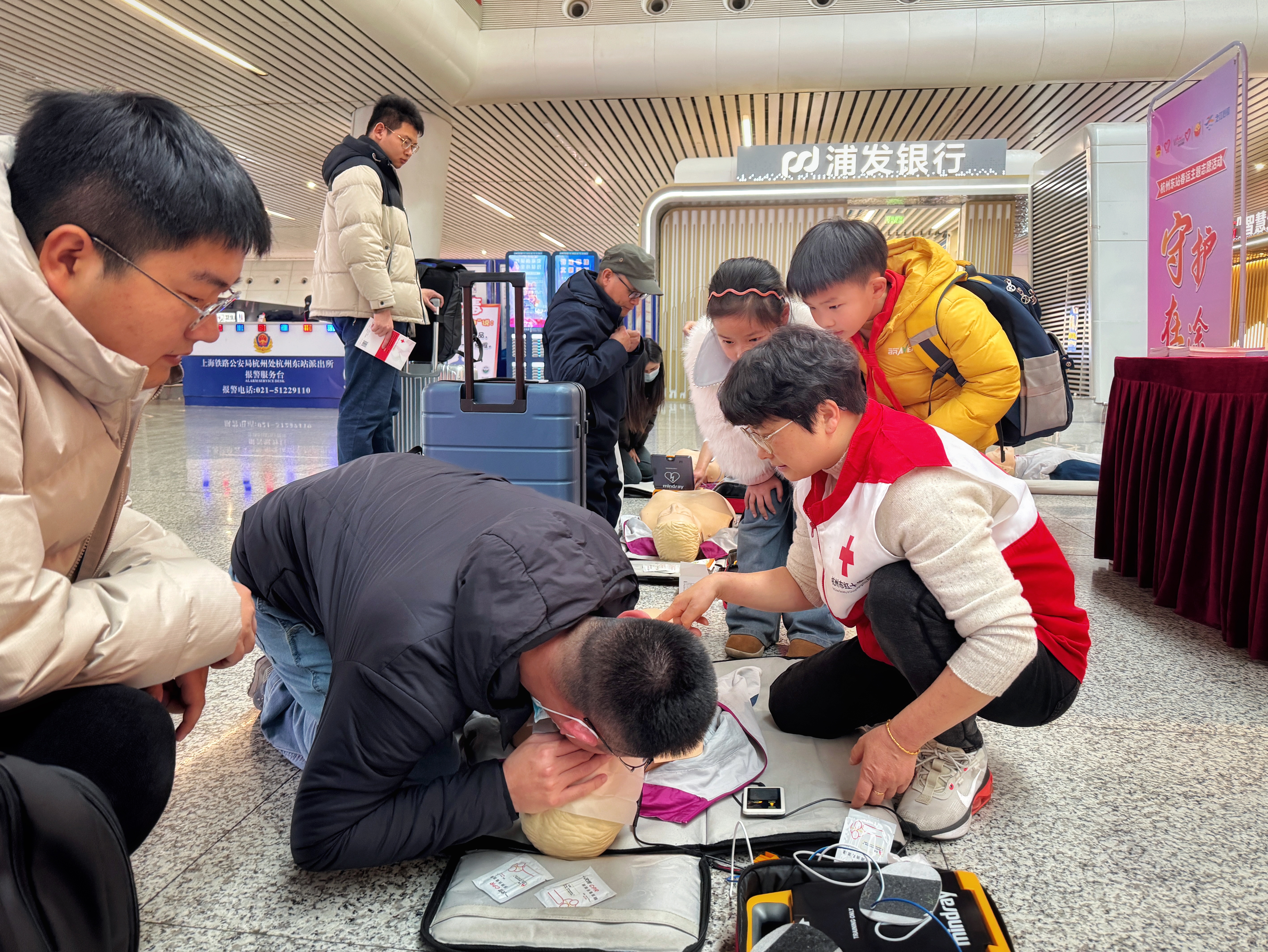 救在身边,平安出行 为了保障旅客们旅途安全,护航春运,杭州火车东站与杭州市红十字会联合开展“救在身边,平安出行”活动。2025年1月21日,杭州东站候车大厅,旅客在体验学习心肺复苏技能和AED使用技巧。