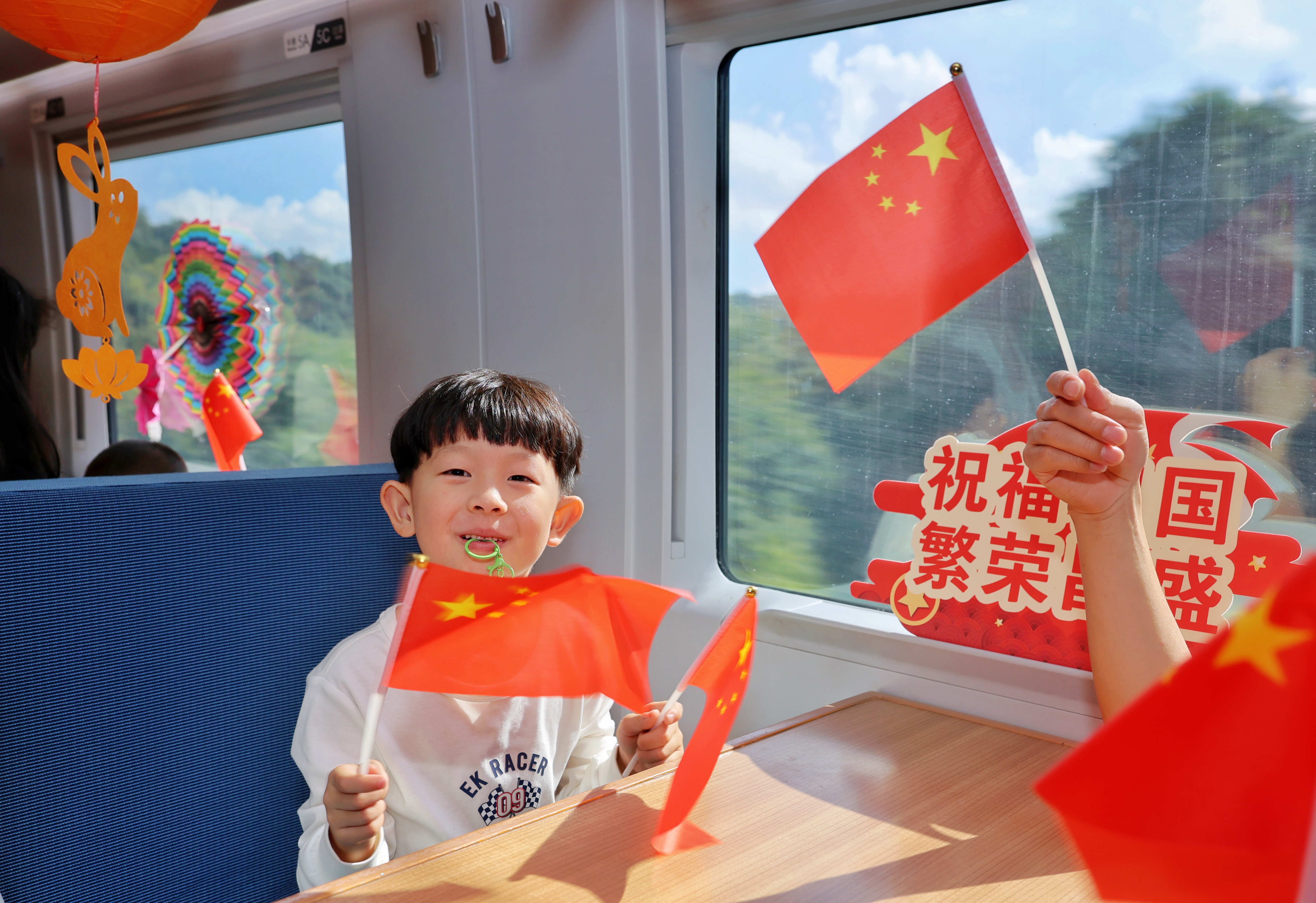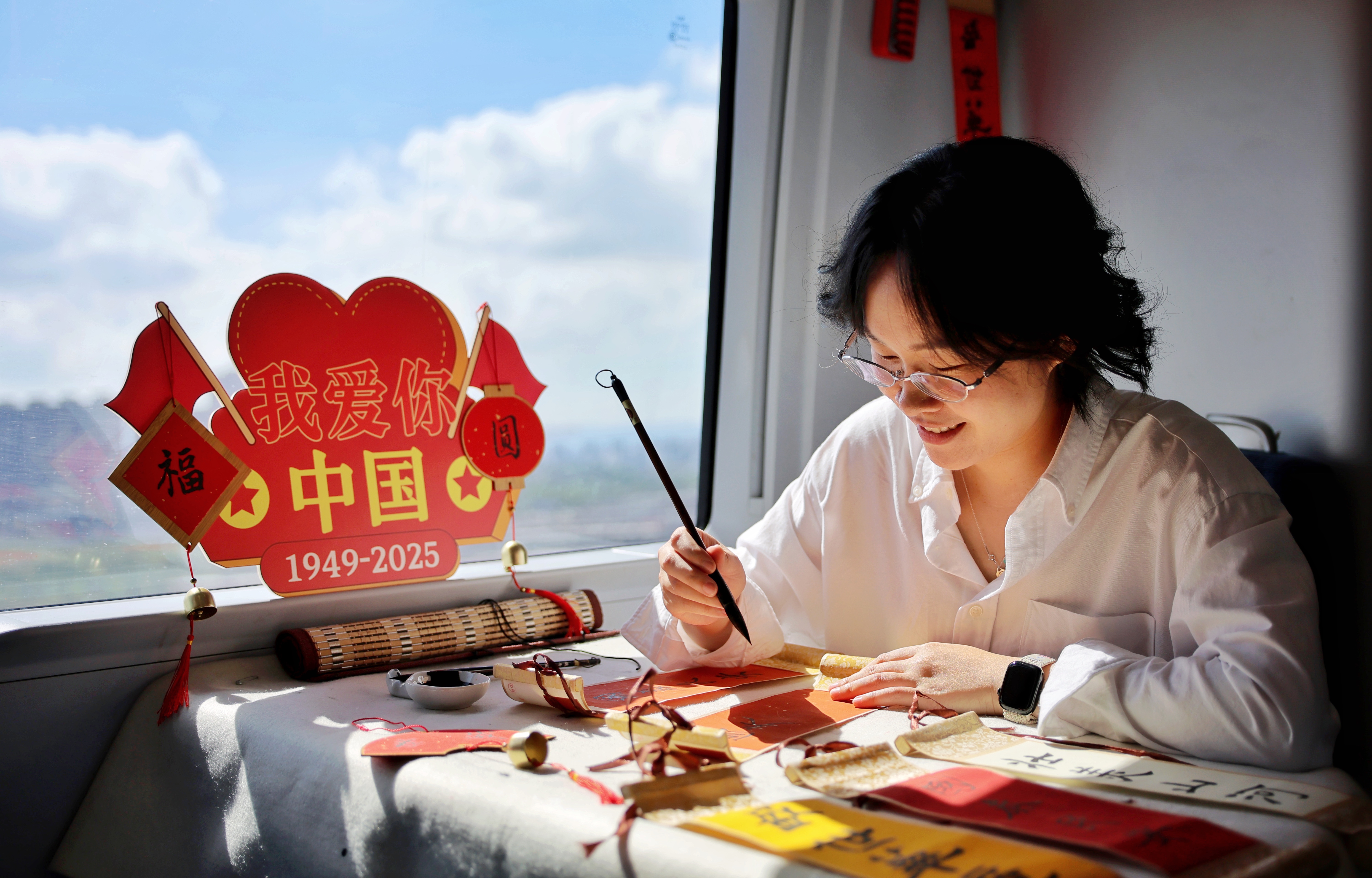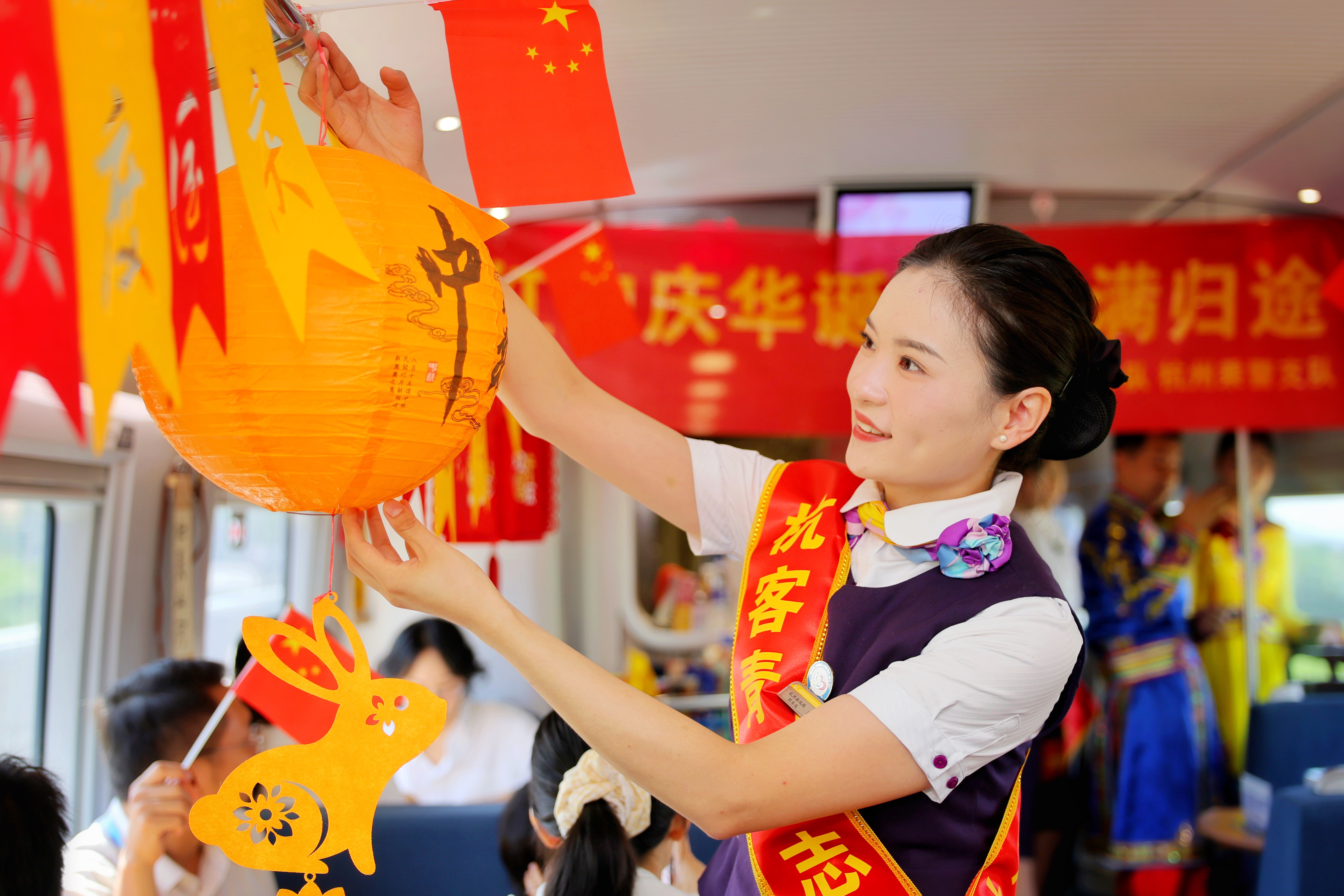 2025年9月26日,浙江杭州开往湖南怀化的G1307次列车上,中国铁路上海局集团有限公司杭州客运段巧红乘务组联合杭州乘警支队开展“红韵庆华诞 月香满归途”主题活动,与旅客欢聚一堂,通过歌舞、书画等形式,共迎国庆、中秋佳节。
