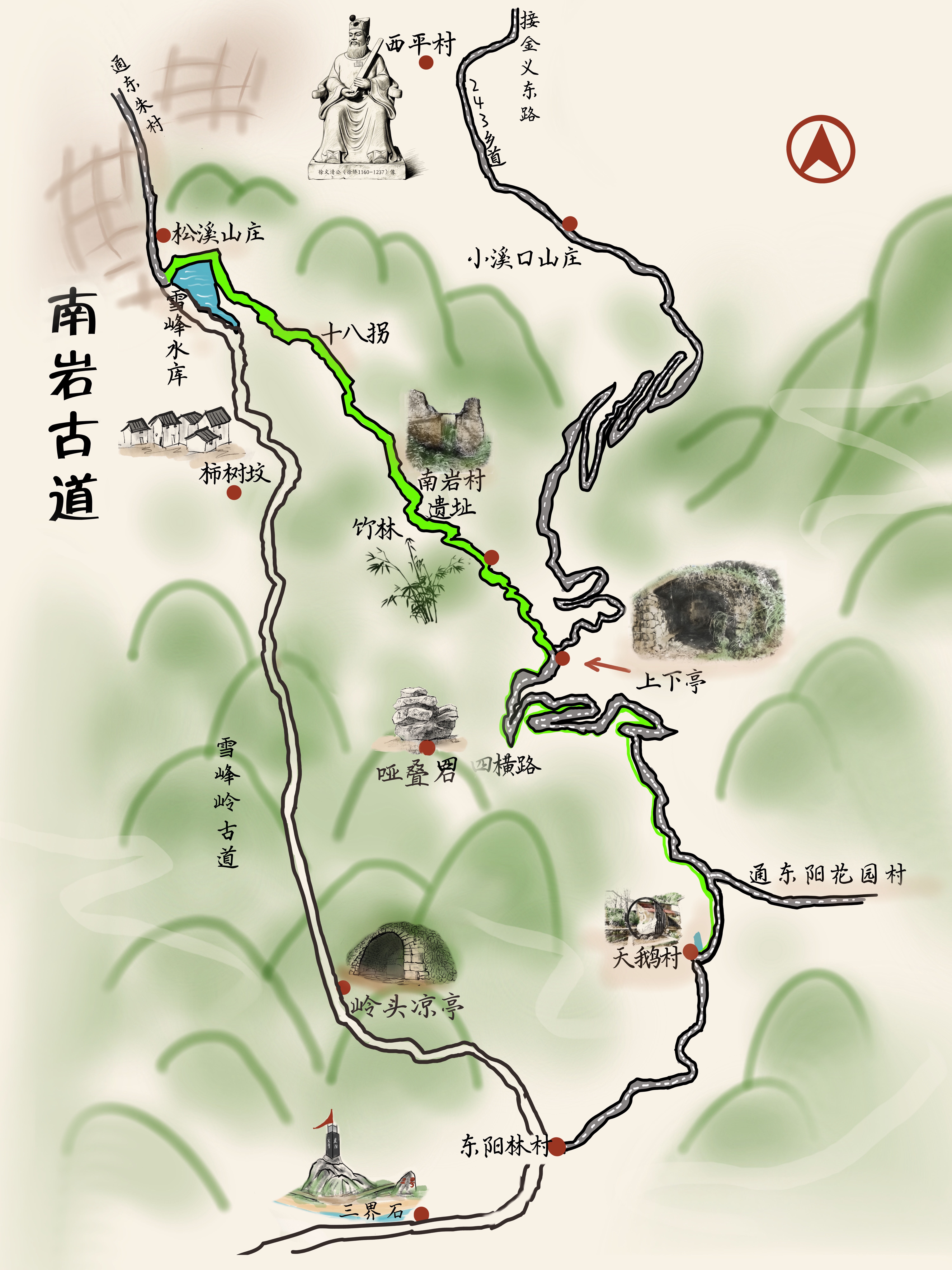 南岩古道:串经典环线 展生态魅力 文/王曙光 毛允和 摄影/郑小平 陈静 朱天平等 人灵地杰的义乌赤岸镇,风光旖旎,胜迹遍布,仅大小古道就有十六七条之多。义乌公布的十条古道,其中有该镇的义永古道、挂纸岭(关支岭)古道、雪峰岭古道,各具特色和风采。而新近发现的南岩古道,深藏于赤岸山林腹地,与其他8条主要古道构成经典环线,勾勒出浙中腹地自然与人文交融的生态图景。 南岩古道因途经义乌东朱南岩自然村得名,起始点为东朱村的雪峰水库一侧,终点是东阳画水镇林村行政村的天鹅村,行程约5公里。从该水库向南行走,但见库水波光粼粼,四周山林葱郁,鹅卵石阶光滑温润,满目苍翠绿意,仿佛闯入一座天然森林氧吧。当地老农介绍说,义乌全市共登记植物物种508种,南岩古道沿线便是赤岸森林典型的物种富集区。这里有满山粗壮的木荷、青岗树、栎树、枫树撑起天际线,山矾、乌饭树等灌木在林下铺展,藤本植物缠绕攀援,再现了层次分明的立体绿景,其中不乏省重点保护植物。起伏的山峦、幽深的沟壑,塑造出了多样的地形地貌。 行至南岩十八拐,十八道山弯蜿蜒向上,古树更是遮天蔽日,落叶厚积如毯。即便是冬日,映入眼帘的有凌寒绽放的映山红,依附腐木而生的灵芝,并时见野果悬枝,飞鸟啼鸣,以及被穿山甲掘出的小洞。据了解,为守护这片森林公园的净土,当地村庄坚持生态保护优先的原则,严格管控古道周边的开发活动,定期开展植被养护、野生动物栖息地巡查,让这里成为了动植物安然生长的家园。 不一会来到十八拐顶端,一棵耸立的大树矗于开阔地,四周形成一个较大视野的山谷间。向导告诉说,右侧的山径方向通往柿树坟村,直路则通向终点的东阳天鹅村。柿树坟村原叫“士聚文”,意为文人雅士所聚之地,《民国义乌县志稿》就改作了“柿树坪”。后来随着社会进步和经济发展,政府安排柿树坟的村民下山奔小康。“柿树坪”还成了雪峰岭古道的必到之处,岭顶有一平畴,房屋田舍井然,一对老夫妻是此地唯一的一户常住人家。 再行半小时,视野豁然开朗。梯田顺着山势延展,成片的竹林依山而植,与挺拔的棕榈相映成趣。“南岩村遗址到了!”跨过古石板小桥,见有不少残亘断壁,有四五处之多,还有一口被茅草掩盖的池塘。向导老徐说,这里以前是南岩村的地域,四五户山农在此开垦种地,发展山林,祖辈几代繁衍,生生不息。大片荒芜的田畴间,依稀可见昔日山民勤劳耕耘的身影。如今村民们已迁居东朱村开启新的生活,沧桑古道述说着古今的一切。 “南岩古道的历史有多长?”当地人也说不出所以然。但他们说,该古道至少已有几百年历史,它与雪峰岭古道、义永古道、挂纸岭(关支岭)古道、义方古道一样,都是贯通、穿越或永康或东阳的商道。尤为南岩古道青石板路,连接起了东阳天鹅村、永康金坑村等村落,是旧时山民往来和物资流通的黄金通道。义乌的红糖、油盐等农副产品和生活品从这里源源涌入永康、东阳周边县市,客商和赶集者鱼贯而至。同样,该周边地域的粮食、耕牛、猪仔、木材、生姜等,也通过集市交易和销售,古道一时摩肩接踵,兴盛之风景亦是这代人抹不去的乡愁记忆。 告别南岩村遗址,沿古道前行约20分钟,一路风景,便抵达洪塘至林村公路旁的上下亭。从高山岭头往下看,“义龙庆”高速隧道将穿山而过。隧道的开通,届时可大大缩短两地之间的距离。而这座由热心人垒成的古亭,曾是往来路人的歇脚之所,如今亭前辟出小型停车场,从“小溪口拍摄基地”驱车上山接送亦十分便捷。再往天鹅村方向行径不远处的林村三界石,更是古道的点睛之笔。这方高约三四米的天然石岩,三面镶嵌“义乌”“东阳”“永康”石刻地名,地名下方还标明距各自的城区都是35公里,距离恰好相等,“一脚踏三县”的佳话流传至今。 近年来,义乌和东阳、永康三地的户外运动兴起,踏足赤岸地域古道的人也日渐增多。尤为南岩古道纵贯义乌、东阳、永康三地,串联起浙中山林的生态廊道,更藏匿着赤岸森林大公园的生态密码。该古道与雪峰岭古道联成经典环线,徒步爱好者可循迹雪峰岭古道的奇石泉瀑与“哑巴将军”的传说,全程无需折返,既能沉浸式体验两段古道的迥异生态风情,又能节省行程时间,成为亲子徒步、团建研学的优选生态线路。