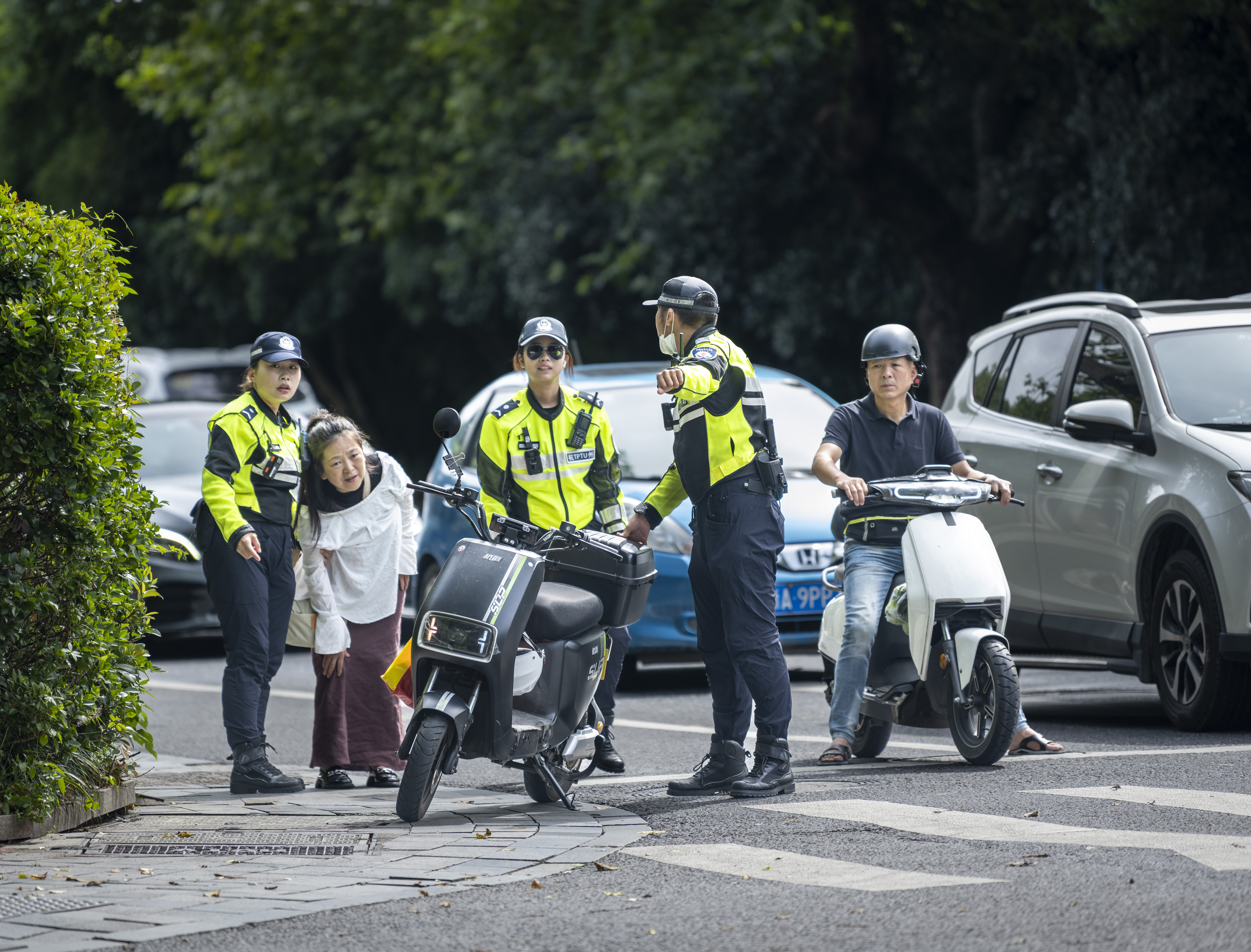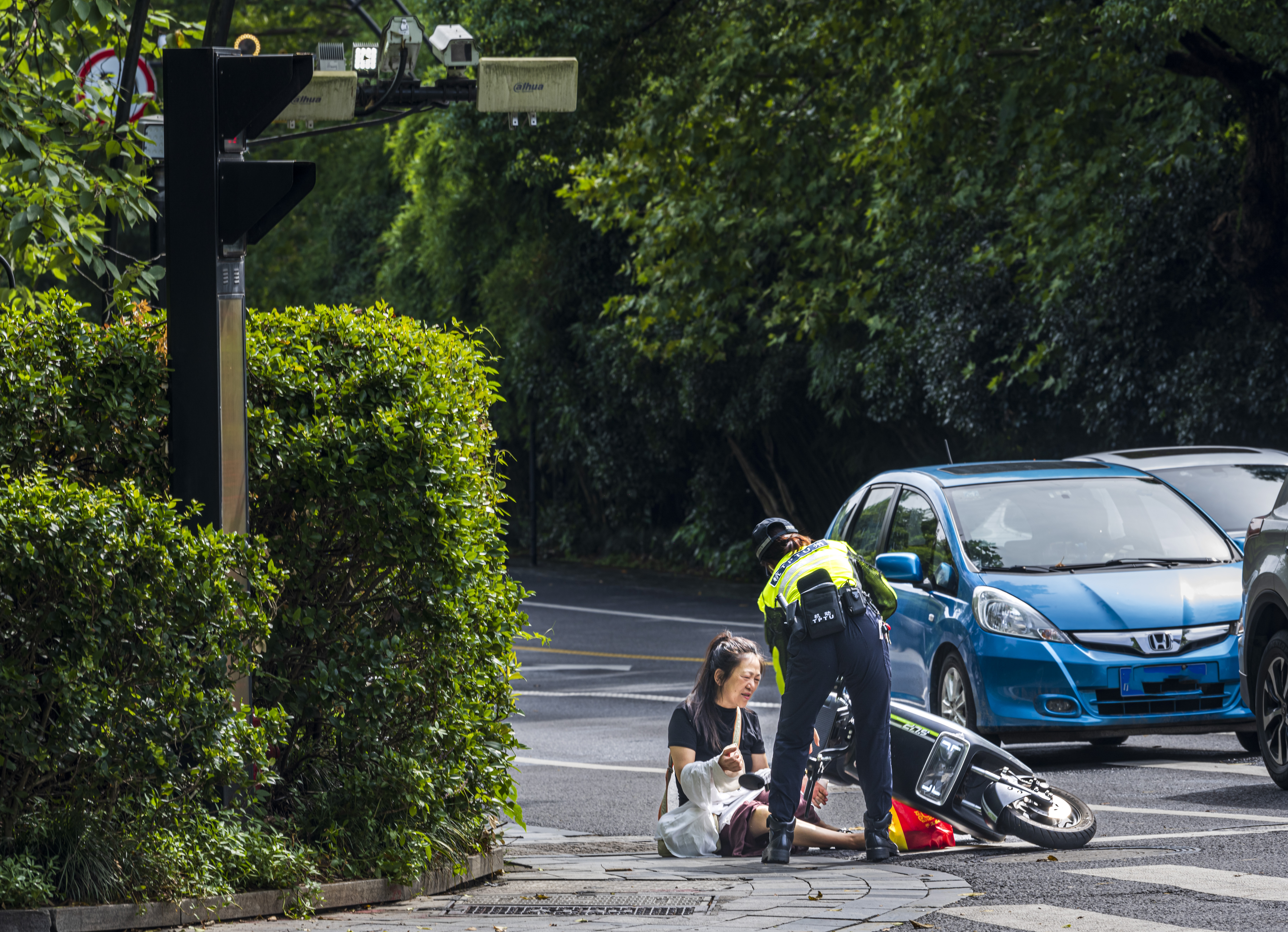 给警察点赞 今天早上9:42,南山路玉皇山路口,一位大姐骑电瓶车摔倒了,这位大姐一脸痛苦的表情,车子压在身上。正在对面值岗的辅警看到了第一时间跑过去,扶起压着腿的电瓶车。还有两位警官马上一起过来,扶起这位大姐,等她缓和过来,还好没什么大碍。 我刚好拍照路过在这儿,记录下这场景。我为三位热心的警察点赞!