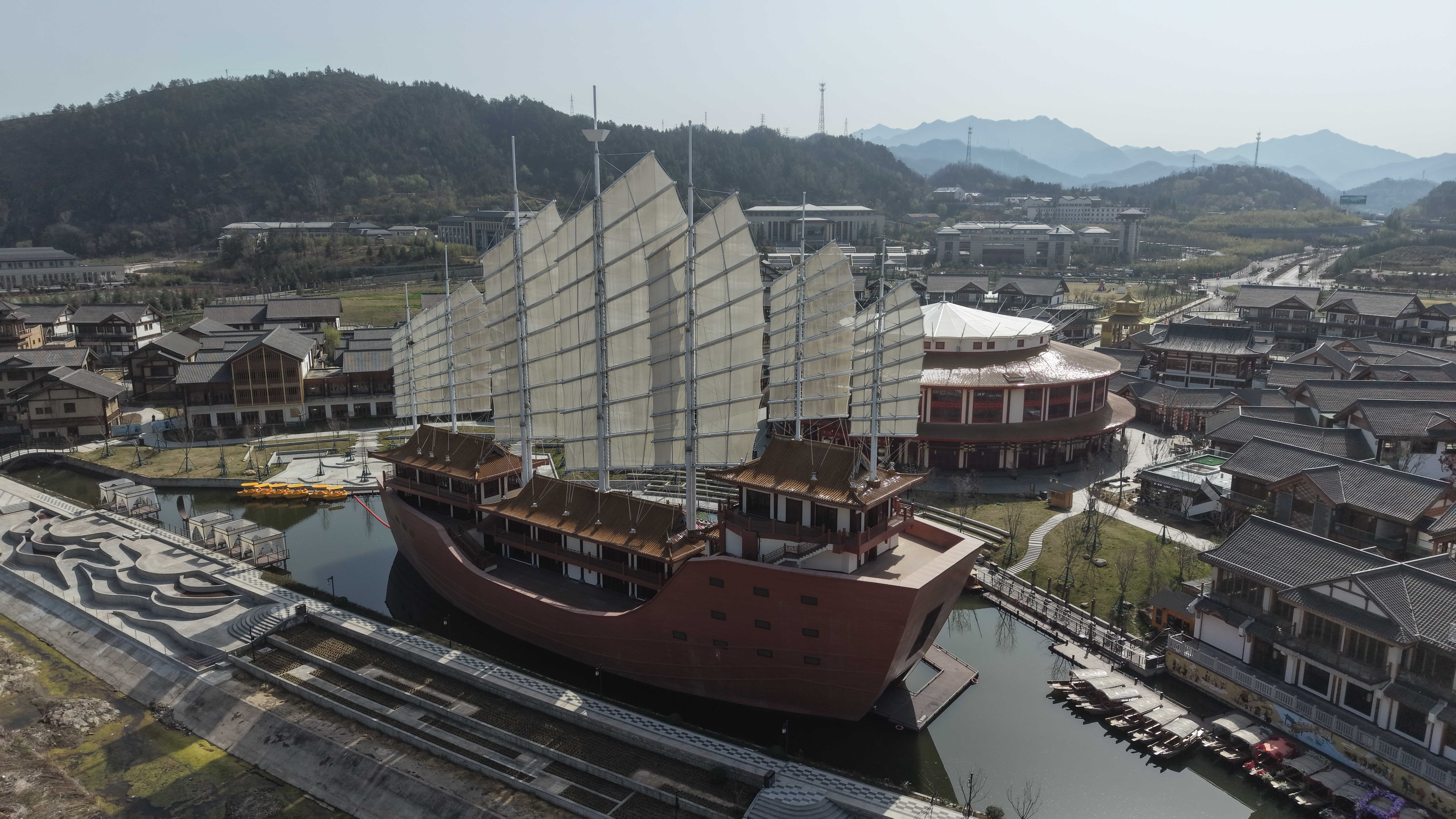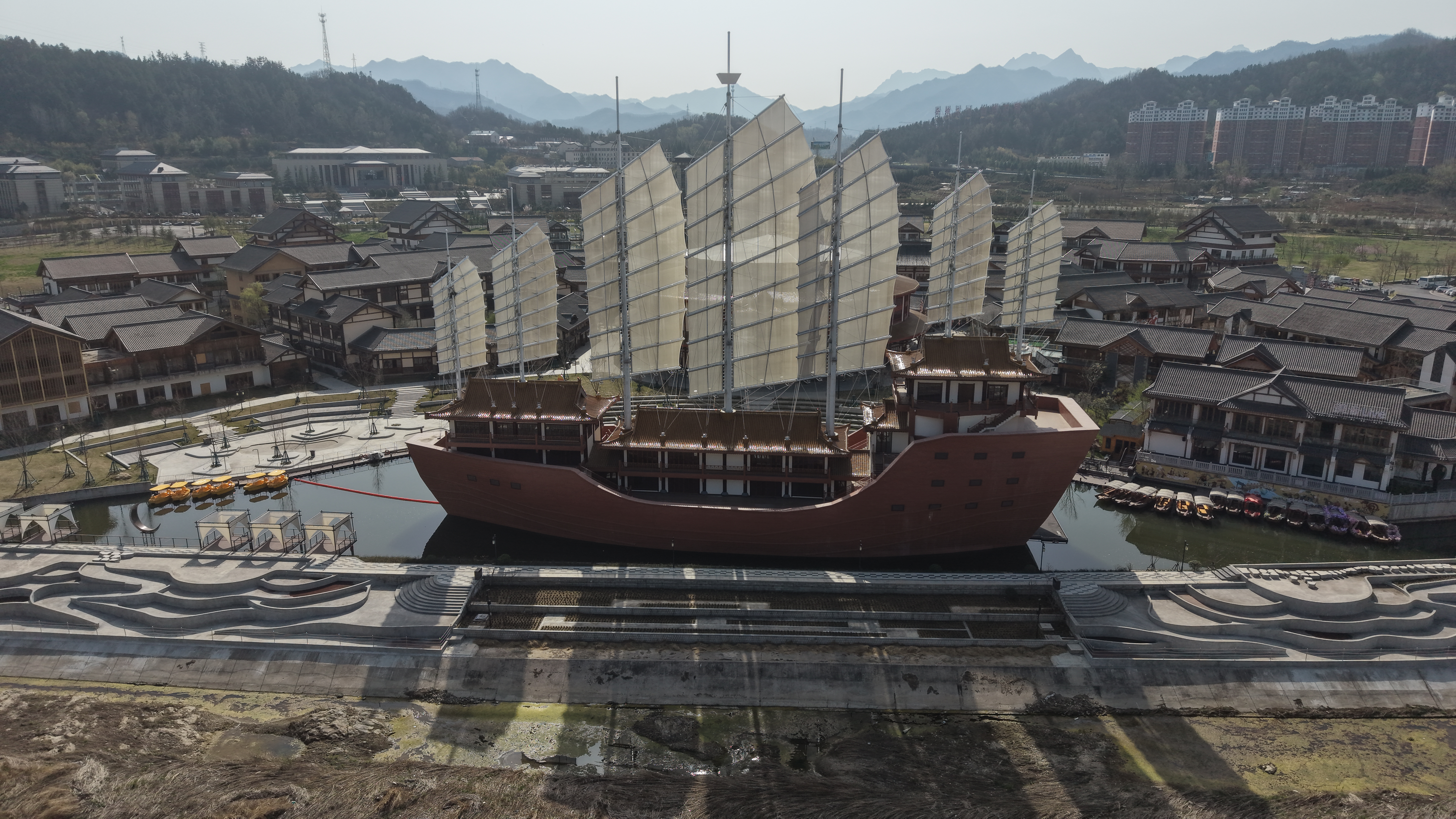 河南省鸾州渡伊水河畔的“大帆船”地标,造型壮观,是小镇标志性打卡点。白日映碧水,夜晚披华灯,承载扬帆起航的美好寓意。
