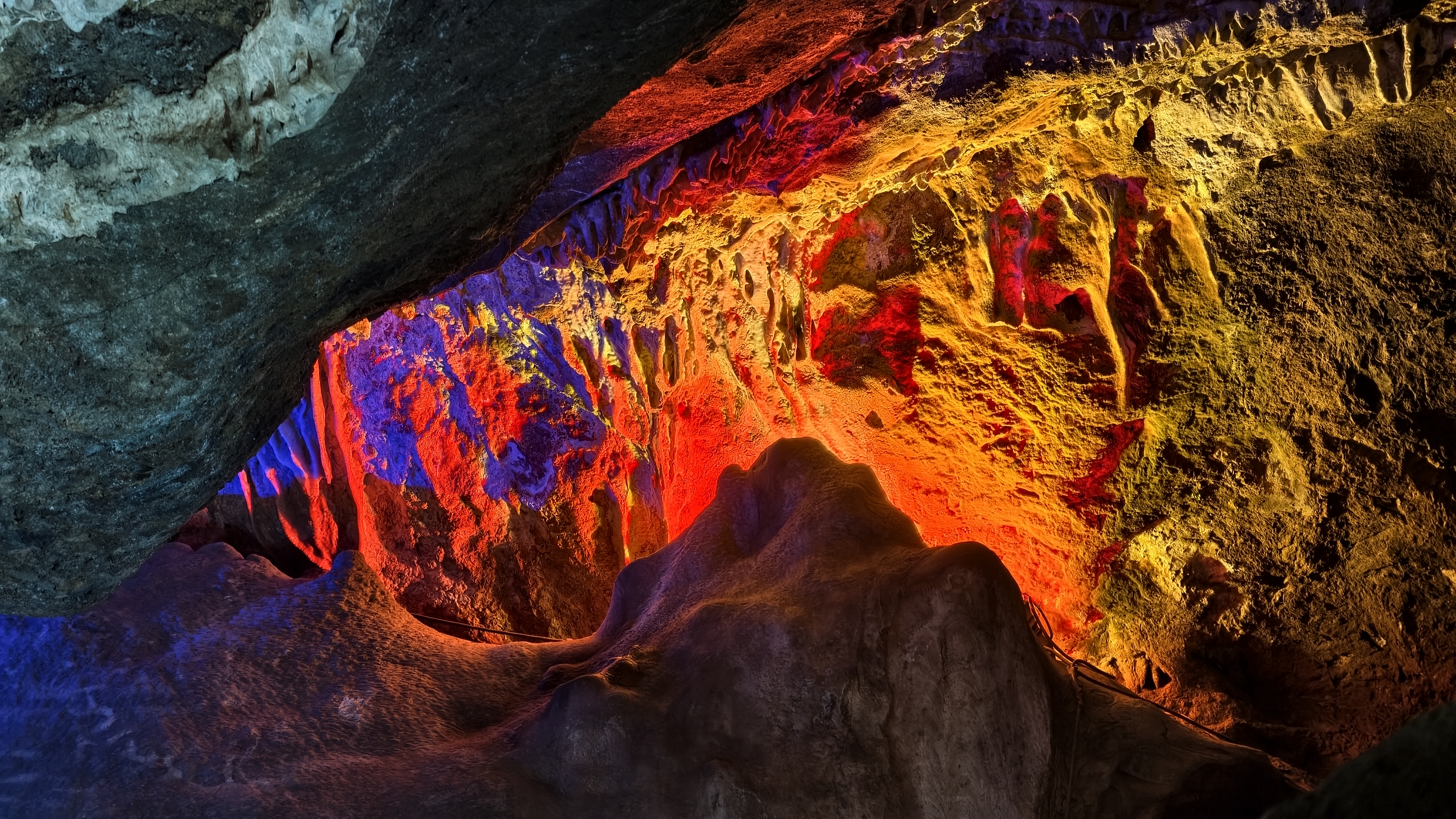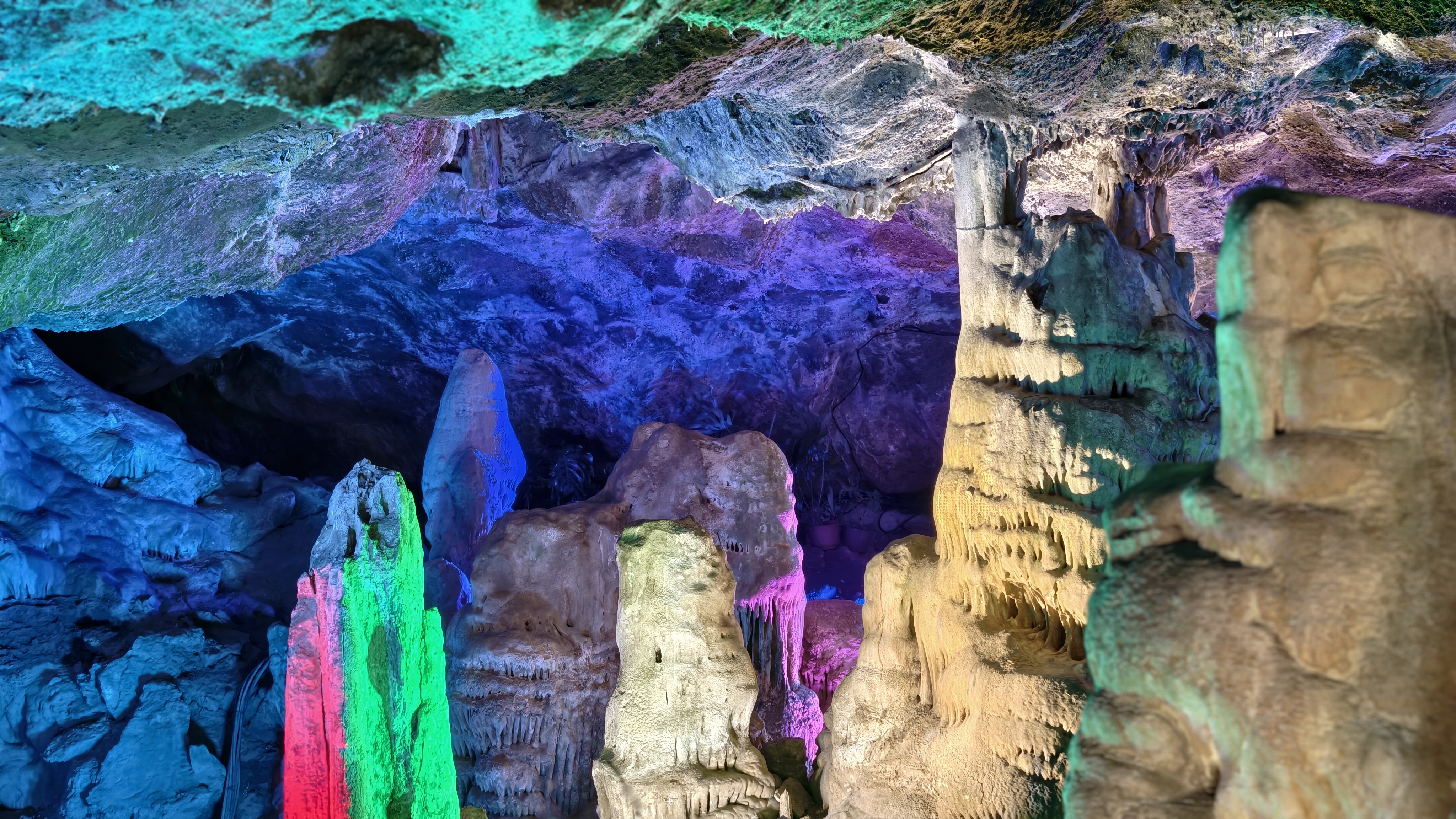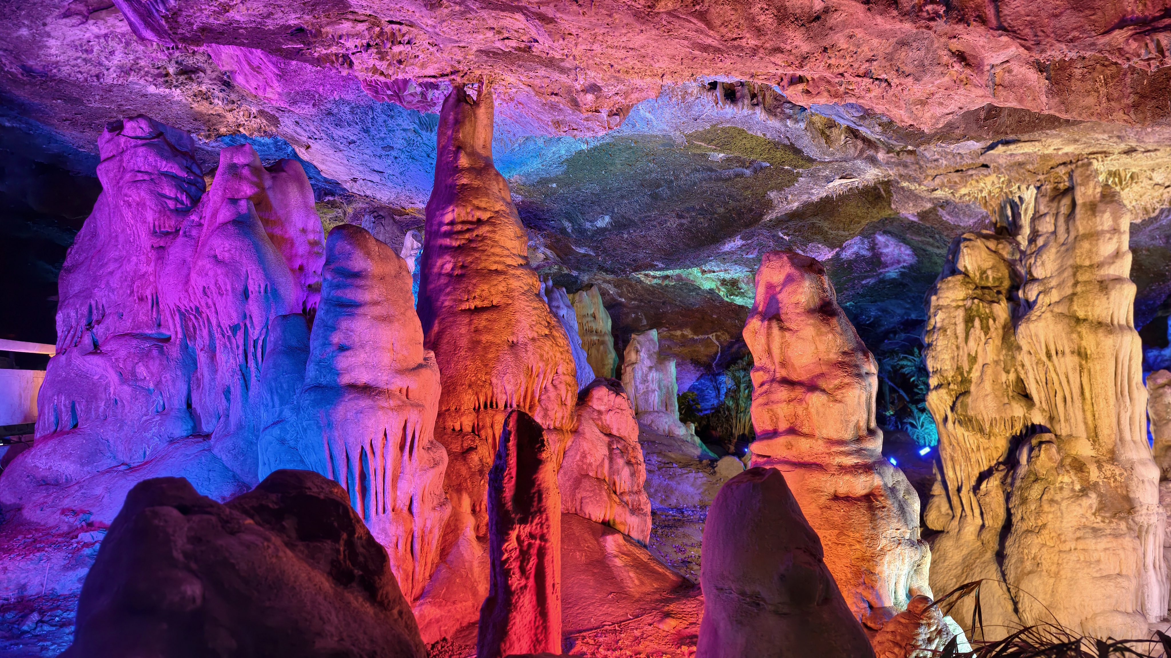 游栾川鸡冠洞,钟乳石林立,彩灯映照下,红、蓝、紫色交织,石笋、石幔奇幻瑰丽。 vivo X300 Pro弱光表现出色,精准还原斑斓色彩,暗部细节丰富。