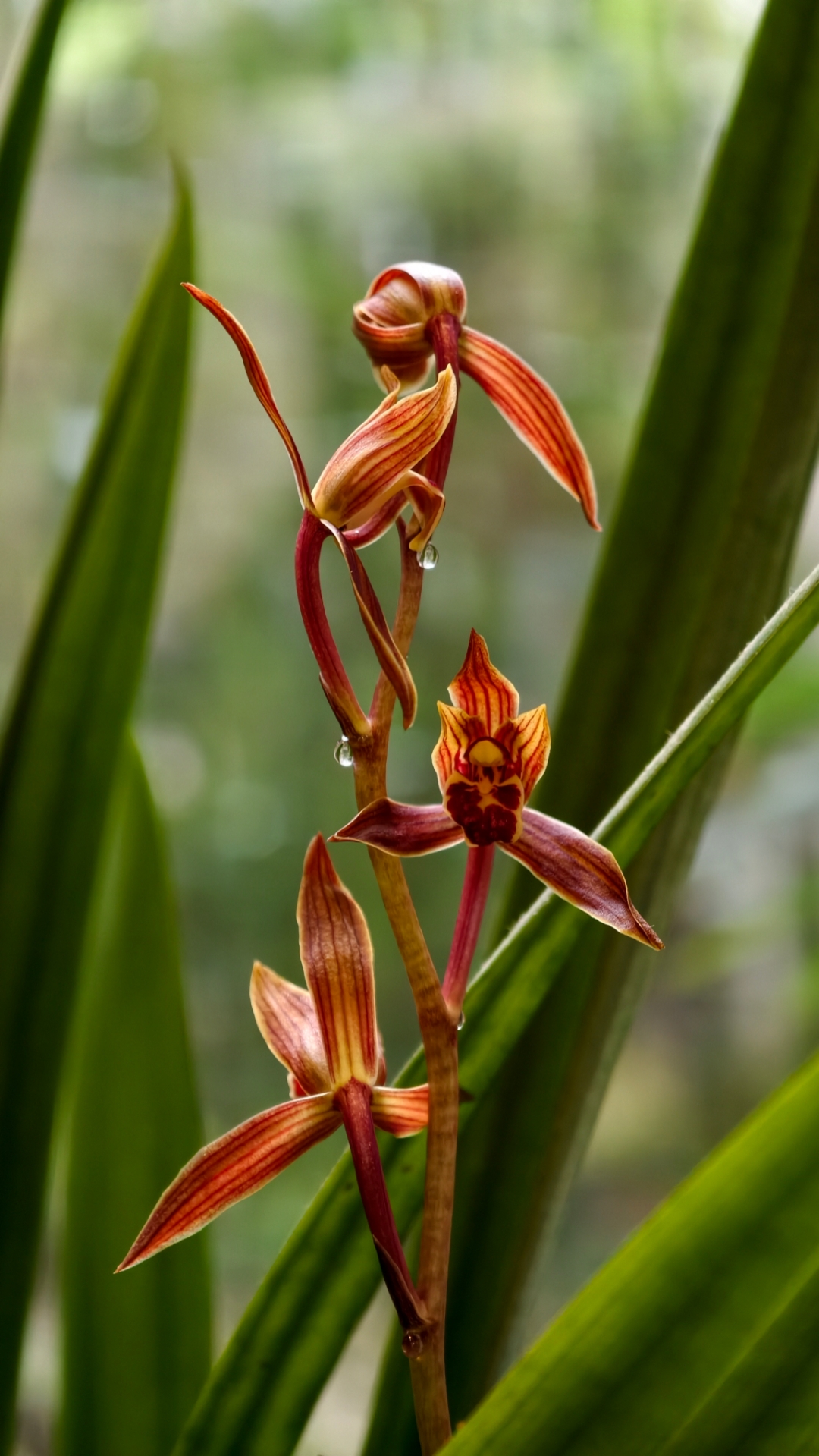 幽兰绽红瓣,条纹映黄蕊,凝露垂翠叶间,清雅脱俗。