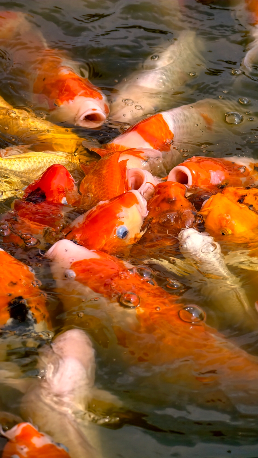 锦鲤竞逐水面,红橙白金鳞光潋滟。口张似祈春福,水纹漾暖,气泡轻浮,生机满池,祥瑞随波,映得春水也温柔。