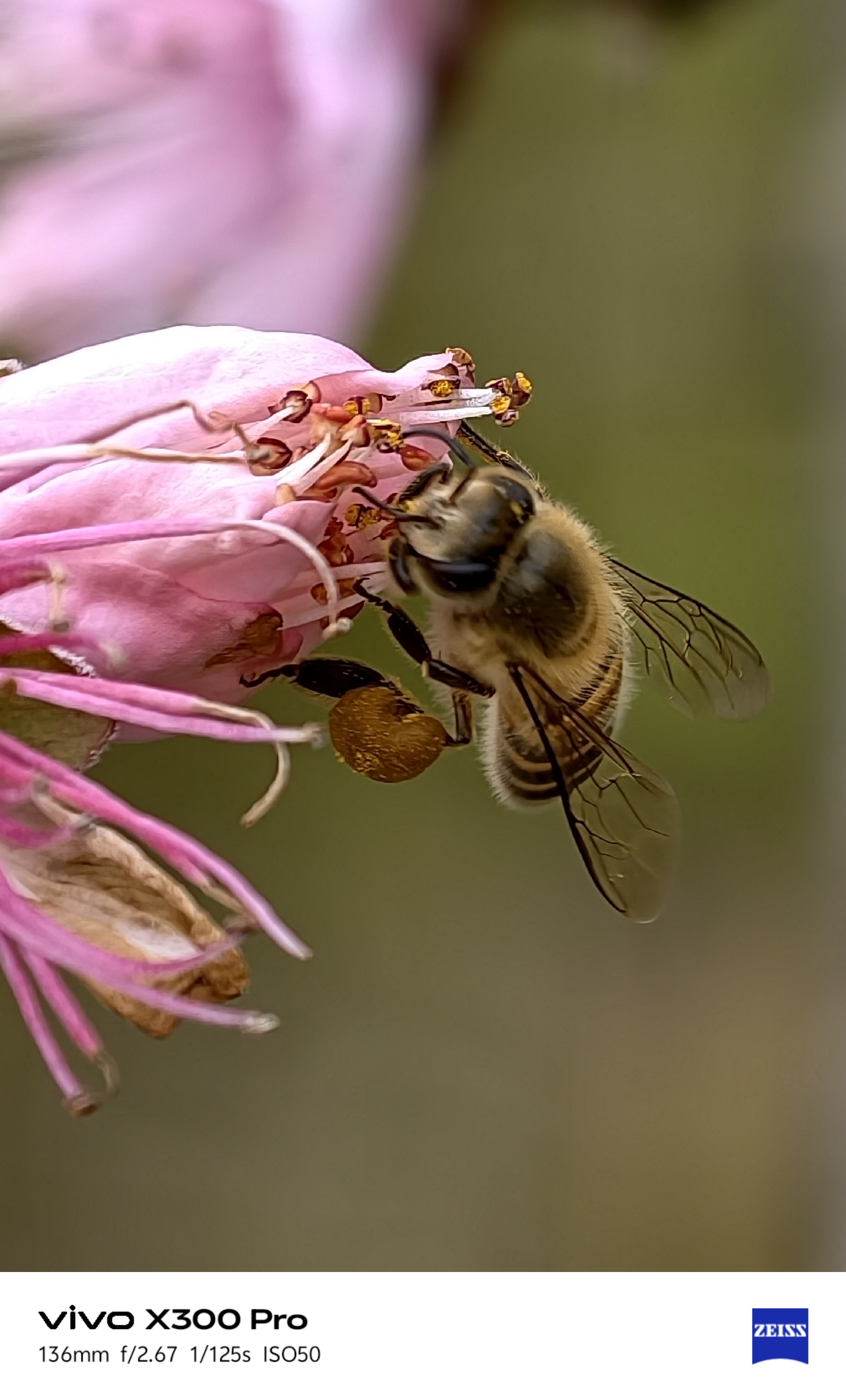 vivo X300 Pro 微距镜头下,蜜蜂🐝携花粉振翅于粉花之上,花粉囊饱满,背景虚化,ZEISS光学还原自然生机。