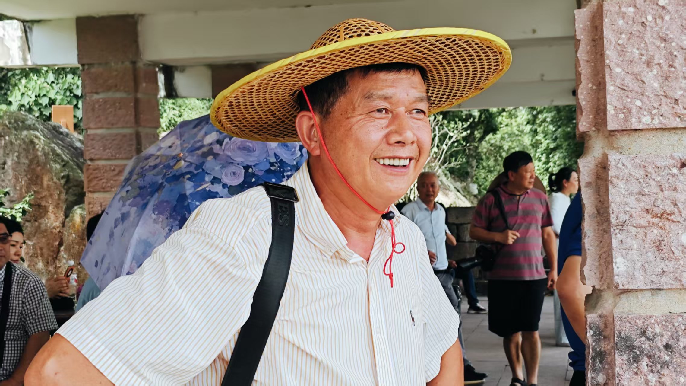 一张难忘的照片 《草帽下的晴朗》 马宜奋 这是一张洋溢着阳光与善意的照片。画面中的大叔头戴一顶宽边草帽,红绳系颔,笑得爽朗而真挚,眼角的皱纹里盛着岁月的故事,也盛着此刻的满足。他身着素净的条纹衬衫,肩头背着行囊,显然是一位行走在路上的旅人。背景里,青石廊柱、绿植掩映,还有其他游客或驻足或休憩,一派闲适的景区日常。这笑容没有设防,像夏日里一阵穿堂风,让人不自觉地跟着嘴角上扬——原来旅途最美的风景,从不是名山大川,而是人脸上这份纯粹的、不设防的快乐。