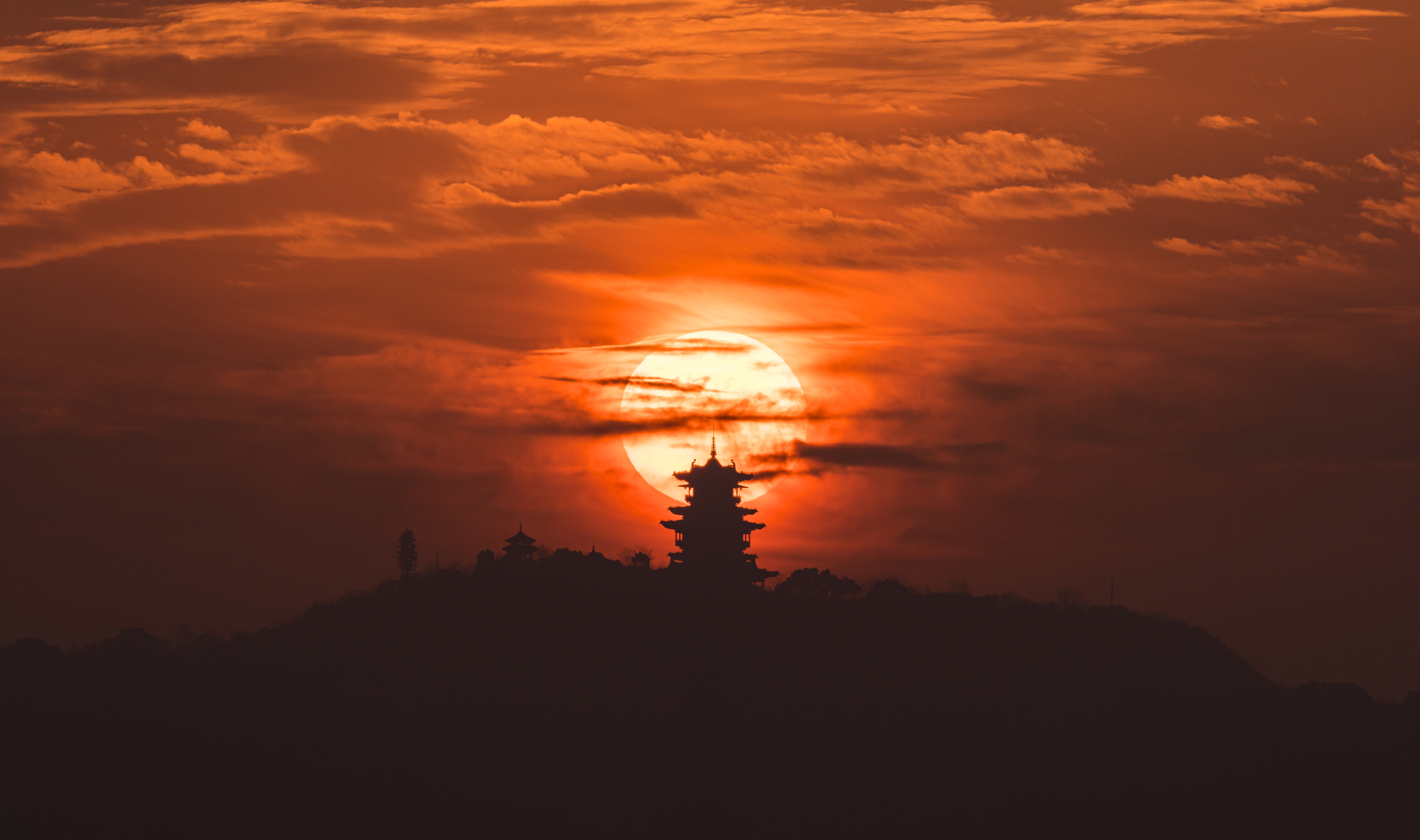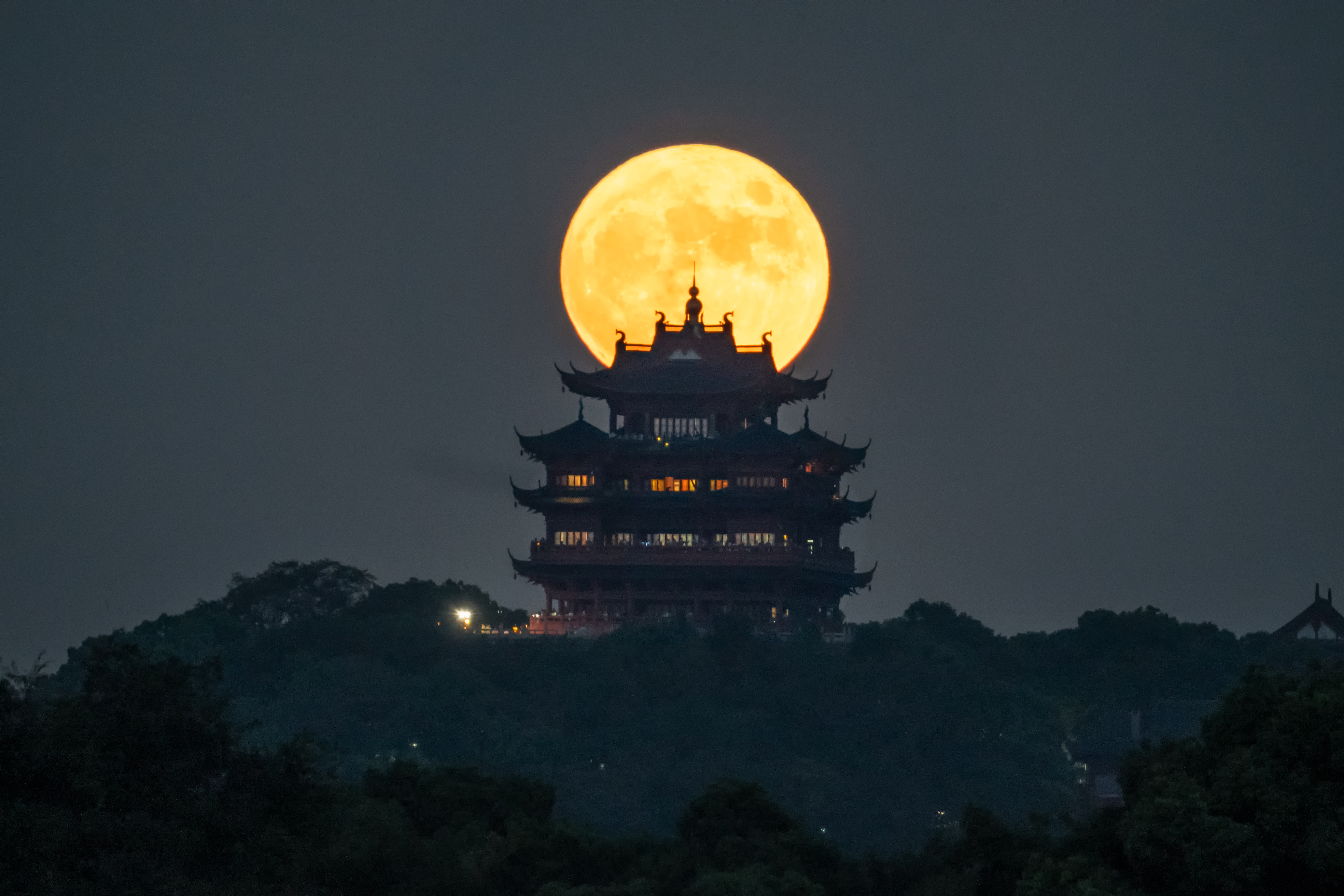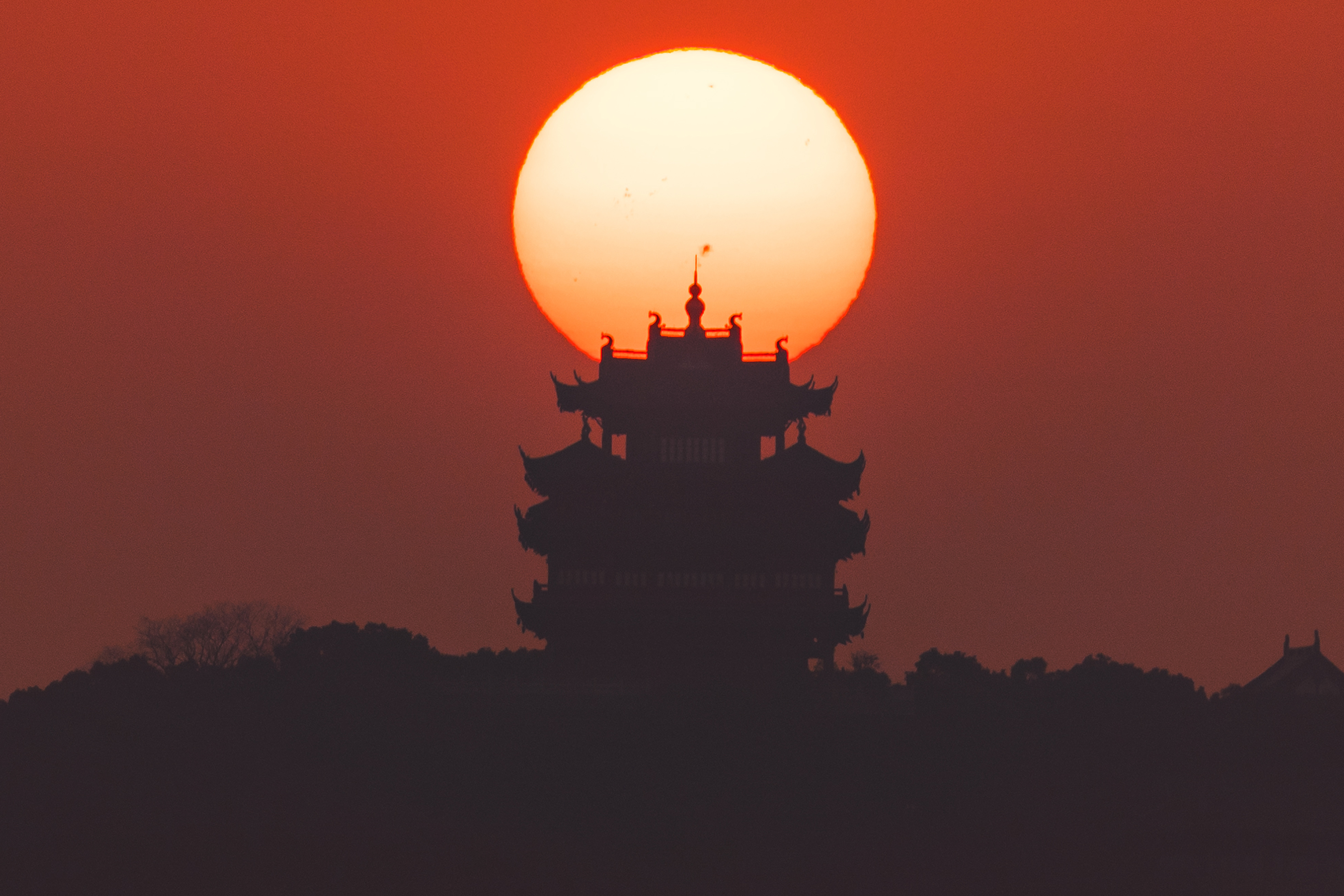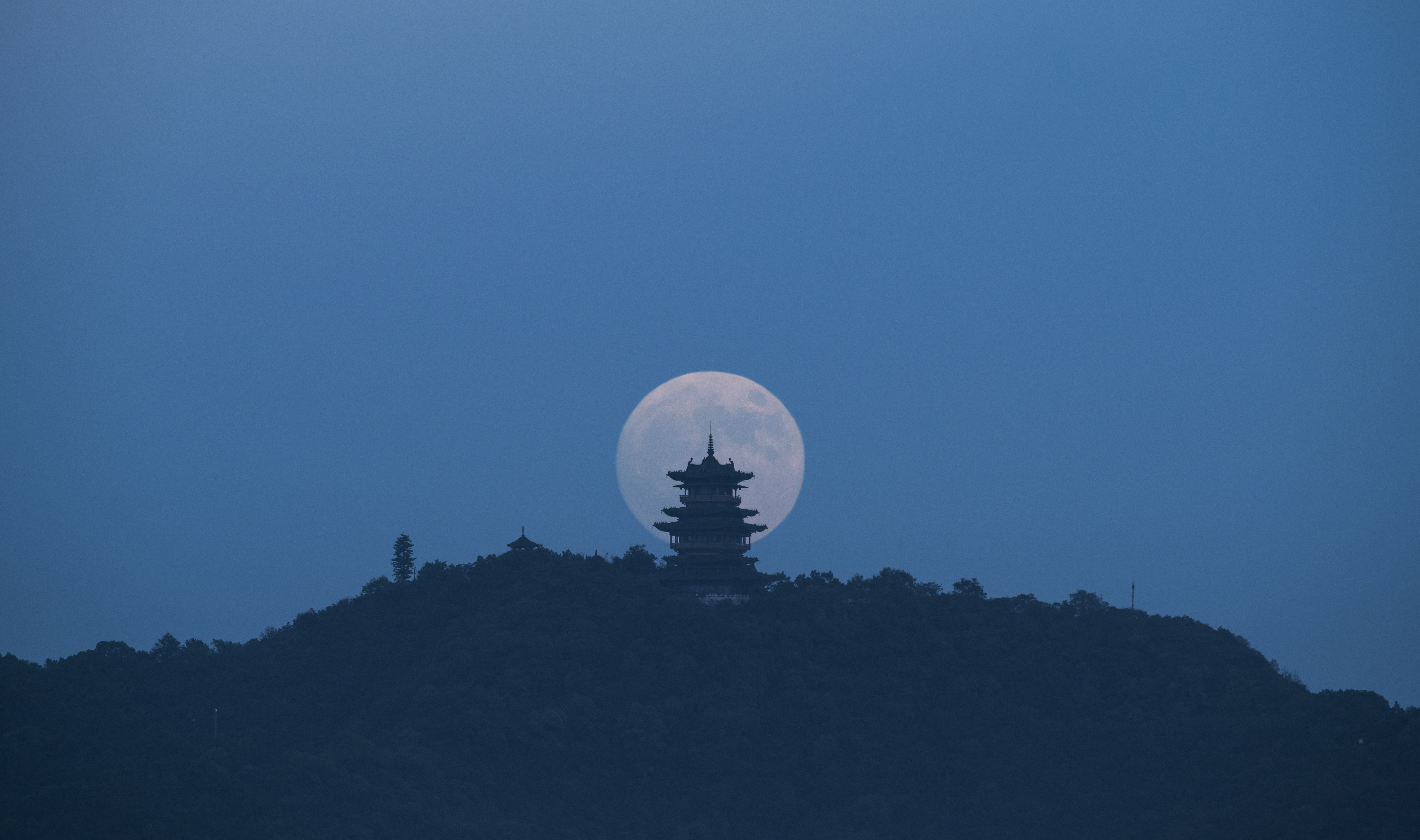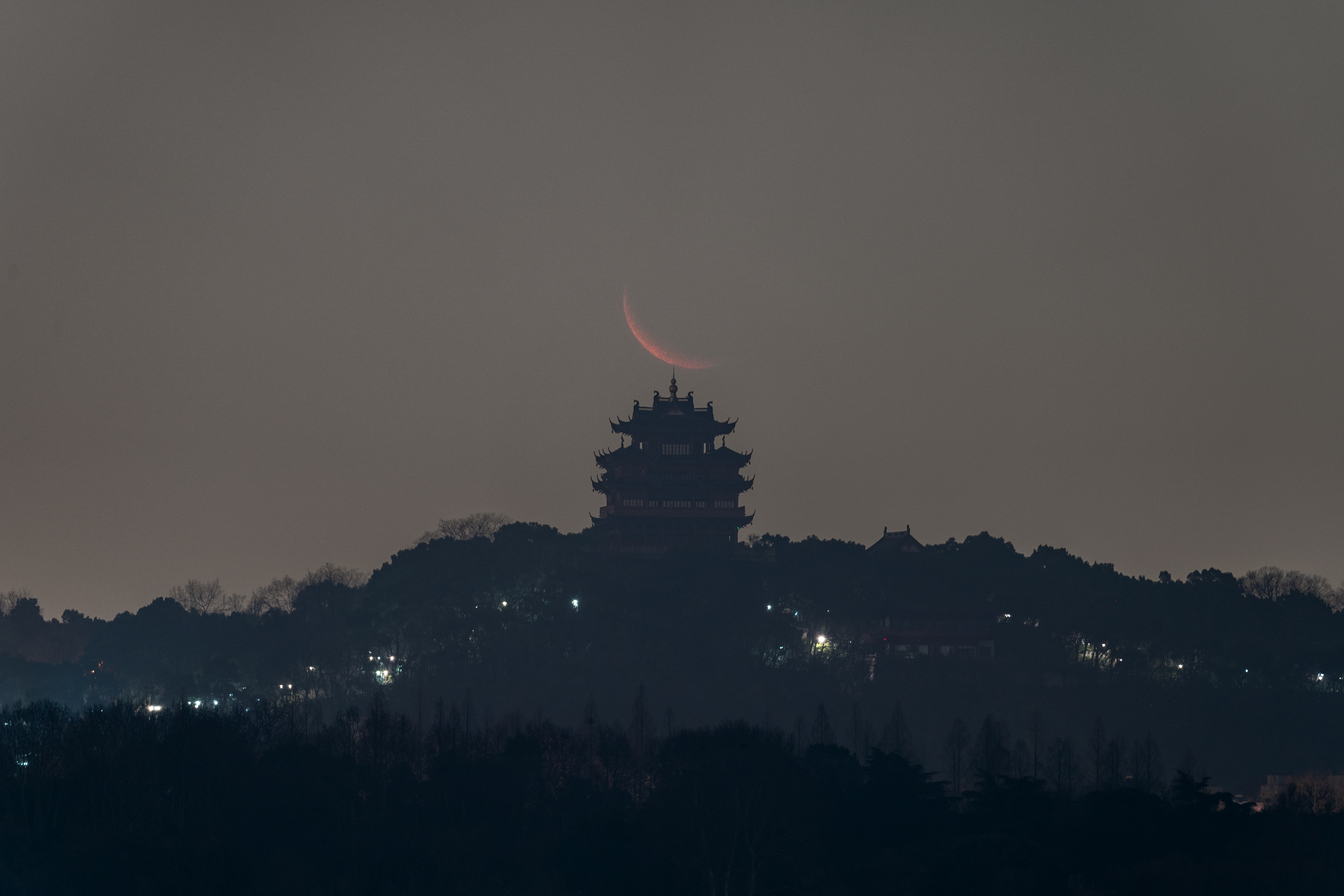 《日月同辉》 作者:朱露翔 拍摄地点:杭州半山望宸阁 科学计算软件预测机位,并真实拍摄的杭州半山望宸阁悬日与悬月。