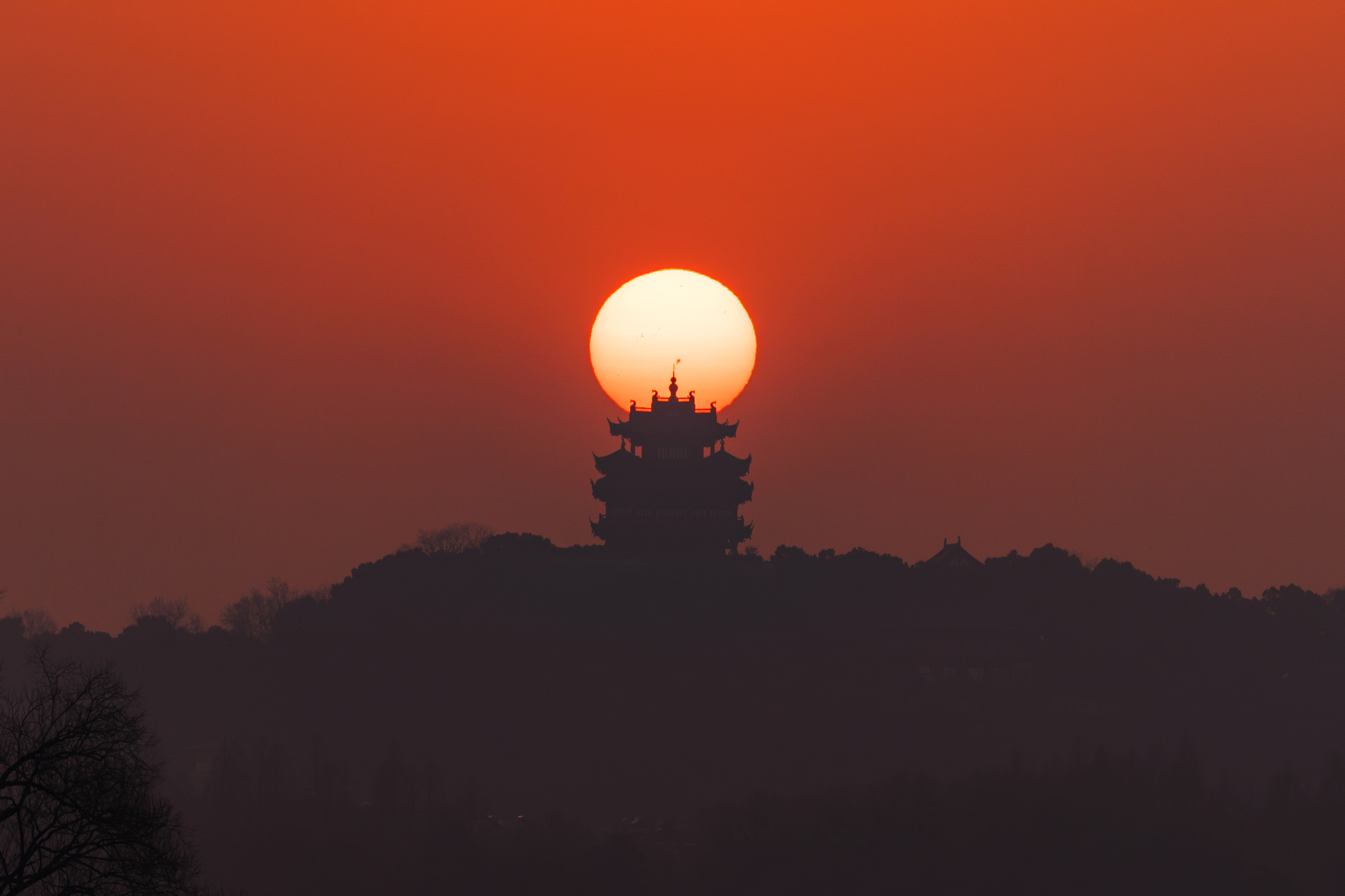 《日月同辉》 作者:朱露翔 拍摄地点:杭州西湖 在同一天,真实拍摄杭州城隍阁的悬月和悬日