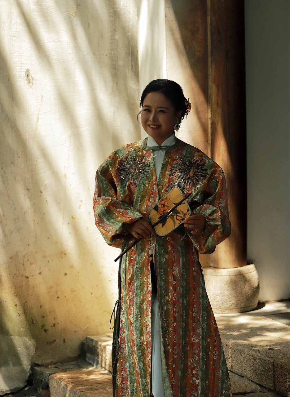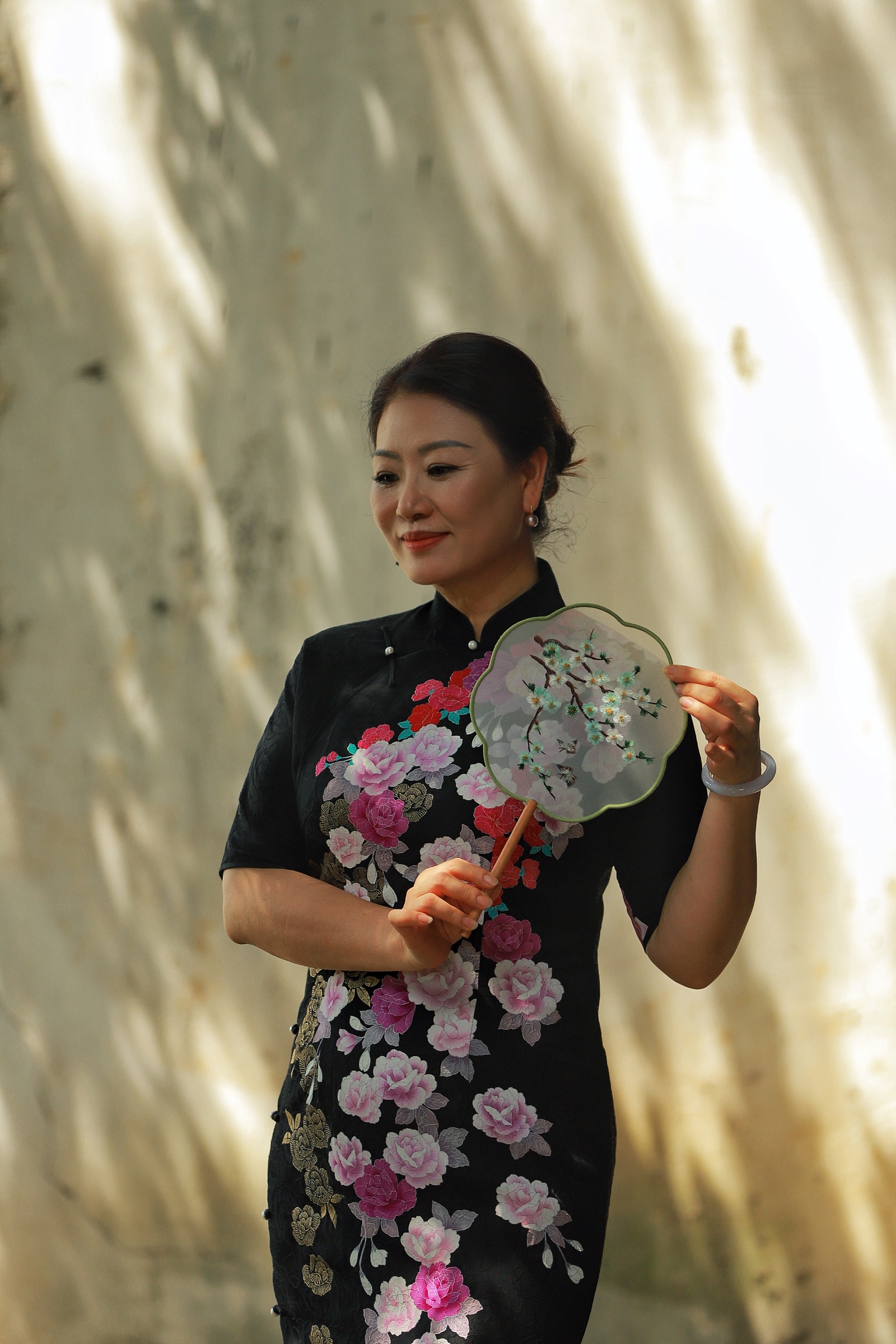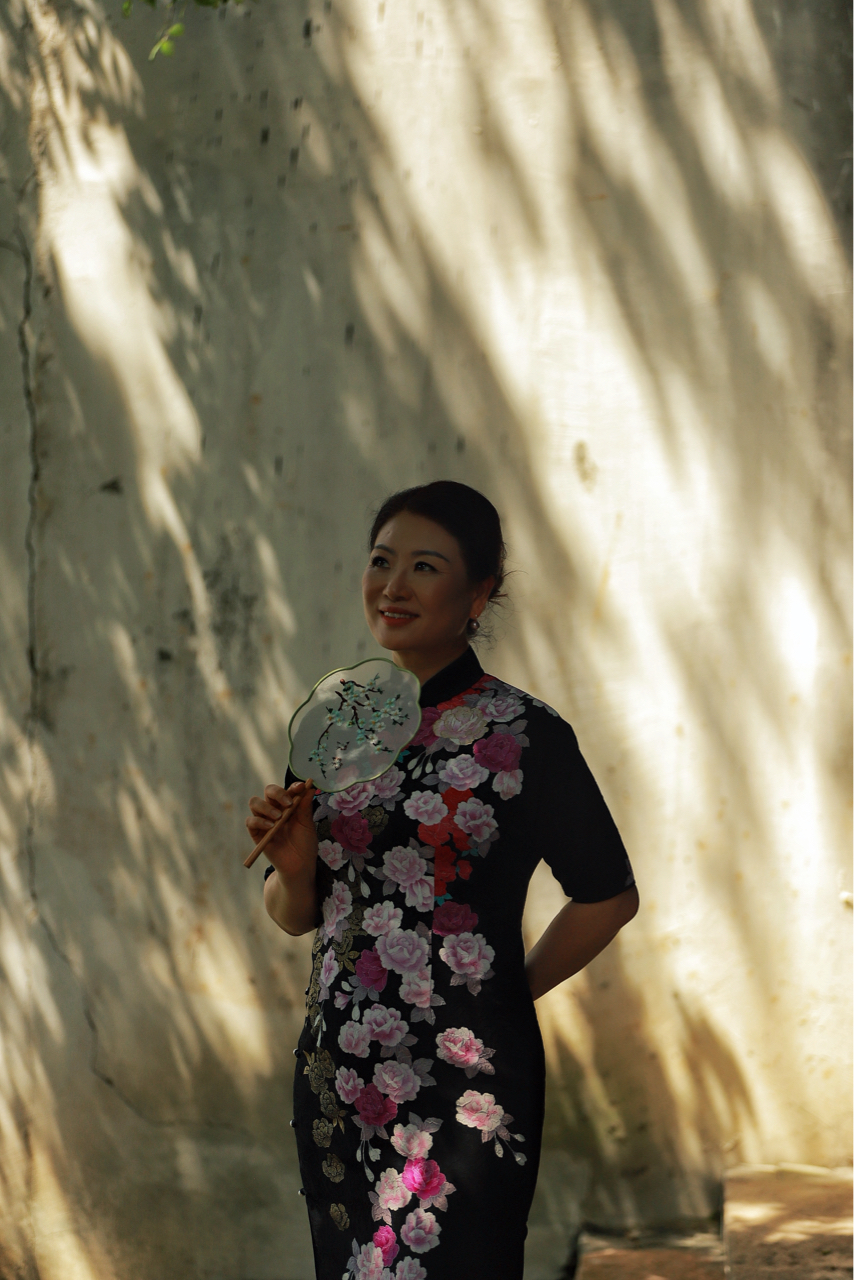 阳光斑驳照庭院,汉服旗袍展古韵,团扇轻摇映花容,中式美学入镜中。